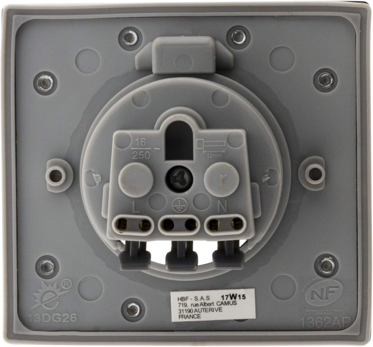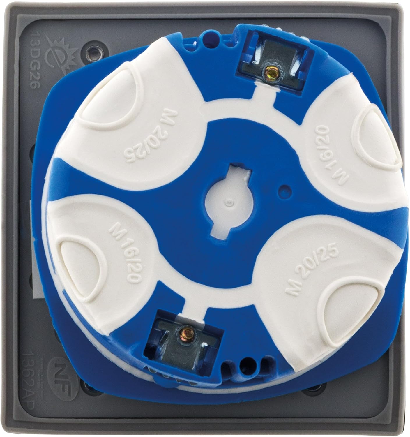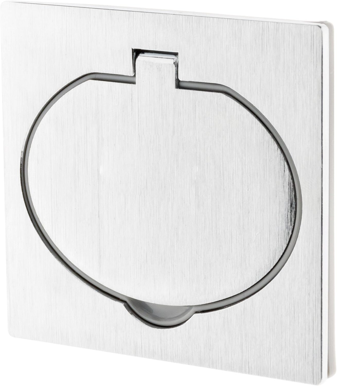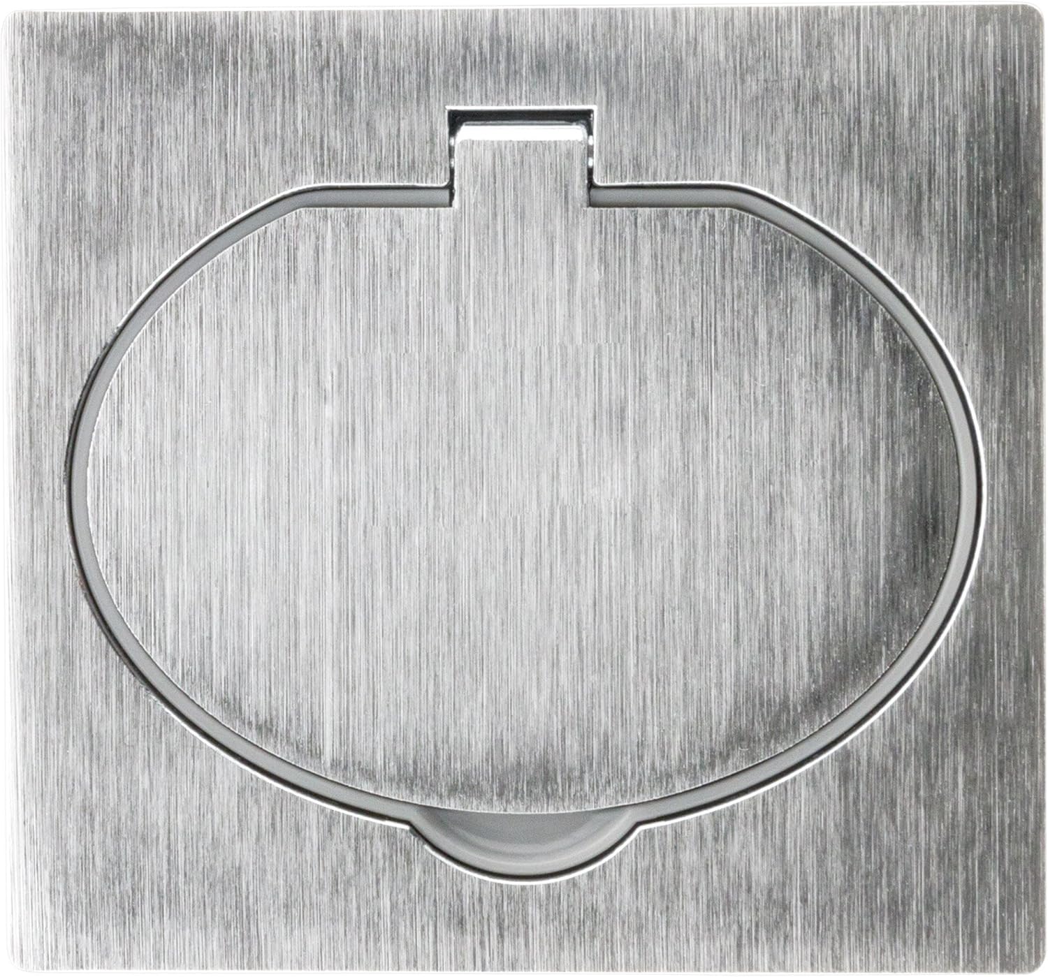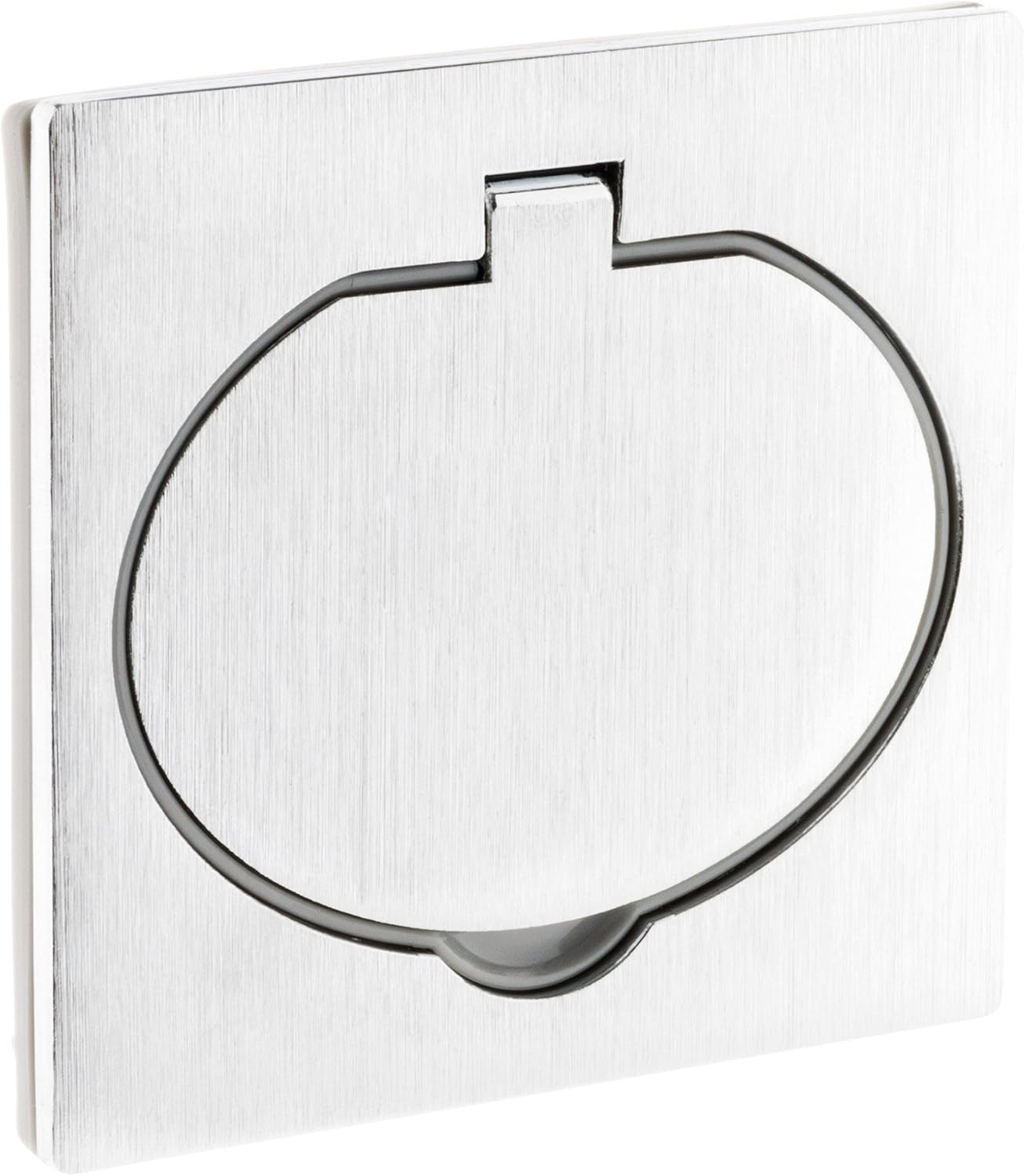 Priză de pardoseală 2P+T 16A cu terminale automate, IP44. Ideală pentru pardoseli, pereți și blaturi de bucătărie, birou, living, garaj sau atelier. Finisaj din aluminiu periat cu capac de protecție (deschidere la 90°). Putere maximă: 3680 W la 230 V. Montare cu șuruburi într-o doză încastrată (șuruburi și doză incluse). Dimensiuni capac: 86 x 80 mm. Inel de etanșare inclus. Furnizat cu o doză încastrată multimaterial, fără aer, Ø 67 mm – adâncime 50 mm. Schemă de instalare prezentată sub doză.