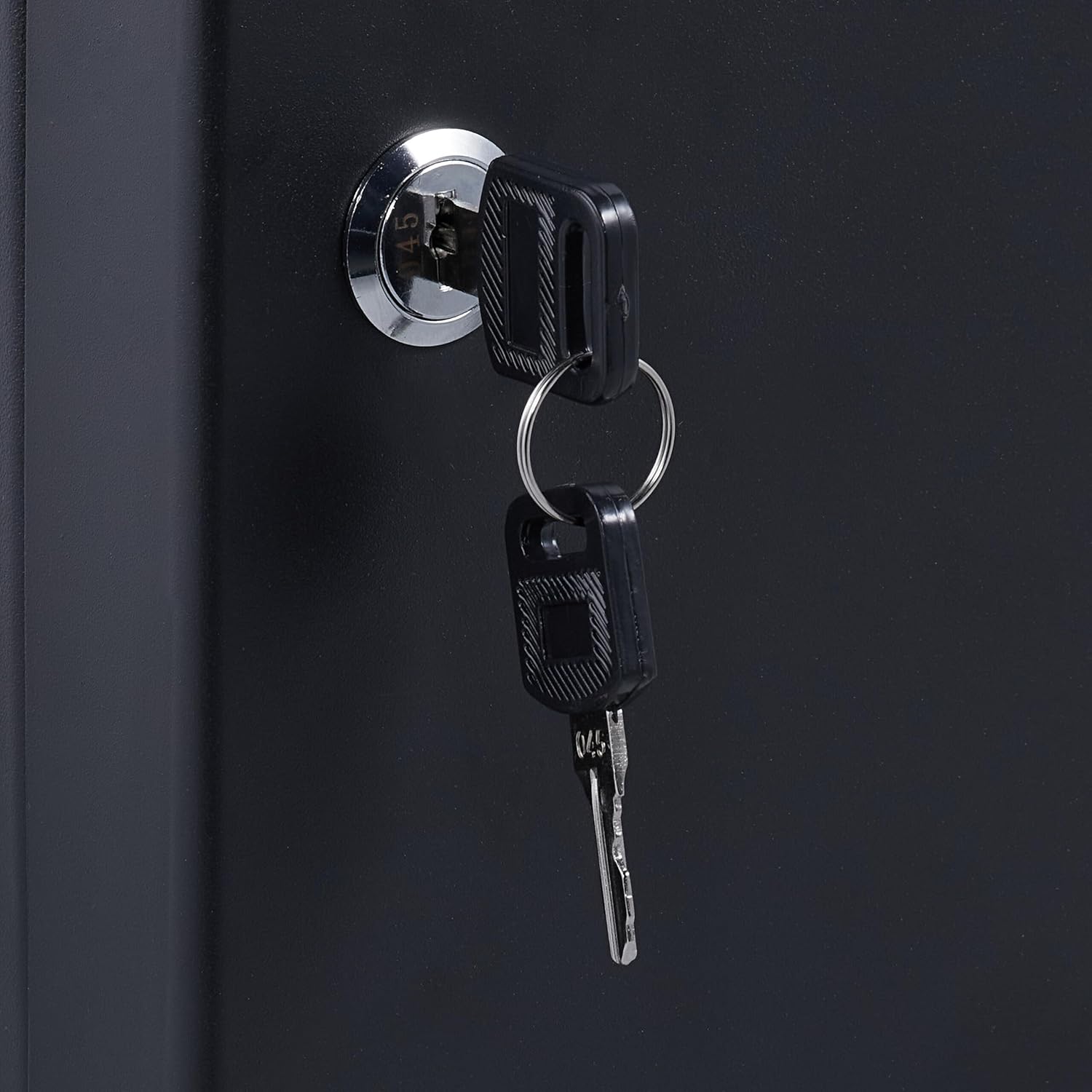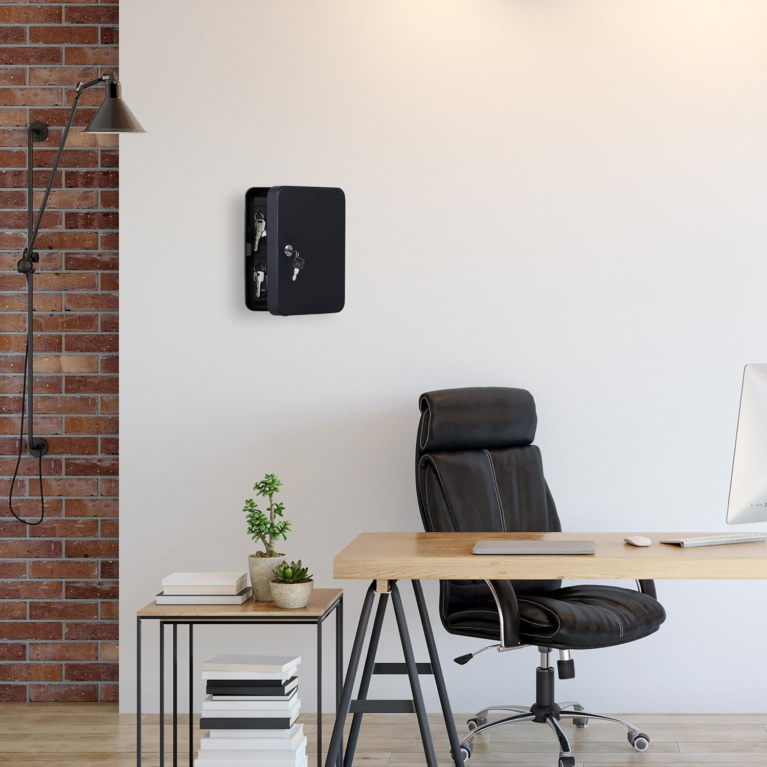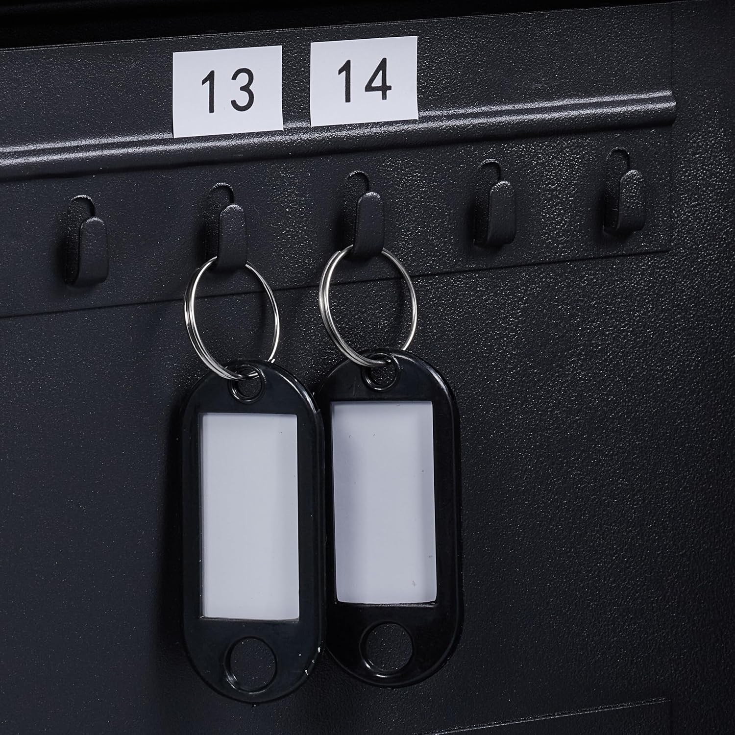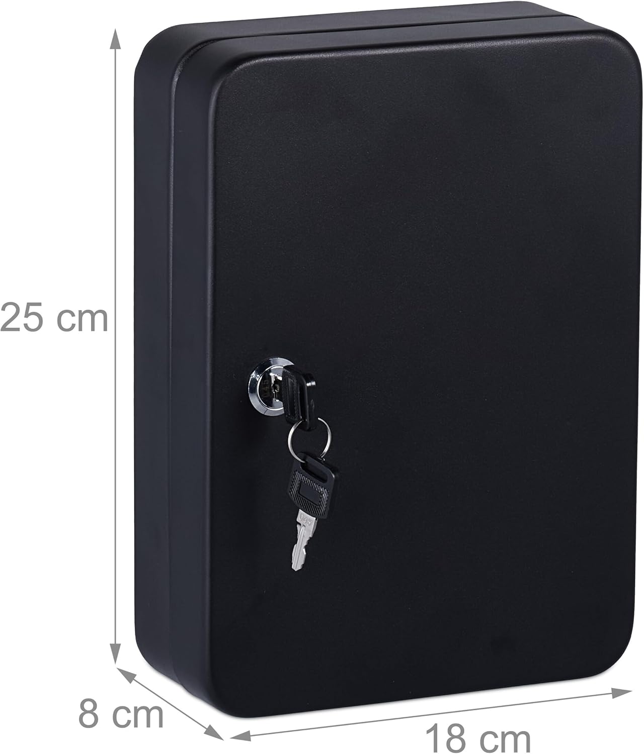 Despre acest articol: Organizator: Dulap de chei cu benzi de cârlige, autocolante pentru numerotare și 48 de brelocuri. Detalii: Seif de chei cu 48 de cârlige pe 8 benzi - H x L x A: aprox. 25 x 18 x 8 cm - În negru mat. Securitate: Cutie de chei cu încuietoare și două chei - Pentru păstrarea și organizarea în siguranță. Stabil: Cutie de chei din fier robust cu găuri pentru montare pe perete - Include șuruburi și dibluri. Utilizare: Seif de chei ca o achiziție utilă pentru birou, garaj, atelier sau acasă.