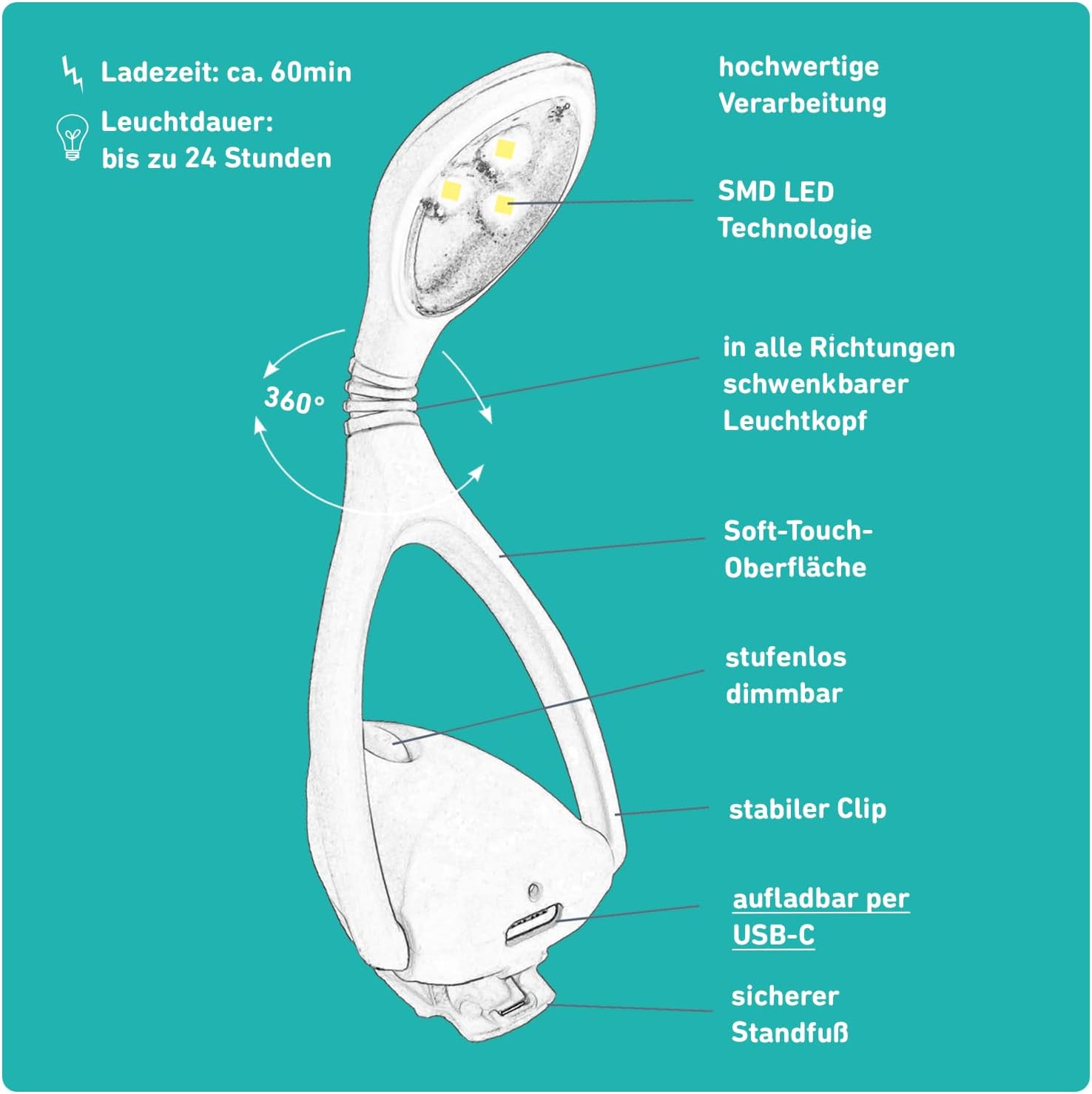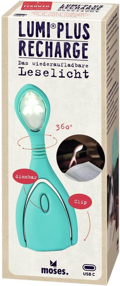 Lampă de citit Moses Fernlust Lumi Plus Recharge turcoaz – Bestseller acum și în versiunea reîncărcabilă. Lampa de citit Lumi Plus Recharge în culoarea turcoaz la modă de la Moses Publisher este accesoriul perfect pentru toți iubitorii de cărți. Datorită bateriei incluse, lampa de citit poate fi acum încărcată și prin USB-C (fără funcție de încărcare rapidă). Cablul nu este inclus. După un timp de încărcare de 60 de minute, în funcție de nivelul de reglare, puteți continua să citiți între 7 și 24 de ore. Această lampă de citit luminoasă din gama Fernweh este becul perfect pentru toți nopțitorii și globetrotterii. Aceasta înseamnă că cititul în călătorie noaptea nu mai este o problemă. Cele 3 lumini LED SMD oferă o iluminare direcționată a cărților și nu împiedică vecinii de pat să doarmă. Luminozitatea este reglabilă individual printr-un variator continuu și protejează ochii. Datorită capului de lumină rotativ la 360°, lumina poate fi reglată optim și luminează bine chiar și cărțile groase. Prin urmare, lampa de citit cărți este sursa de lumină wireless perfectă. Totul dintr-o privire: tehnologie LED SMD. Cap de lumină rotativ la 360°. ✓ Clemă robustă, bază sigură. Se livrează într-o cutie cadou. 4,5 cm x 13 cm x 2,3 cm. Reîncărcabilă prin USB-C (cablul de încărcare nu este inclus)