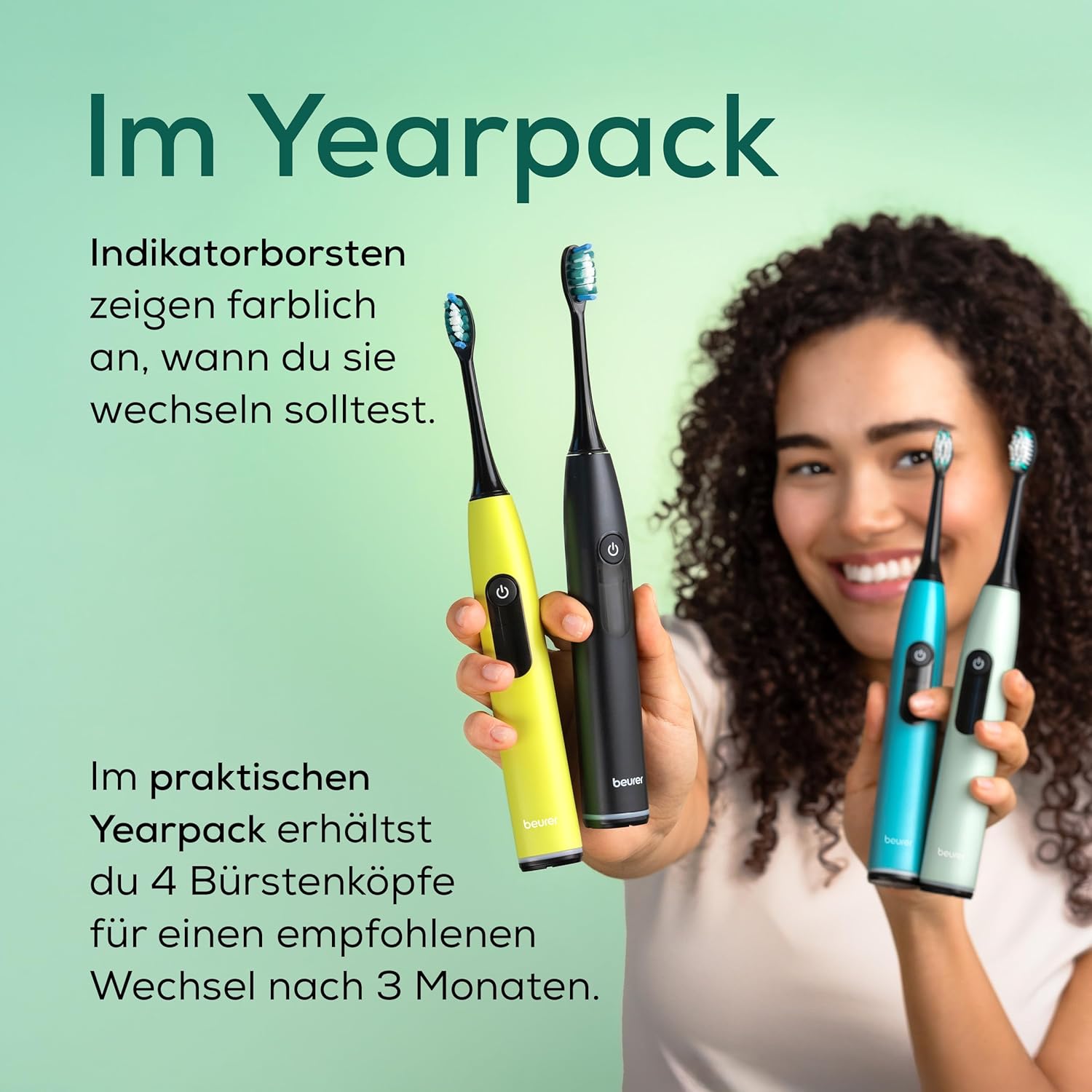 Descriere produs: Periute de dinți de schimb pentru Beurer SC și Philips Sonicare (fără Philips One & Kids), compatibile cu toate modelele, cu peri moi din materiale sustenabile și indicator de schimbare a culorii.