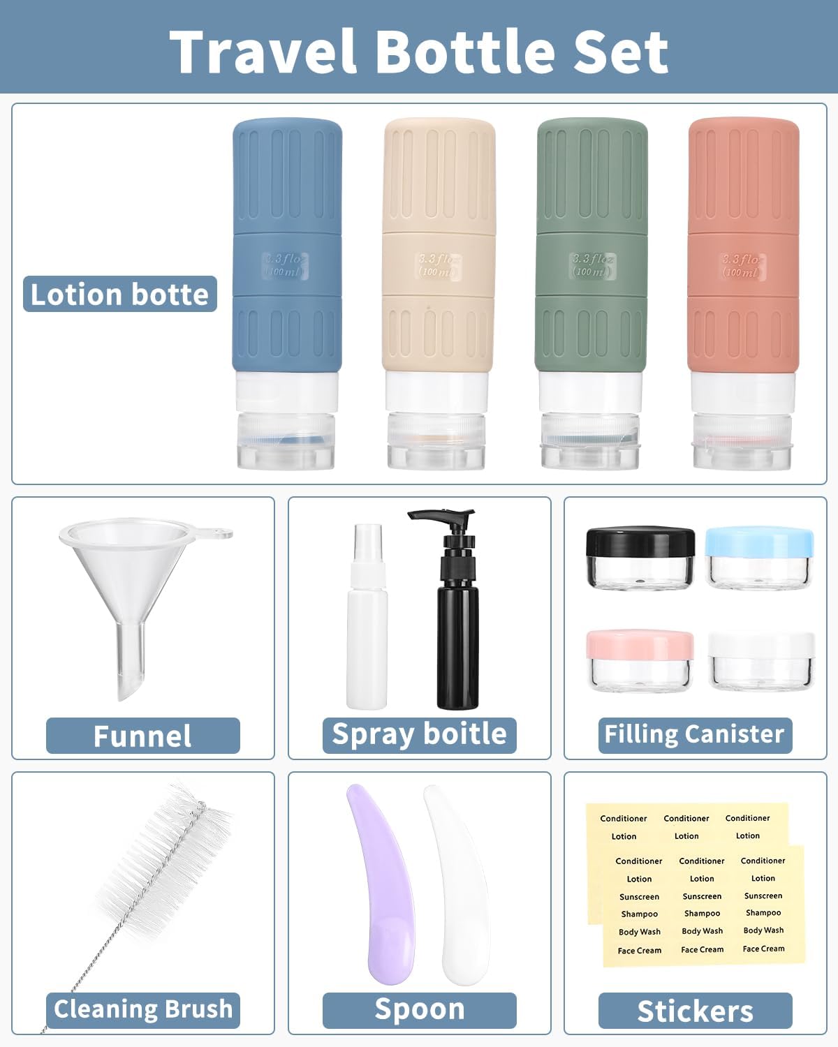 Set complet: 4 sticle din silicon de 100 ml, 4 borcănele pentru cremă (10 g), 2 pulverizatoare, 2 linguri, 1 perie de curățare, 1 pâlnie, 2 foi de etichete și 1 geantă transparentă cu fermoar.