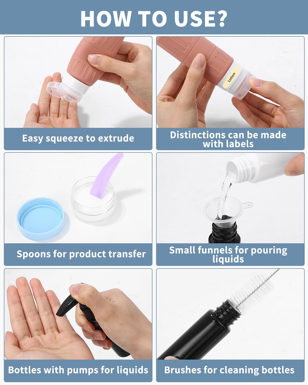Călătorește inteligent și fără griji cu setul de sticle de călătorie din silicon de 16 piese, soluția completă pentru depozitarea în siguranță a produselor tale preferate oriunde mergi.