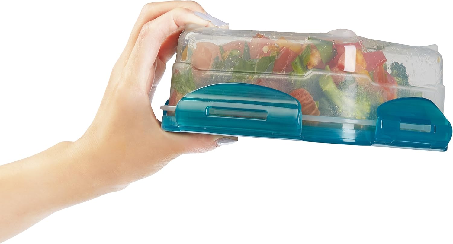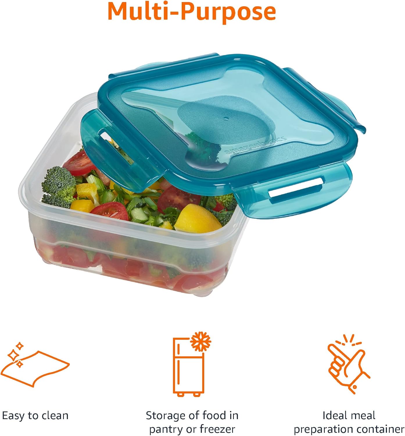 Cutie de depozitare cu mecanism de închidere în 4 puncte și capac din silicon, asigurând etanșare ermetică și impermeabilă. Fabricată din plastic robust, de înaltă calitate, fără BPA, cu un design transparent pentru identificarea ușoară a conținutului. Ideală pentru depozitarea alimentelor în frigider sau cămară, perfectă și pentru a lua mesele la școală sau la serviciu. Se poate stivui și se poate introduce una în alta pentru economie de spațiu. Rezistentă la microunde și lavabilă în mașina de spălat vase (-20 °C până la +110 °C). Dimensiuni interioare: 139mm x 139mm x 57mm, Dimensiuni exterioare: 151mm x 151mm x 57mm.