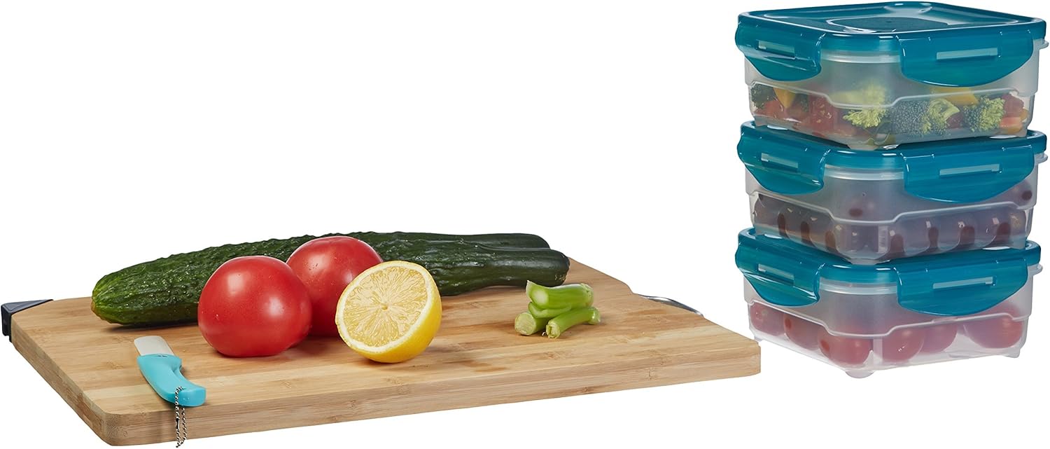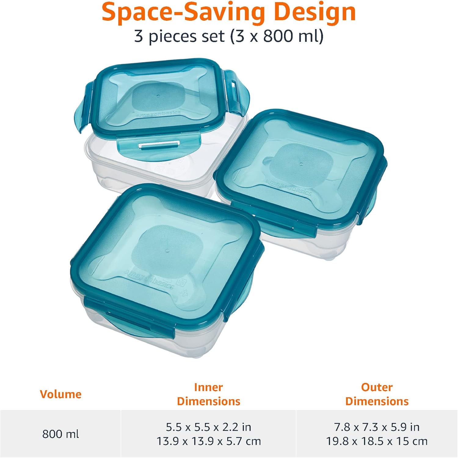 Amazon Basics Set de recipiente pentru congelator, cu capace, etanș, anti-scurgere, stivuibile, pentru frigider/congelator, fără BPA, plastic, rezistent la microunde și mașina de spălat vase, 3 x 0.8 l, incolor