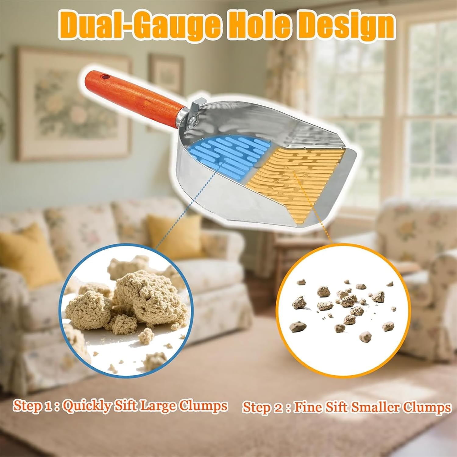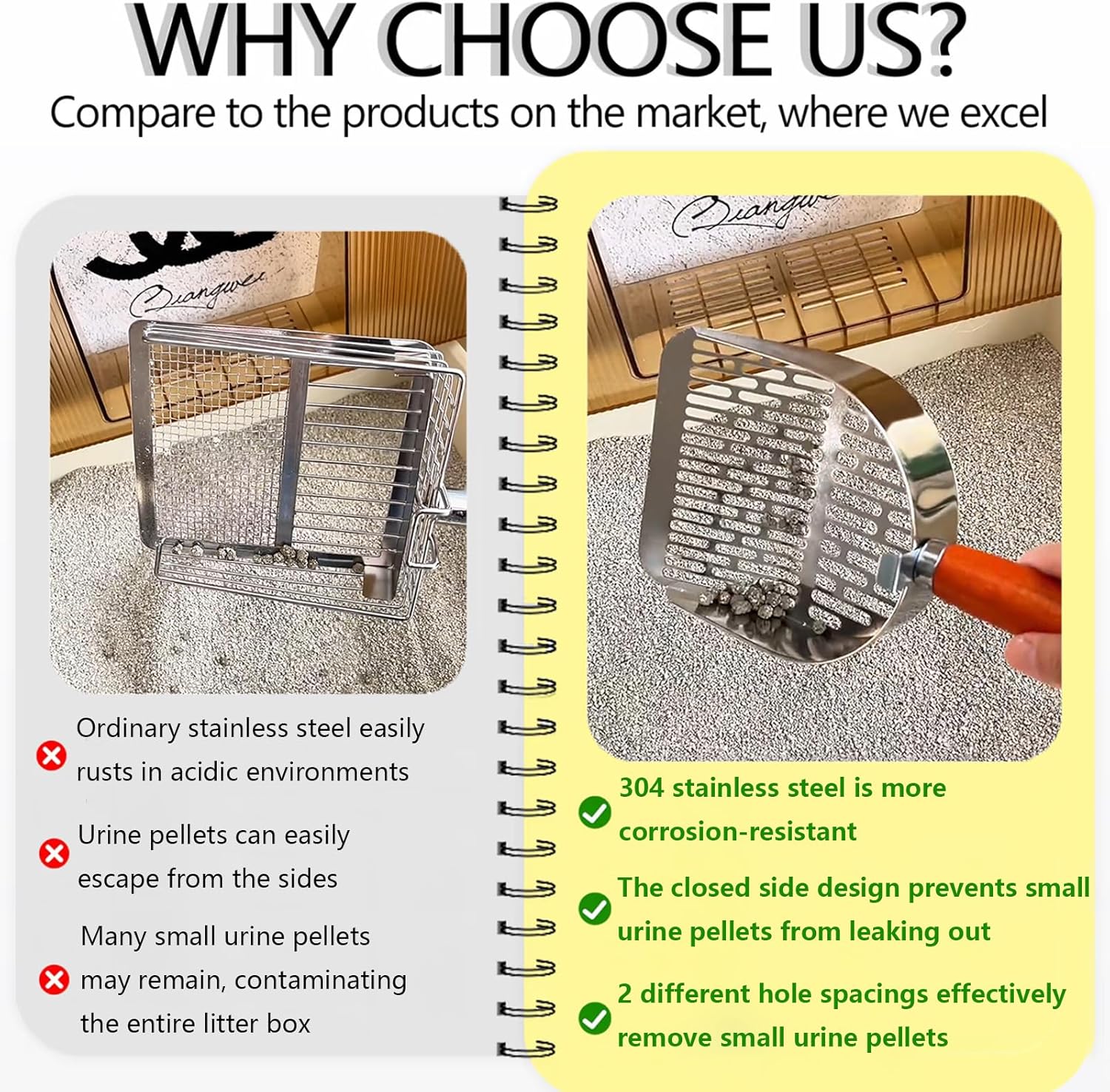 【Premium 304 linguri de gunoi din oțel inoxidabil】 Cupa noastră de gunoi pentru pisici utilizează oțel inoxidabil 304 de înaltă calitate, Filmul de pasivare format de aliajul de nichel cu crom înalt este mai dens și mai stabil, rezistă mediului acid al urinei de pisică și coroziunii chimice și are o rezistență mai mare la coroziunea crevase. Mai puternic și mai durabil decât oțelul inoxidabil obișnuit sau plasticul 【Filtrare eficientă 】 Distanța dintre găuri de 4 mm poate filtra eficient bilele mici de urină și poate preveni contaminarea litierei pentru pisici cu bile de urină sparte. Spațierea găurilor de 6 mm poate scurge litiera pentru pisici rapid și eficient. Marginea frontală lată atinge chiar și colțurile adânci. Designul lateral închis previne scăparea aglomerărilor de urină în jurul marginilor. Economie de timp pentru gospodăriile cu mai multe pisici 【Mâner ergonomic din lemn Cârlig practic】Mânerul din lemn cu formă ergonomică stă confortabil în mână, este antiderapant și reduce oboseala în timpul sesiunilor lungi de curățare. Cârligul integrat permite depozitarea cu economie de spațiu în litieră, întotdeauna la îndemână 【Durată lungă de viață】În loc de lingurile din plastic, care se sparg rapid și produc deșeuri constante, lingura noastră pentru litiera pisicii utilizează oțel inoxidabil 304 + lemn. Această combinație robustă de materiale garantează ani de utilizare (fără a fi necesară înlocuirea constantă ca în cazul plasticului) și reduce deșeurile de plastic pe termen lung. O achiziție ecologică care combină perfect funcționalitatea și durabilitatea 【Facil de curățat】 Suprafețele netede din oțel inoxidabil 304 sunt ușor de curățat, pur și simplu clătiți cu apă după utilizare, fără reziduuri, fără mirosuri. Fără efort, dar igienic curat. Un partener durabil pentru tava dvs. de nisip pentru pisici Detalii suplimentare despre produs