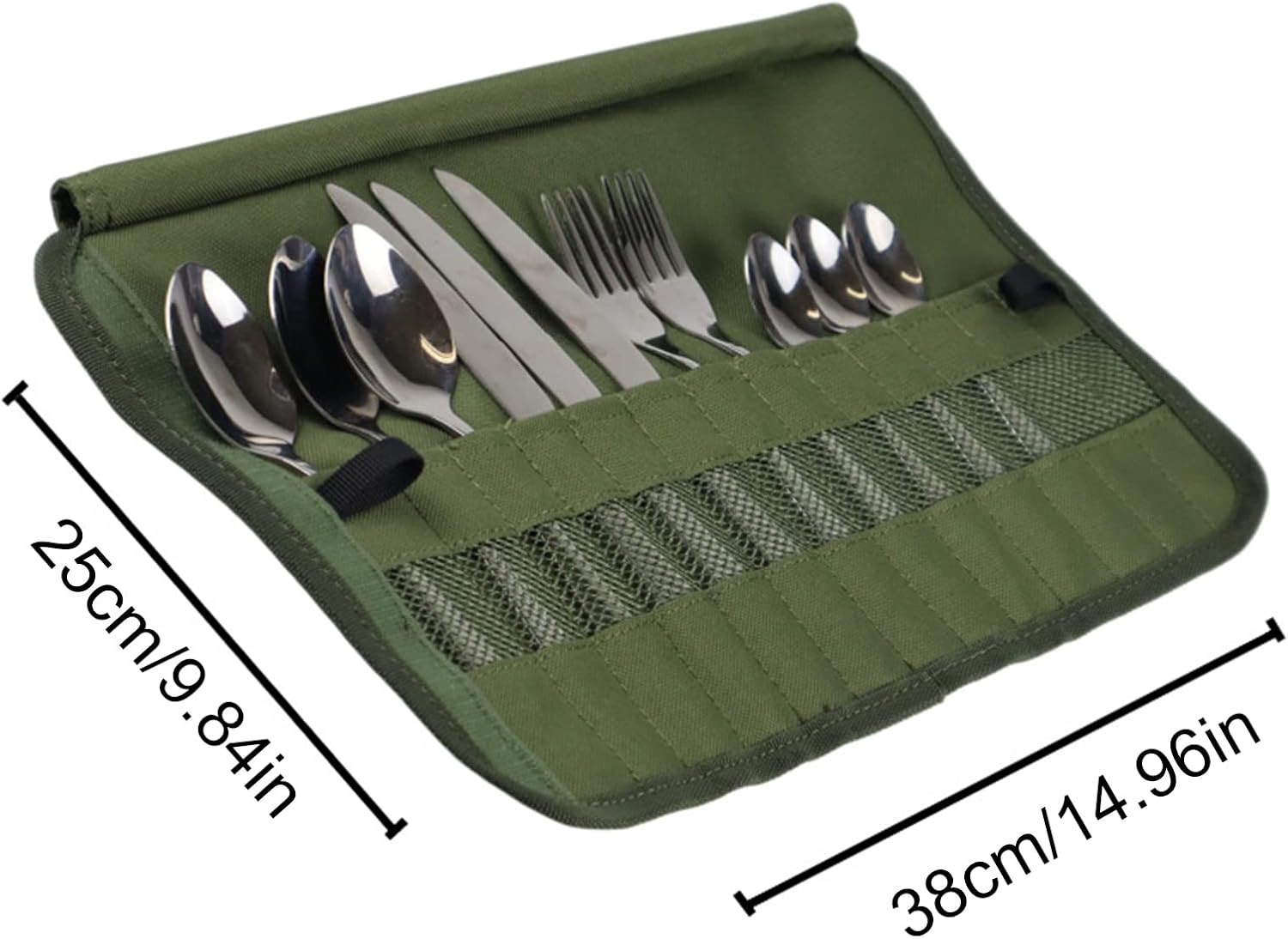 【Geantă pentru tacâmuri】 Geanta pentru tacâmuri de camping are un design cu textură verde militar, care se poate amesteca minunat cu decorul veselei și adaugă o pată de culoare veselei tale, indiferent de ocazie.