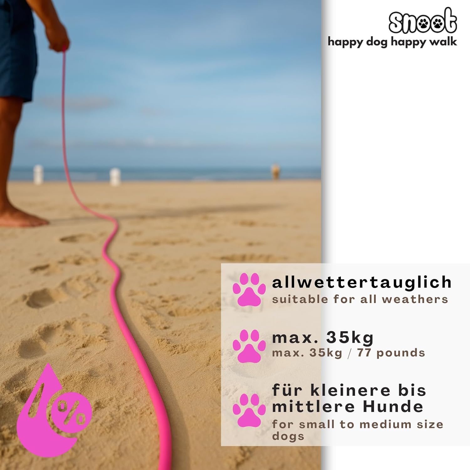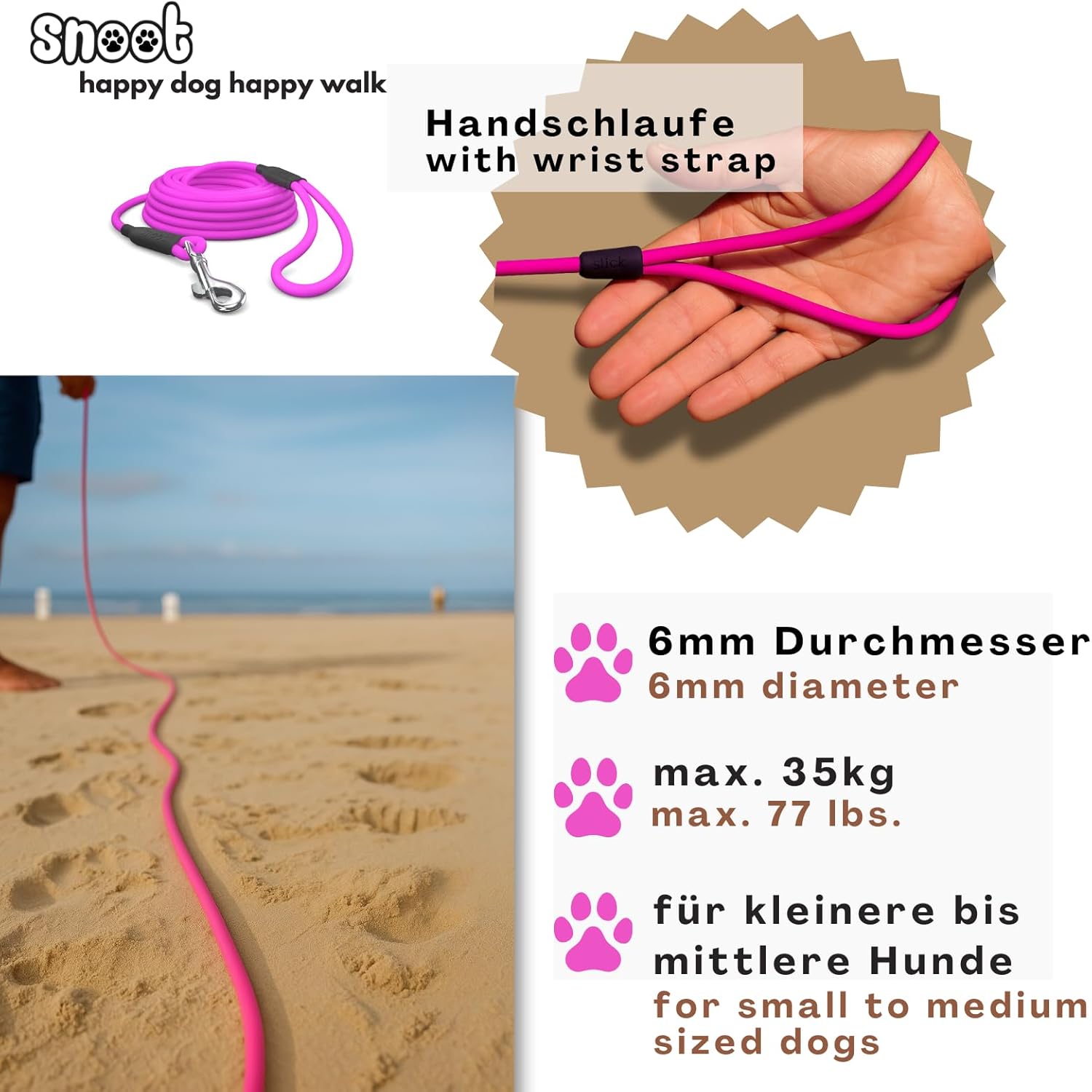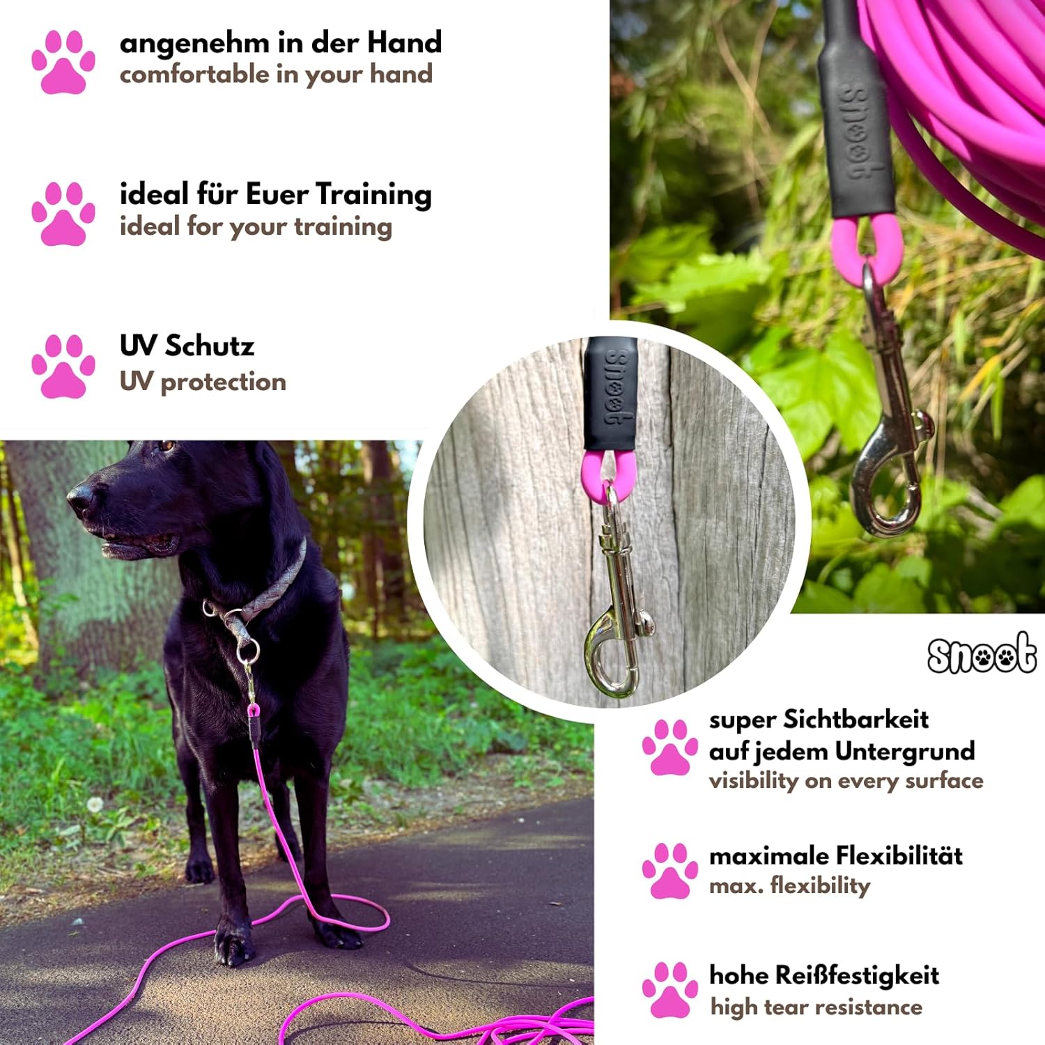 Lesă rotundă premium de 5 metri pentru libertate maximă de mișcare. Lesa de dresaj de înaltă calitate de la SNOOT, cu diametrul de 6 mm, combină calitatea și funcționalitatea. Designul inovator, cu miez intern din nailon multi-împletit și înveliș protector din cauciuc, o face companionul dumneavoastră de încredere în toate condițiile meteorologice. Etanșarea specială a suprafeței respinge eficient murdăria și apa, neutralizează mirosurile și permite curățarea ușoară. Calitate premium în detalii: lungime totală de 5 metri pentru un dresaj optim cu roată liberă. Lesă rotundă de 6 mm pentru o manevrare confortabilă. Miez din nailon multi-împletit de înaltă rezistență, cu înveliș transparent din cauciuc antiderapant. Carabinieră robustă cu șurub profesional pentru o fixare sigură. Curea ergonomică pentru încheietura mâinii pentru o prindere sigură. Notă importantă de siguranță: Această lesă a fost special concepută ca lesă de rechemare pentru dresaj și roată liberă controlată. Din motive de siguranță, nu este potrivită pentru legare sau utilizare nesupravegheată. Vă rugăm să nu lăsați niciodată câinele nesupravegheat cu lesa pentru a evita posibila ros sau încurcare.