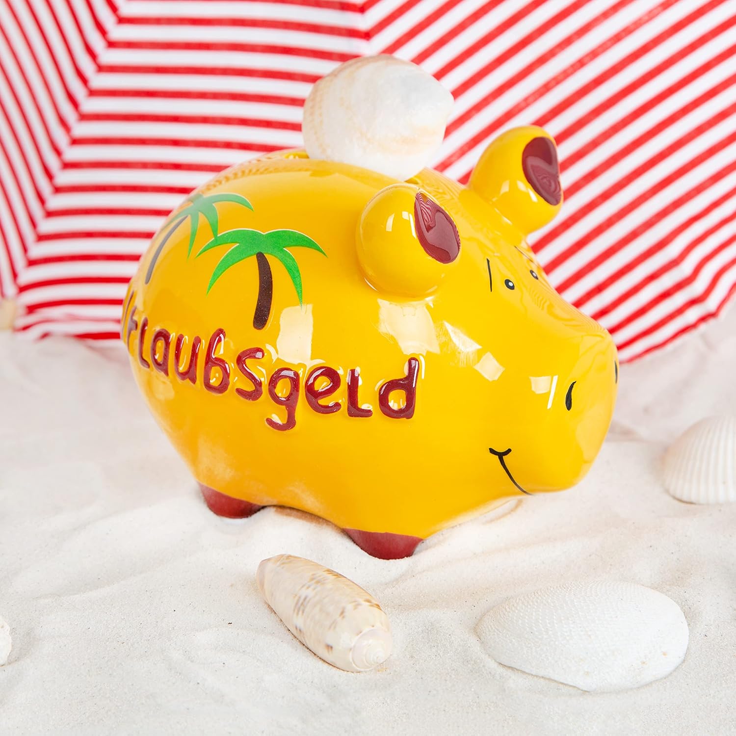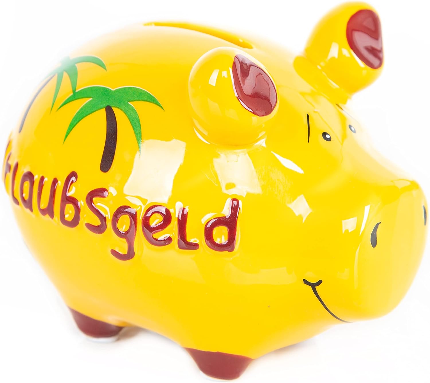 Pușculiță UNICĂ în formă de purceluș decorată cu palmieri și textul „URLAUBSGELD” (BANI DE VACANȚĂ). Vrei să economisești pentru următoarea ta călătorie sau vrei să le oferi celor dragi o injecție financiară pentru următoarea vacanță? Atunci această pușculiță de vacanță este cadoul perfect! Pușculiță originală KCG. Pușculița ceramică are aproximativ 9 cm înălțime, 9 cm lățime și 12,5 cm lungime. Se poate deschide pe partea inferioară și este resigilabilă. Culoare: galben. O idee grozavă este să folosești pușculița ca ambalaj pentru un cadou în bani, de exemplu pentru un cadou de nuntă sau de ziua de naștere. De asemenea, este un companion frumos și practic ca pușculiță de vacanță pentru momente fericite sau ca pușculiță de petrecere pentru purcelușul de vară. În magazinul nostru Amazon veți găsi multe alte idei de cadouri și ambalaje de cadouri frumos proiectate. Aruncați o privire - pur și simplu faceți clic pe numele nostru de mai sus. Mulțumesc! ❤️ Selectat, ambalat și expediat cu dragoste și ❤️ pentru voi de micul Logbuch-Verlag din Bavaria. › Mai multe detalii despre produs