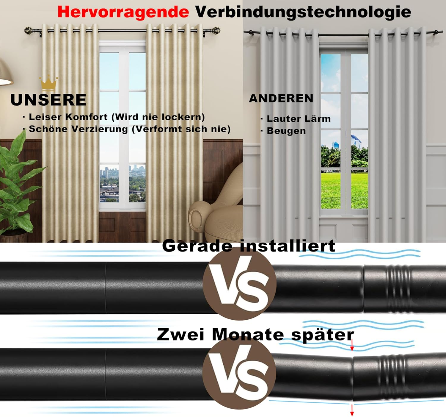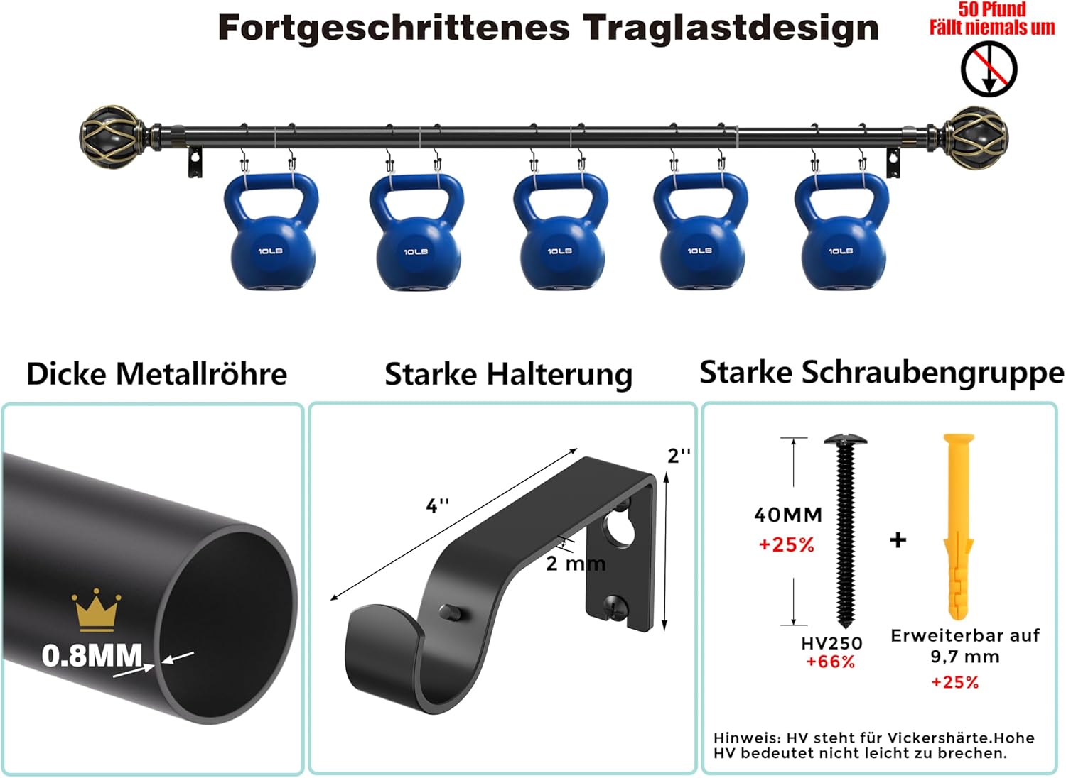 Informații despre acest articol Tijă 100% metalică Stâlpi decorativi pentru perdele - Structură unică și elegantă din plasă la ambele capete ale stâlpului negru pentru o singură fereastră. Vă oferă o plăcere vizuală perfectă și un aspect unic. Mai multe opțiuni de culoare disponibile în negru, bronz antic, argint antic. Robust și stabil - Tija pentru perdele poate susține 50 de lire sterline fără să se slăbească sau să cadă vreodată. Șuruburile de calitate superioară de 40 mm sunt cu 25% mai lungi decât șuruburile tipice de 32 mm și prezintă o duritate cu 66% mai mare (HV250 vs HV150) pentru o durabilitate superioară. Lungime reglabilă - Fiecare stâlp este conectat la o fișă care permite reglarea ușoară a lungimii de la 45 la 150 cm (17,7-59 inch), perfect pentru ferestrele care măsoară între 40 și 145 cm. Lungimea stâlpului de perdea poate fi reglată în funcție de nevoile dvs. și se potrivește perfect cu diverse spații interioare și exterioare, ideal pentru bucătărie, dormitor, cameră de zi, cameră pentru copii sau birou. Garanție de satisfacție - BloomFlower oferă instrucțiuni clare și service de 6 luni. Dacă tija de perdea este deteriorată în timpul transportului, vă rugăm să ne contactați. Alte detalii despre produs