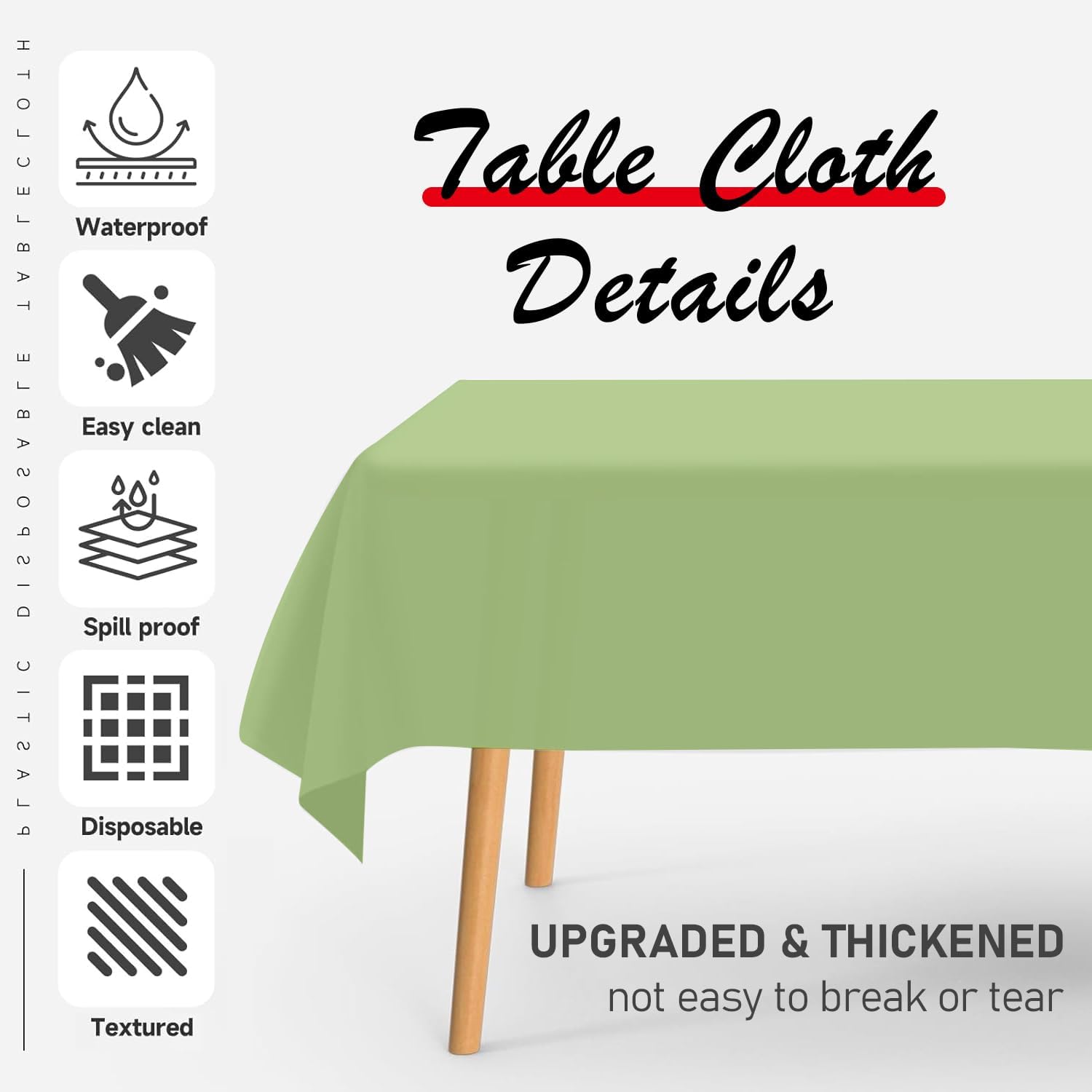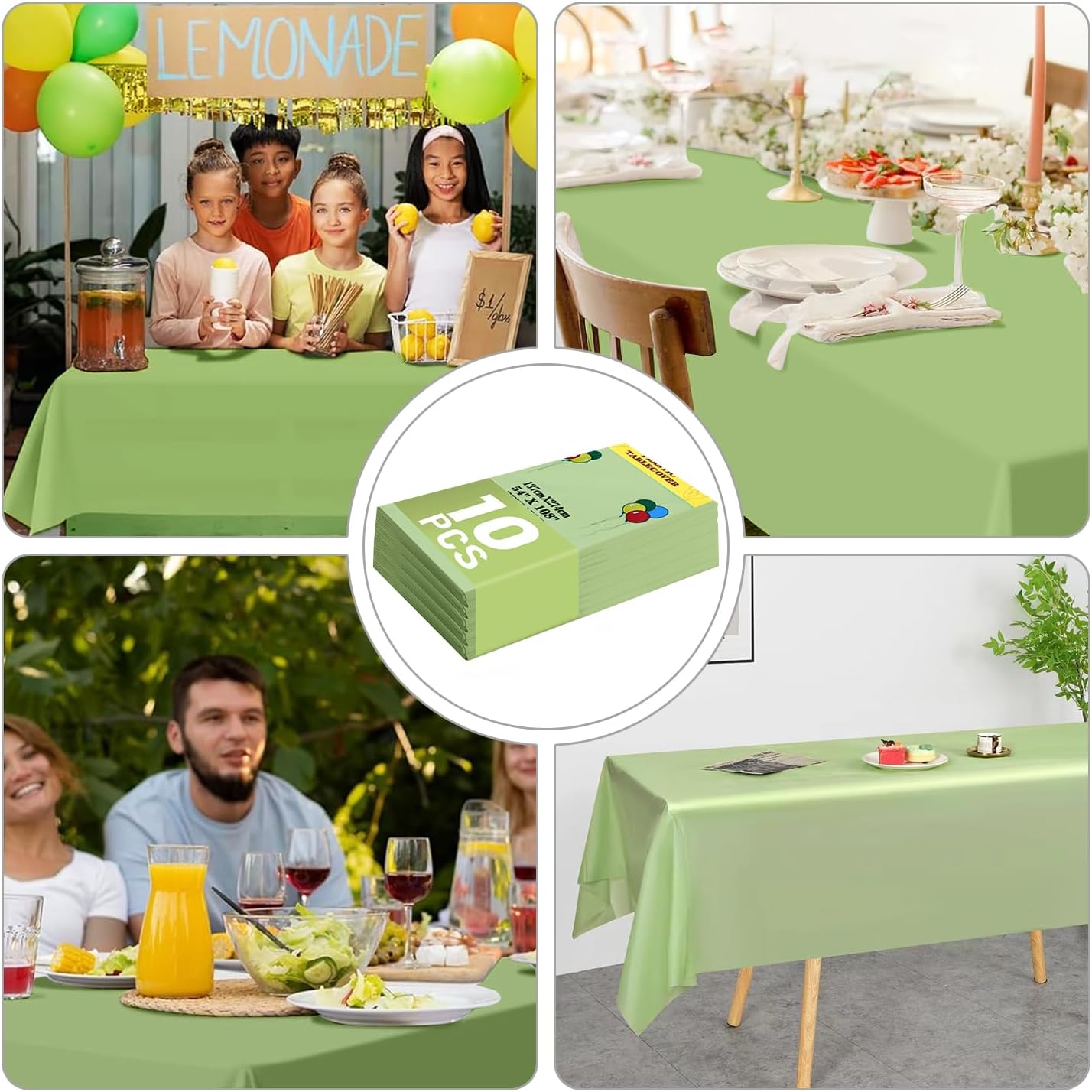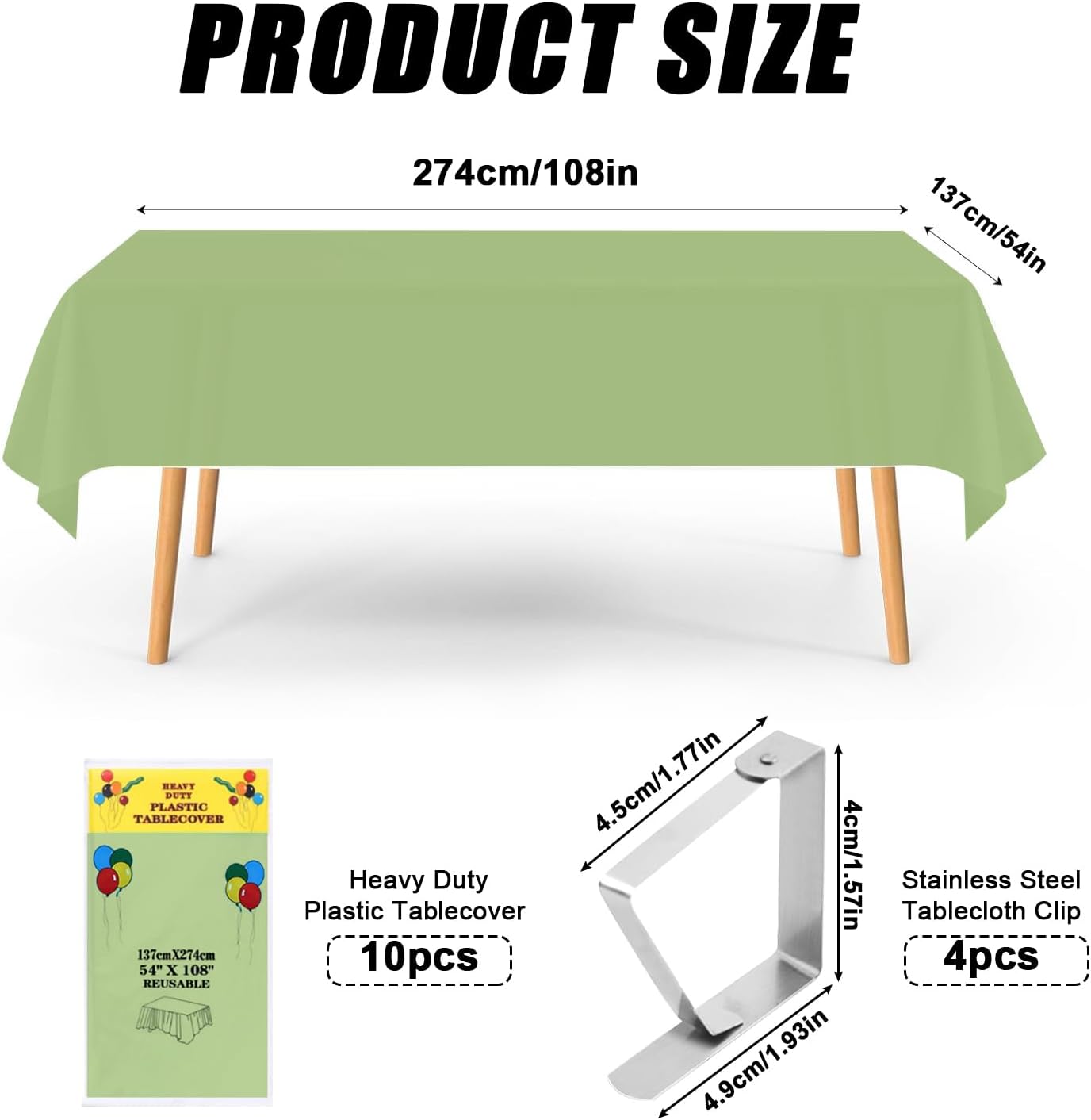SET FEȚE DE MASĂ DE UNICĂ FOLOSINȚĂ: Pachetul conține 10 fețe de masă din plastic verzi. Fața de masă are dimensiunea de 54 x 108 inchi / 137 x 274 CM. Cu 4 cleme de masă. Fețele de masă dreptunghiulare din plastic acoperă orice masă de până la 8 picioare și adaugă eleganță petrecerii dumneavoastră.