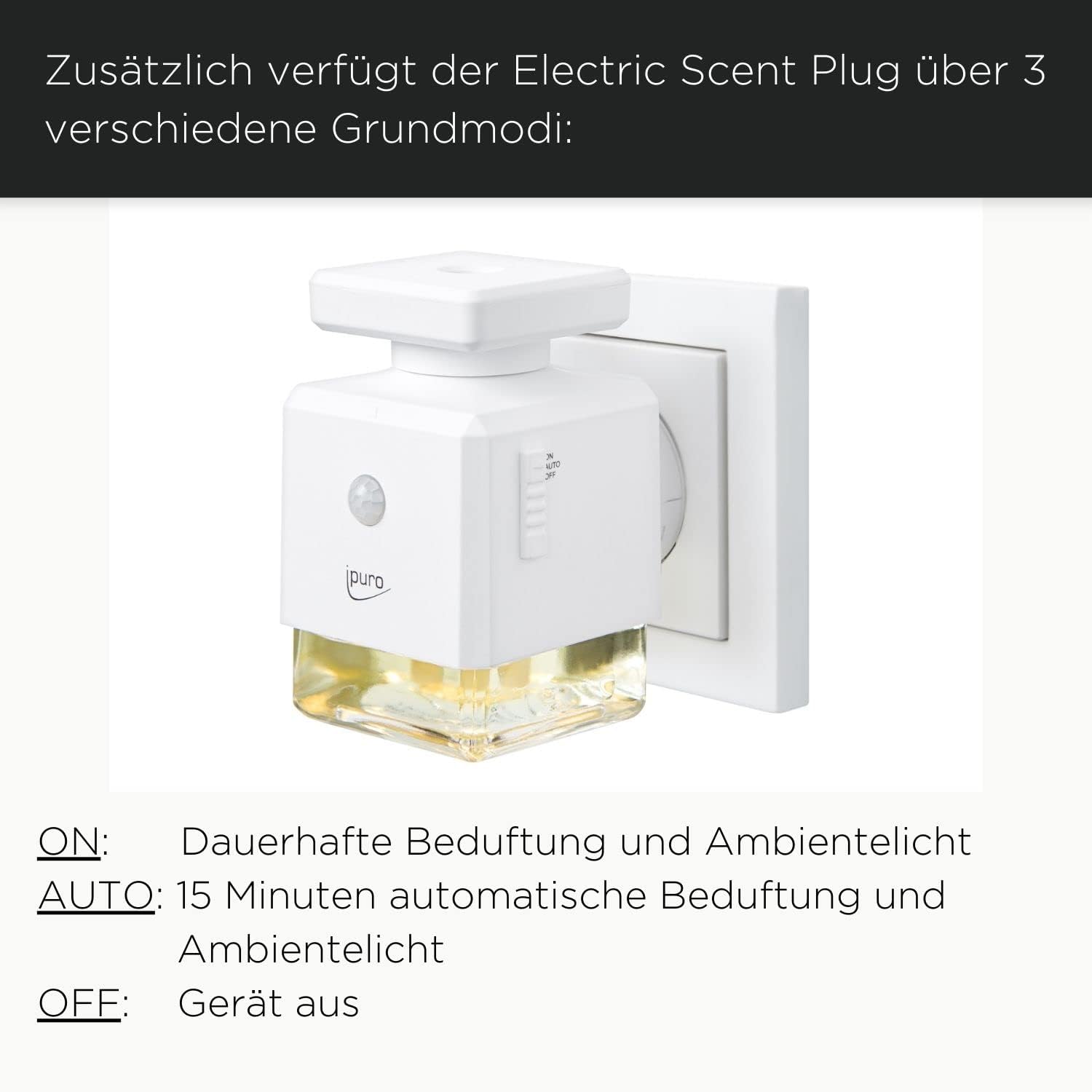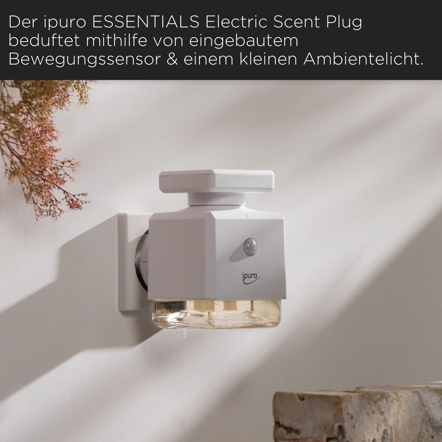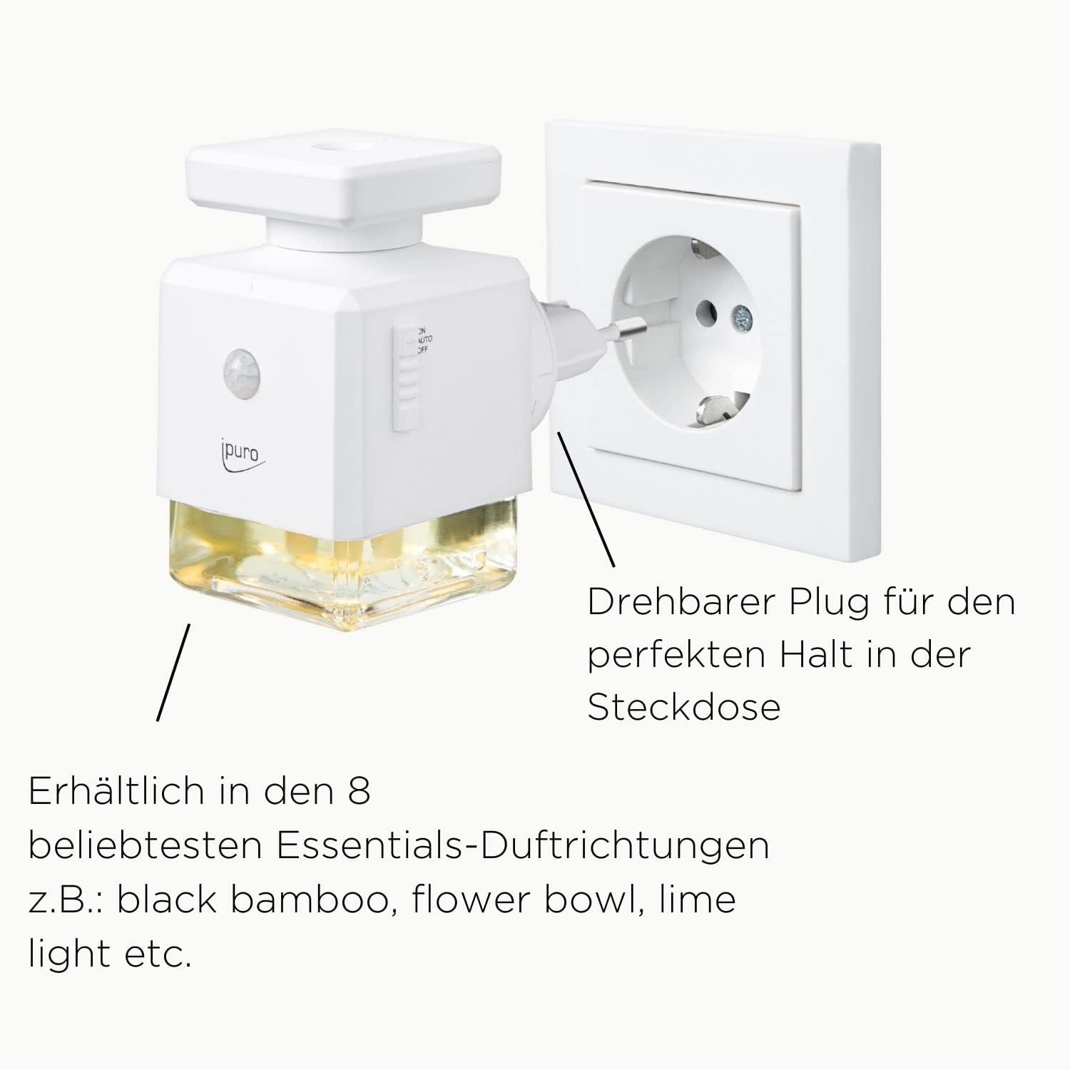 Difuzor de aromă ipuro Scent Plug pentru o ambianță confortabilă, cu lumină ambientală și parfumuri unice, tehnologie inovatoare cu 3 nivele de intensitate, senzor de mișcare și design minimalist, pentru o experiență puristă de până la 75 de zile.