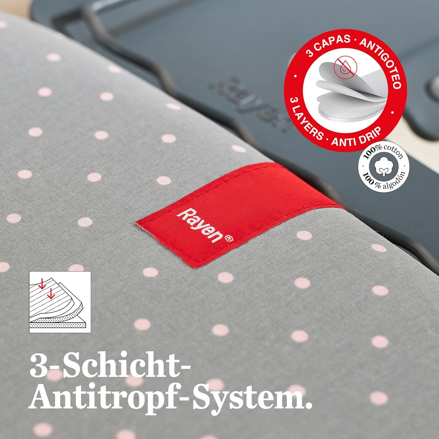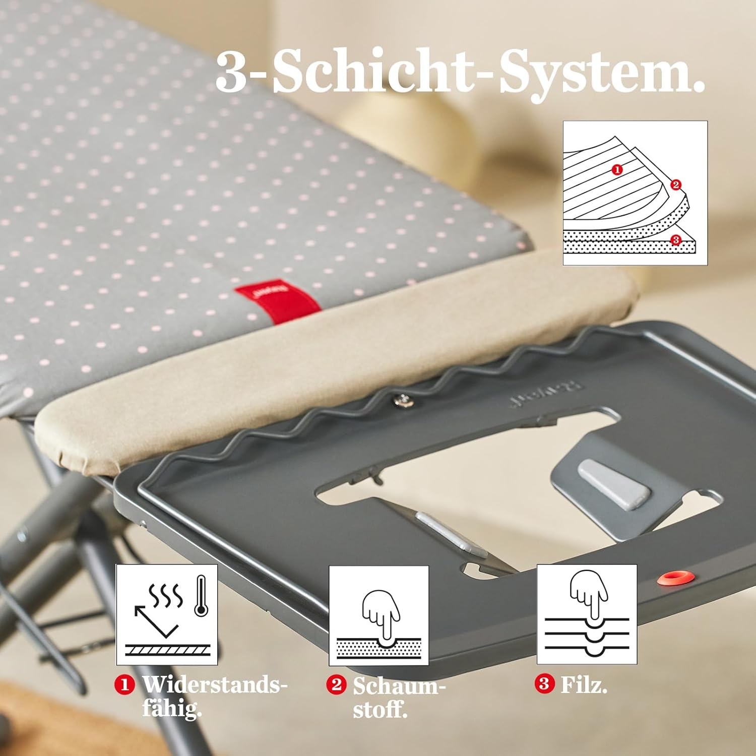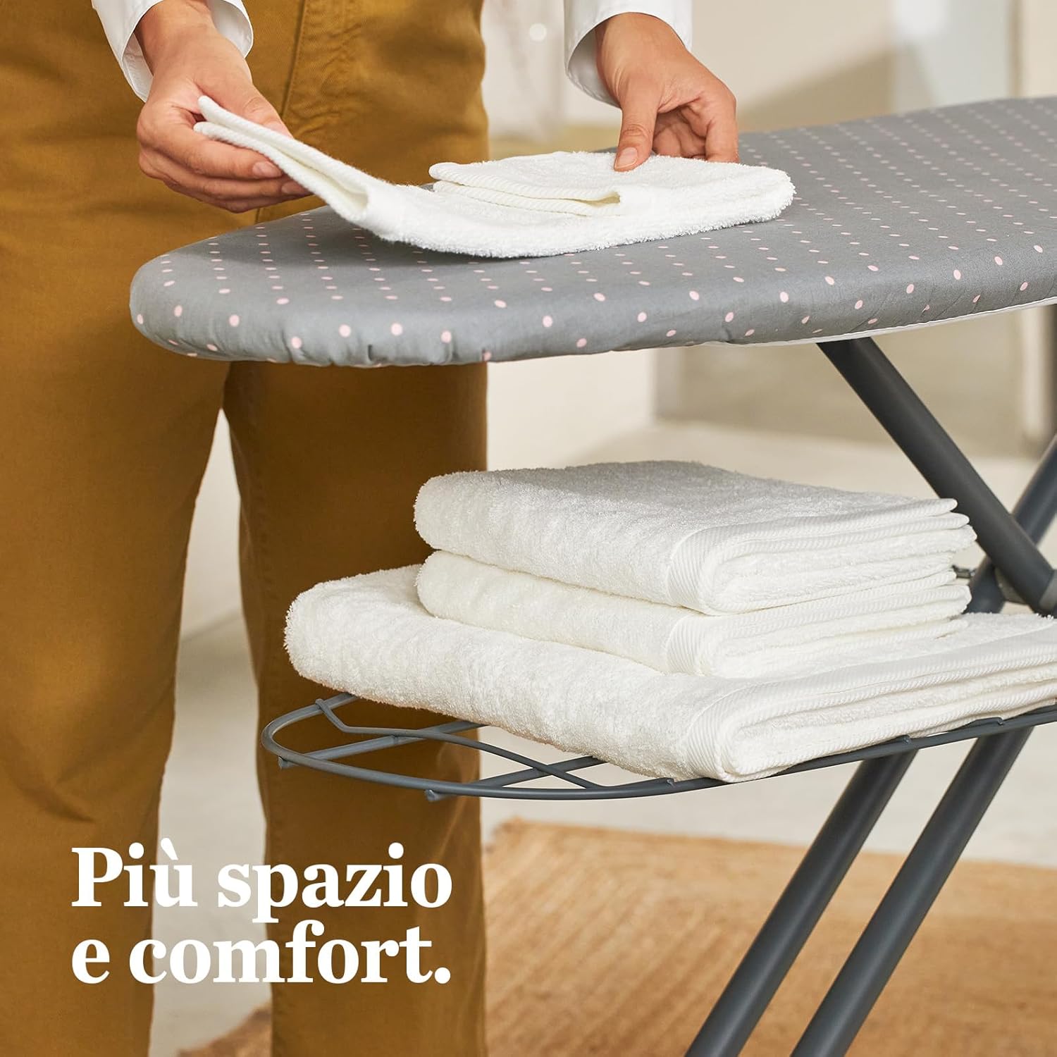Husă reglabilă pentru masa de călcat, potrivită pentru orice masă de până la 130 x 47 cm. Material 100% bumbac, cu o bază din spumă și alta din flanelă. Sistem de fixare EasyClip.