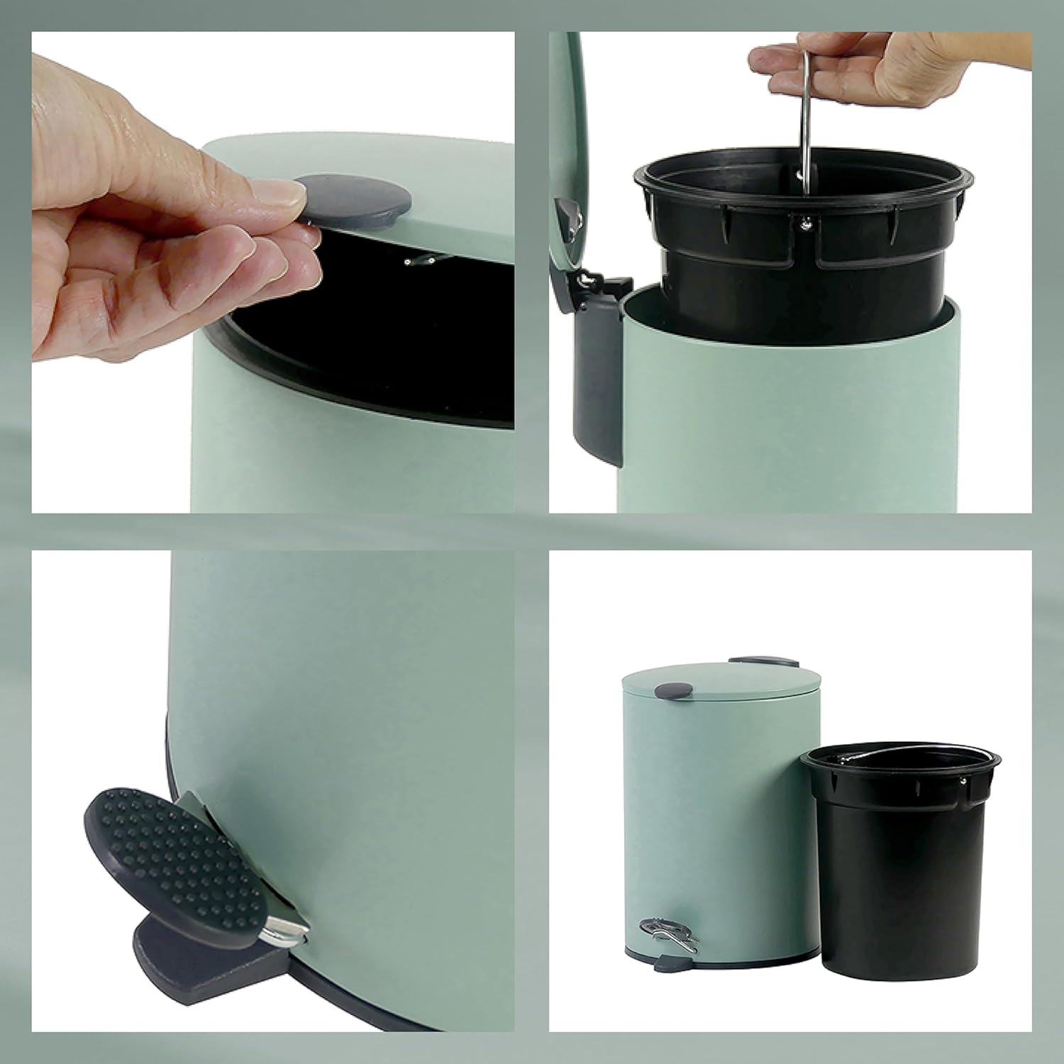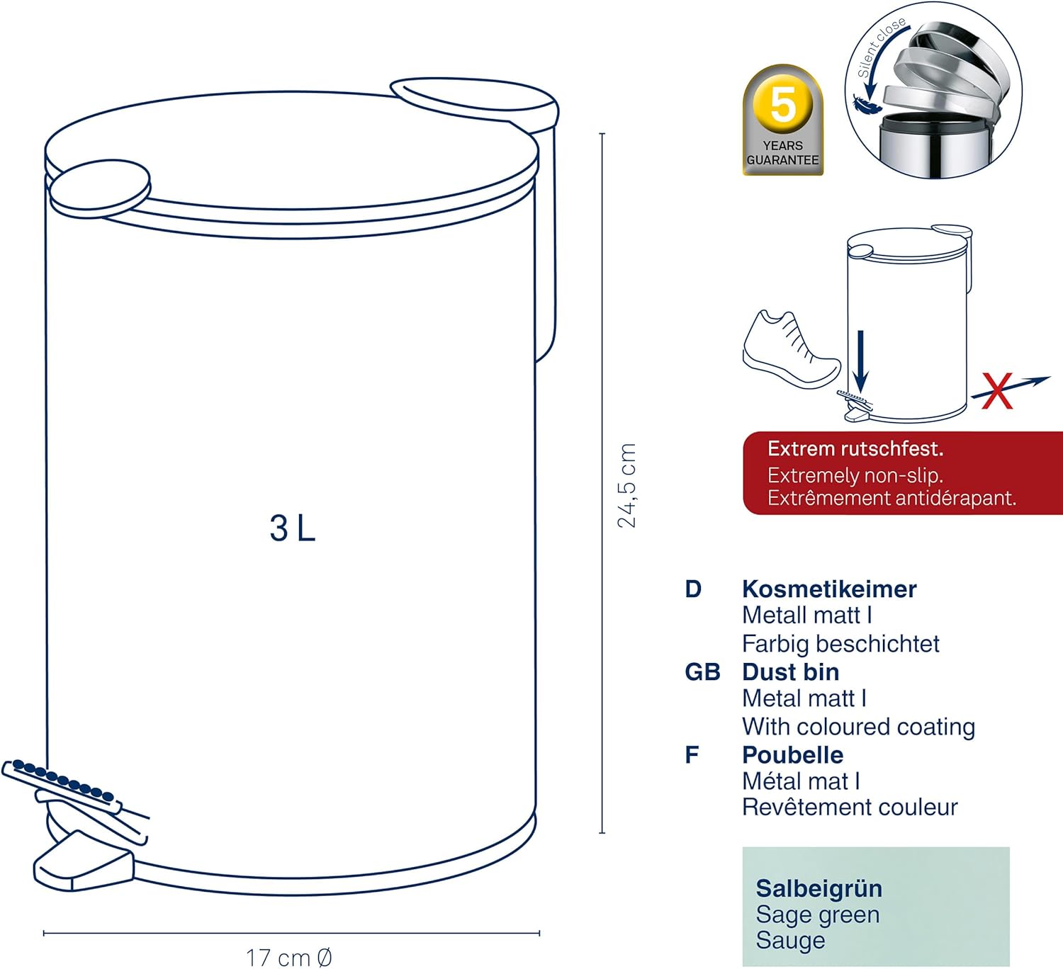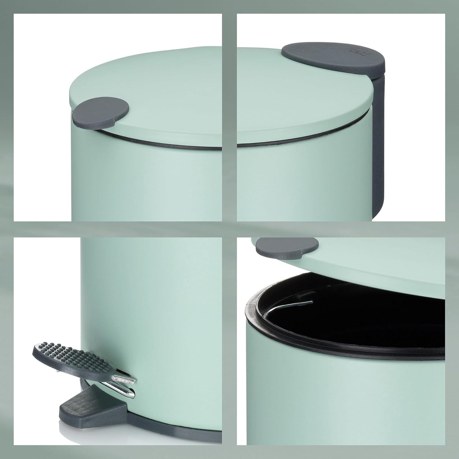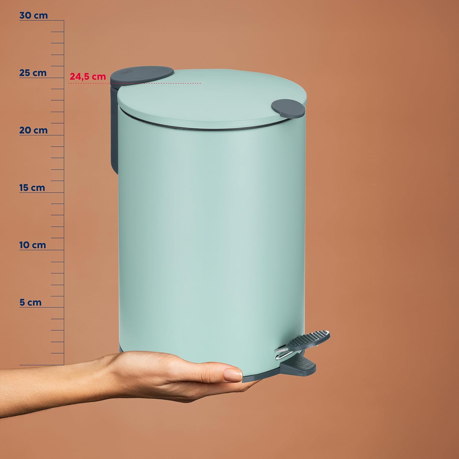 Design compact și elegant: coș de 3 litri, realizat din metal acoperit cu pulbere cu finisaj mat în nuanță de verde salvie, ideal pentru baie, bucătărie sau birou.