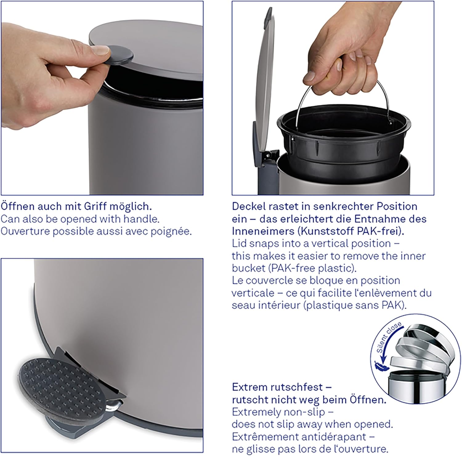 Mecanism igienic: deschidere cu pedală antiderapantă, care permite utilizarea fără atingerea capacului.
