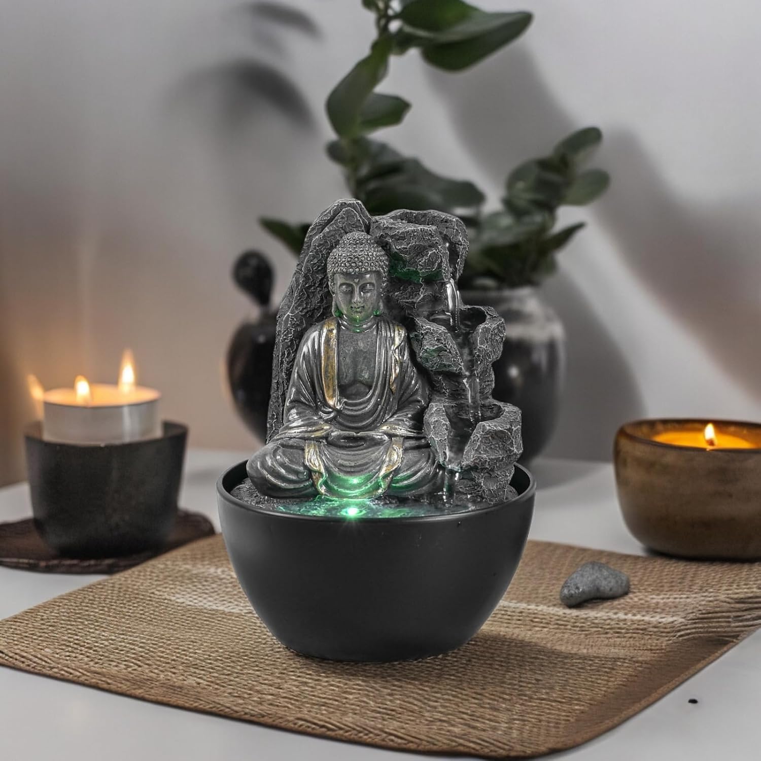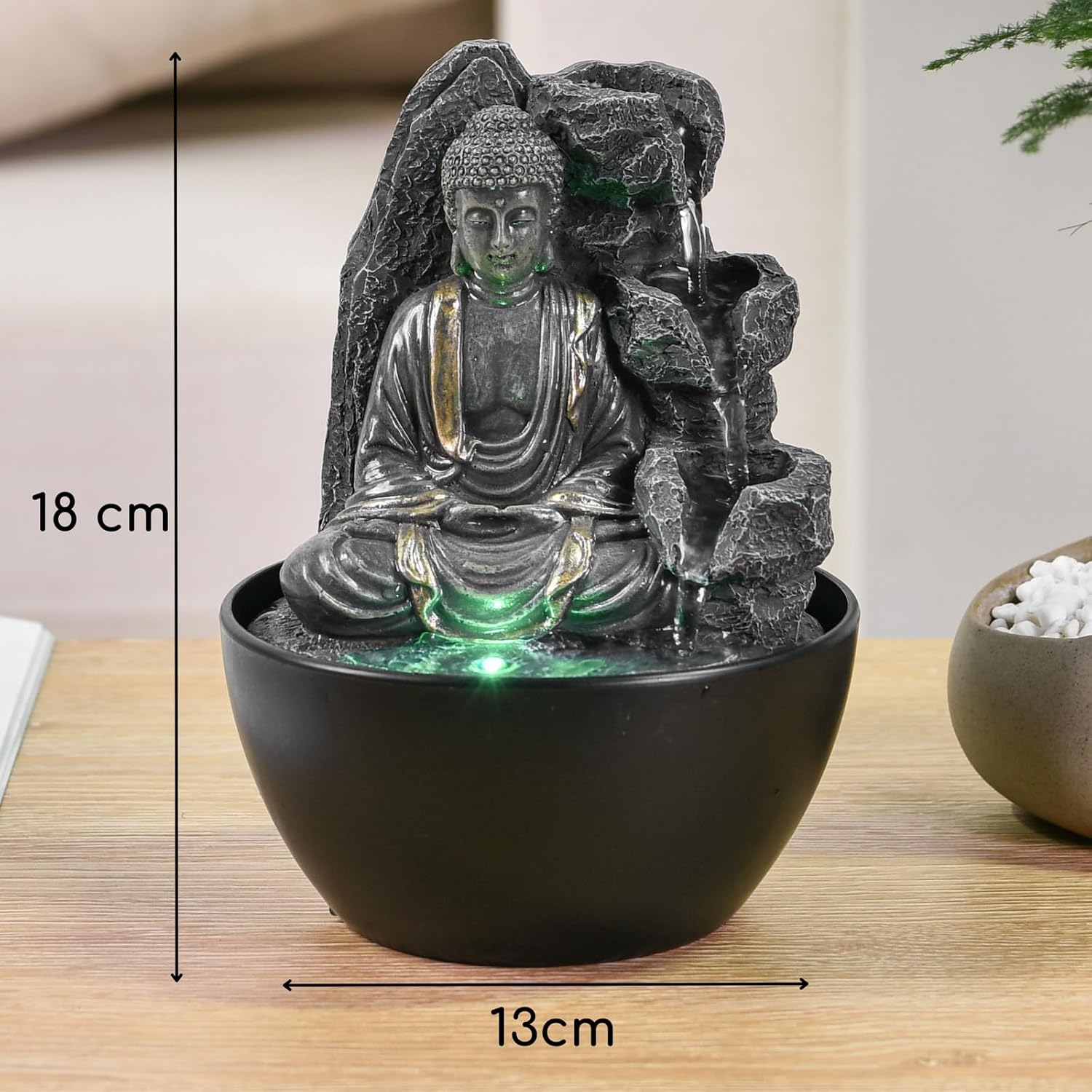 Creează un colț de liniște și armonie în casa ta cu fântâna de interior Zen Light cu statuetă Buddha și iluminare LED – un obiect decorativ elegant, conceput pentru a aduce relaxare, echilibru și o atmosferă zen în orice încăpere.