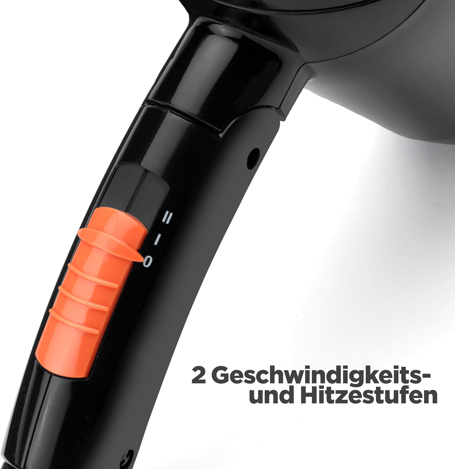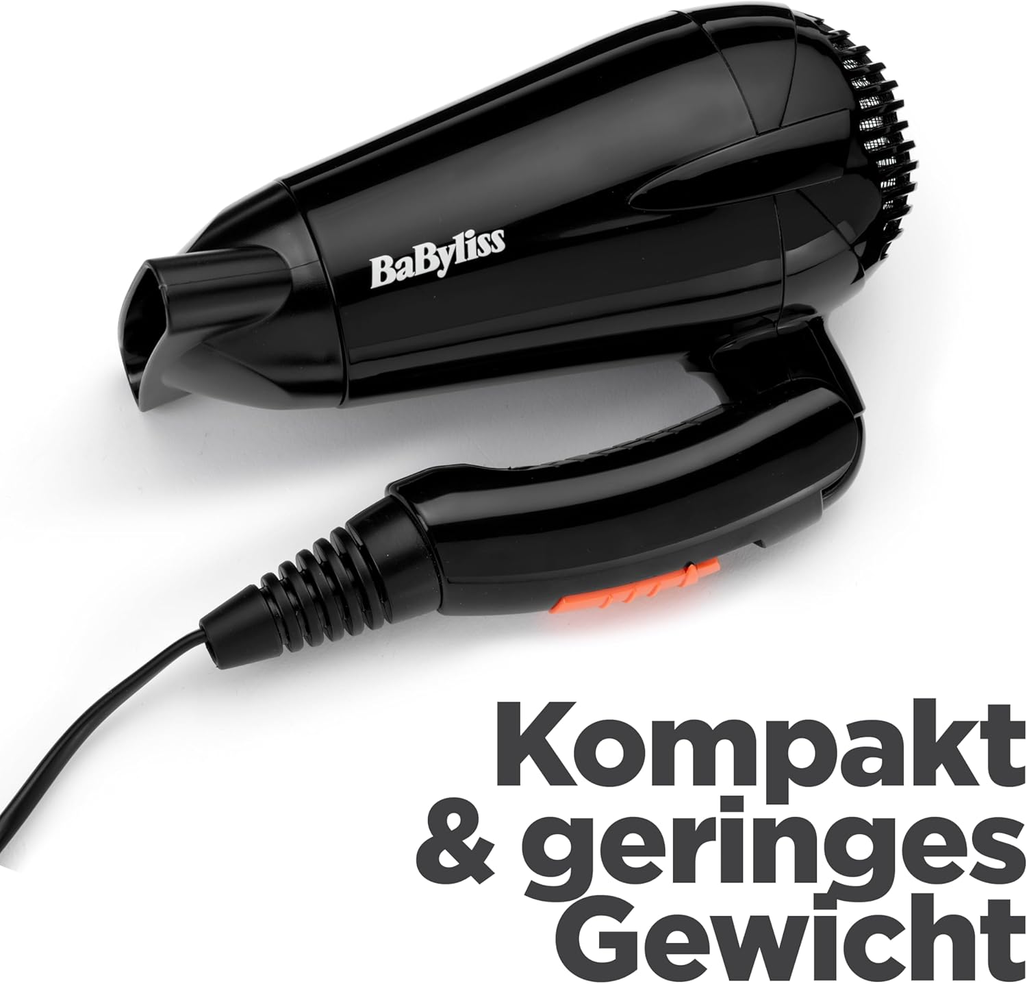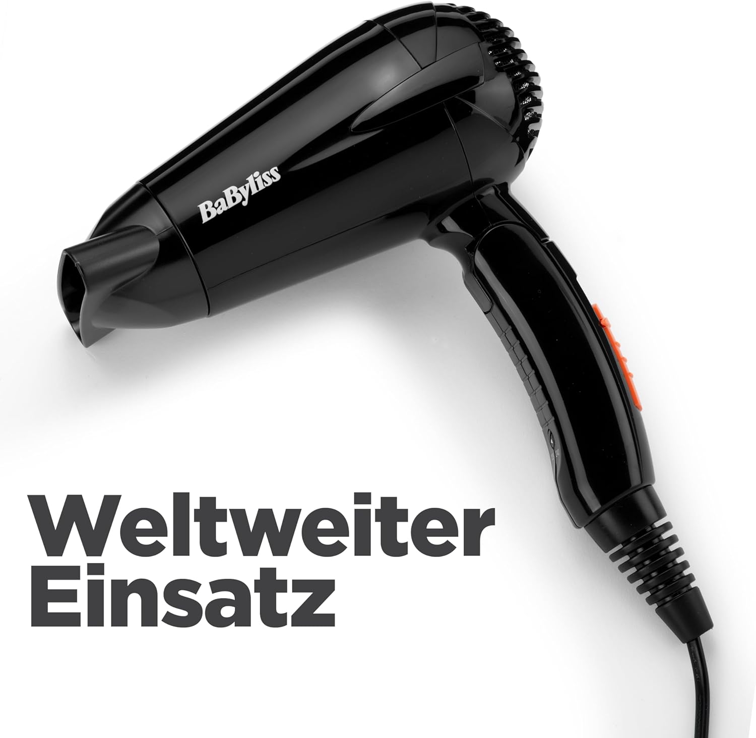 Uscător de păr BaByliss Travel Folding – Ușor și puternic, 2000W, tensiune universală, utilizabil oriunde în lume, 2 trepte de temperatură/viteză, Negru/Portocaliu, 5334E. Perfect pentru călătorii.