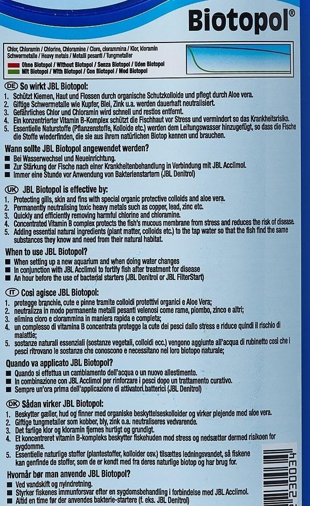 Info zu diesem Artikel Für fisch- und pflanzengerechtes Aquarienwasser: Bei Neueinrichtung, Wasserwechsel und zur Stärkung nach Fischkrankheiten für Süßwasser Aquarien, Wasserschildkröten und Garnelen Entfernen von Giftstoffen aus Leitungswasser: Neutralisierung von Kupfer, Zink und Blei, Neutralisierung von Chlor Gesundes Wasser, gesunde Fische: Schutz von Schleimhaut, Kiemen, Haut und Flossen durch Aloe Vera Stressschutz und Stärkung des Immunsystems durch Vitamin B Lieferumfang: 1 x Flasche JBL Wasseraufbereiter 23003 für Aquarien 500 ml Umweltschonender Nachfüllbeutel erhältlich › Weitere Produktdetails