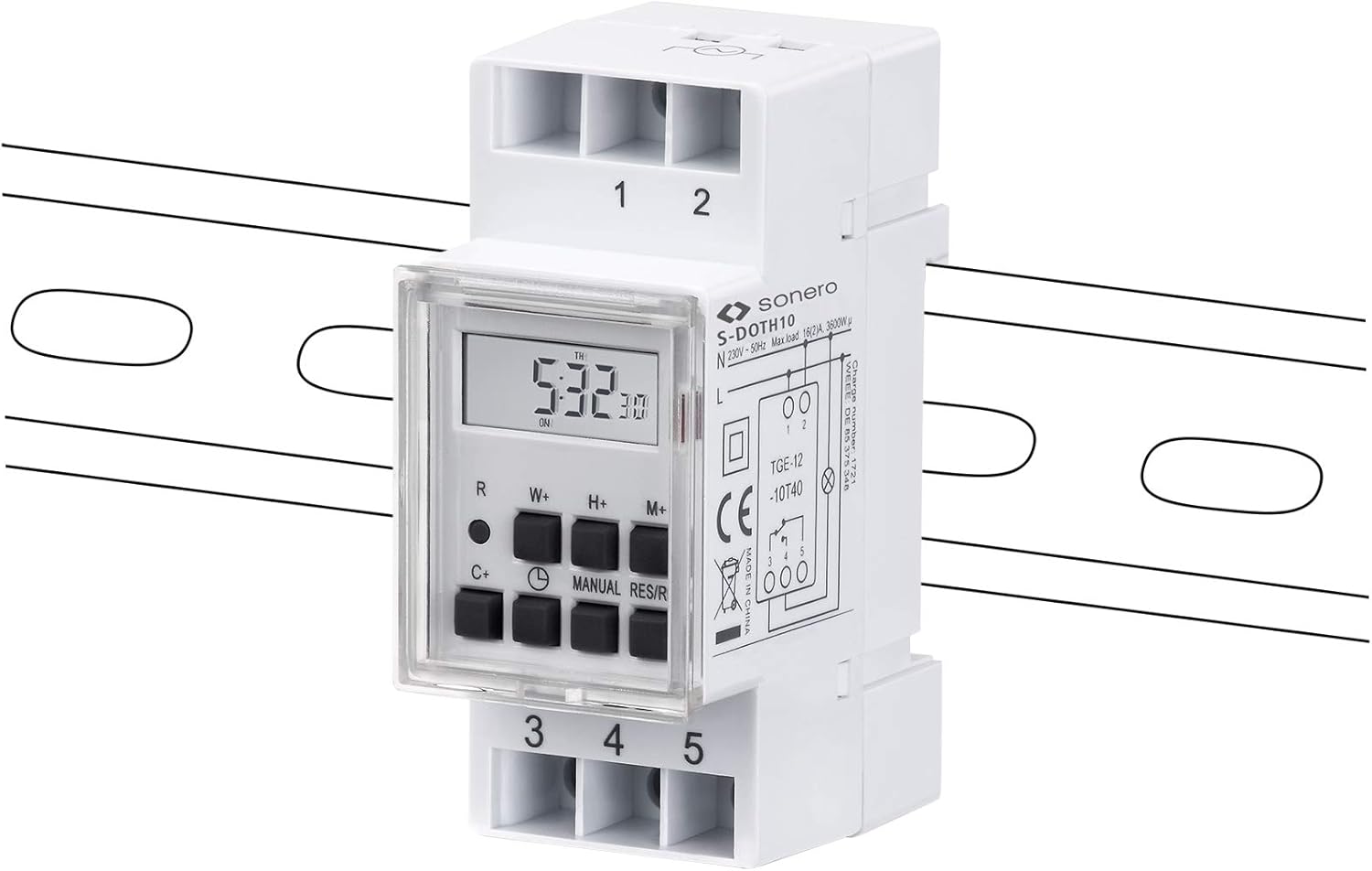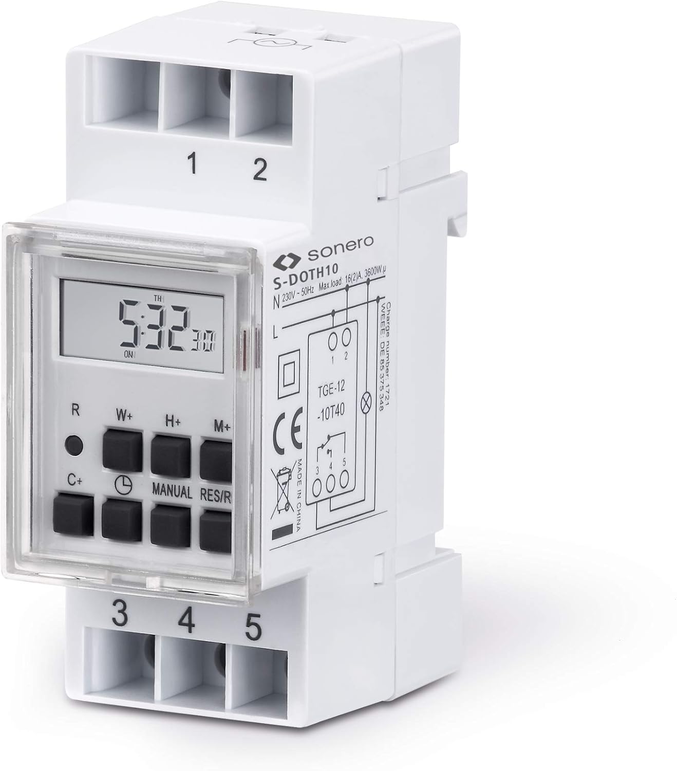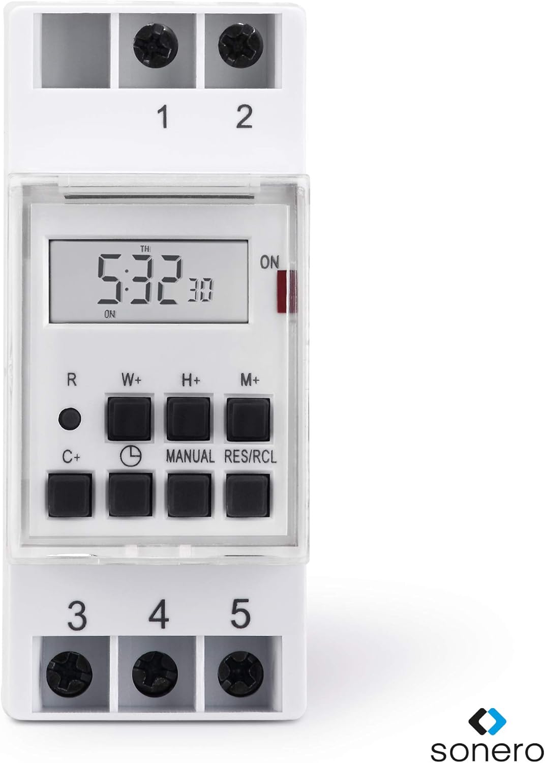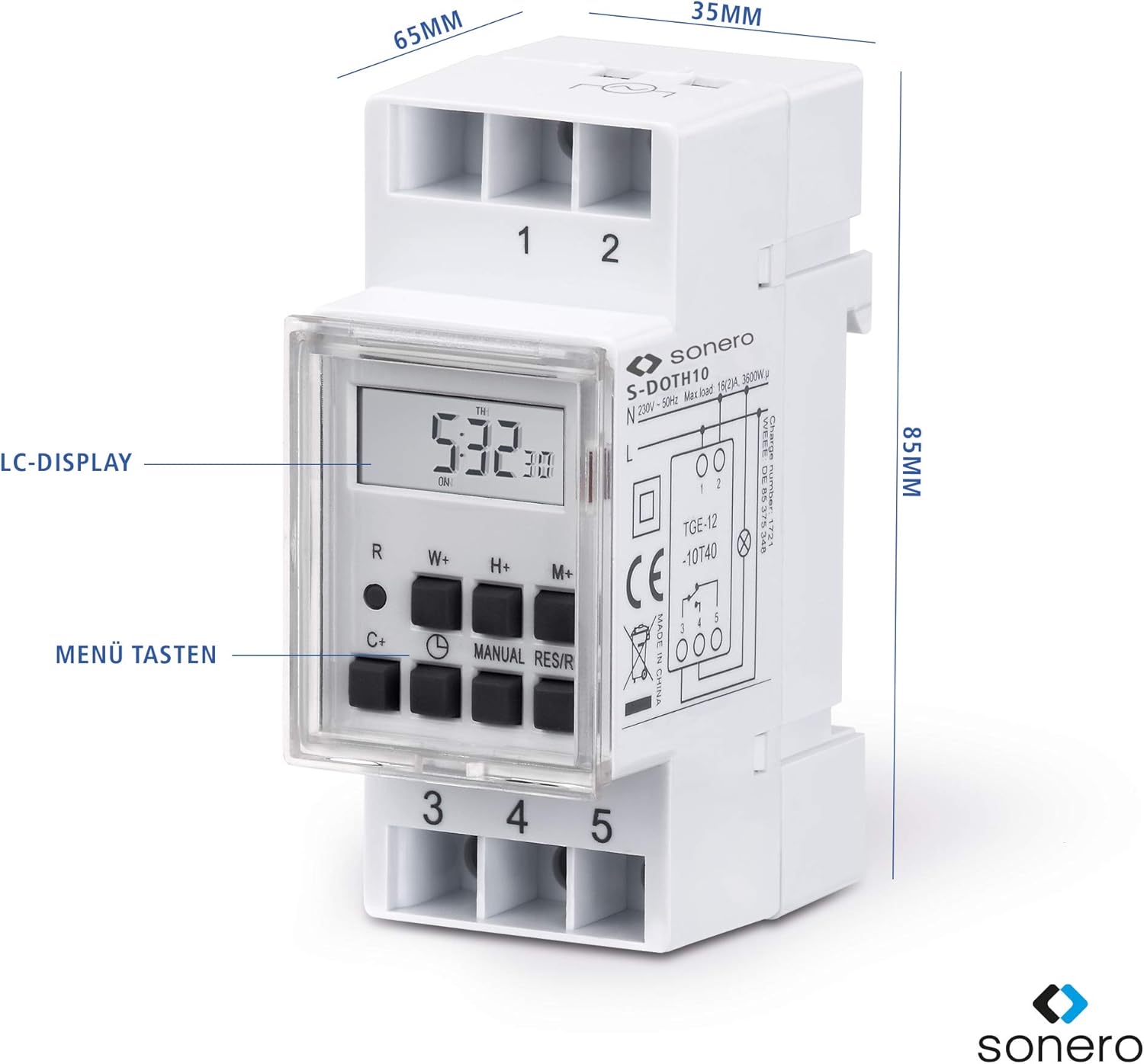 sonero® Digitale Zeitschaltuhr für Hutschienen / Schalttafel Einbau, 3600W, LCD-Display, 10 Schaltprogramme (Wochen-, Tages- und Minutenprogramm), 12/24h Timer, IP20, weiß, S-DOTH10