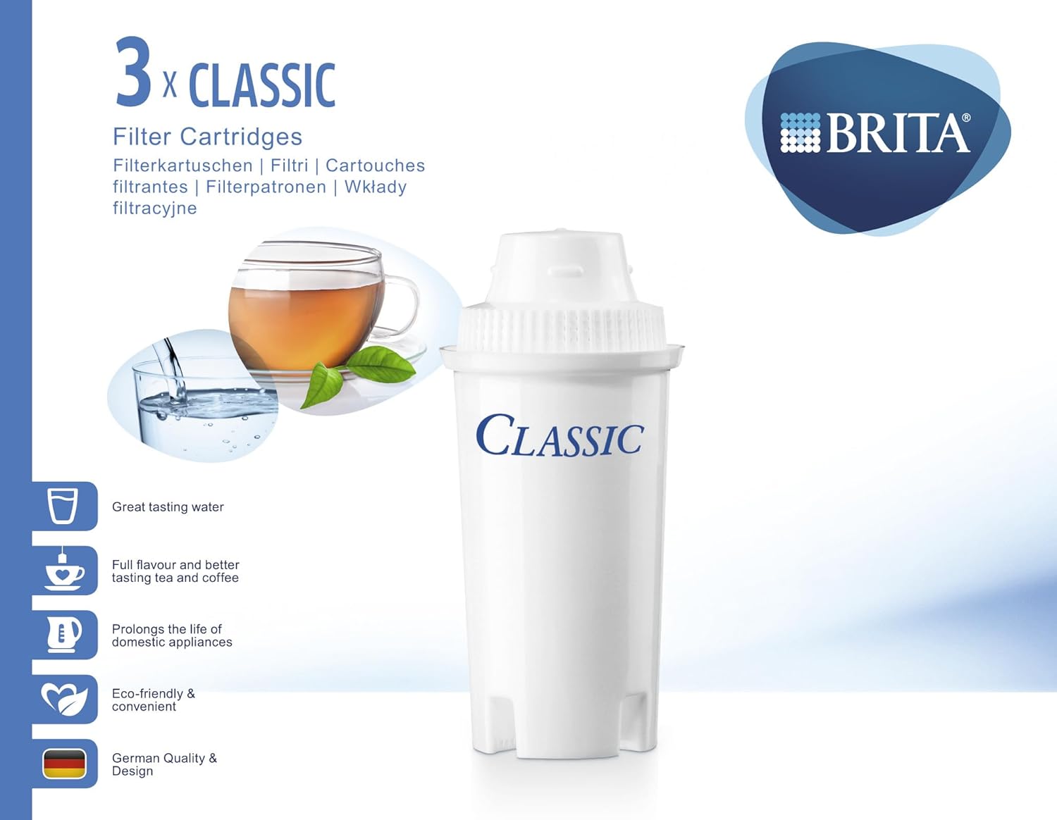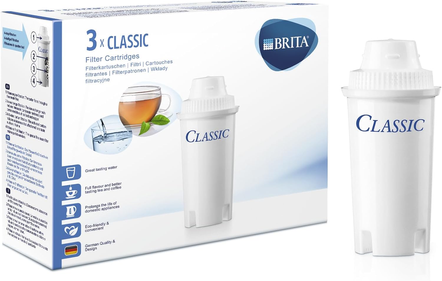 Cartușul filtrant de apă BRITA Classic reduce calcarul, clorul și impuritățile din apa de la robinet, ceea ce înseamnă că vă puteți bucura întotdeauna de o apă filtrată BRITA cu gust excelent. Fiecare cartuș va dura aproximativ o lună și este 100% reciclabil. Cartușul Classic este ușor de preparat și nu necesită înmuiere prealabilă. Este conceput pentru a se potrivi tuturor sistemelor de carafe BRITA Classic și fierbătorului cu filtru de apă BRITA Accario. Cartușul Classic este potrivit pentru toate tipurile de apă din Regatul Unit.