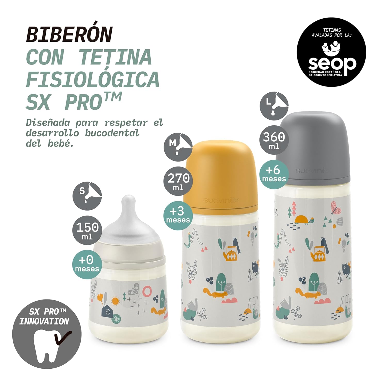 Biberonul Suavinex de 360 ml, echipat cu tetina fiziologică SX Pro, este conceput special pentru bebelușii de peste 6 luni, oferind o experiență de hrănire naturală și confortabilă, adaptată dezvoltării orale sănătoase.