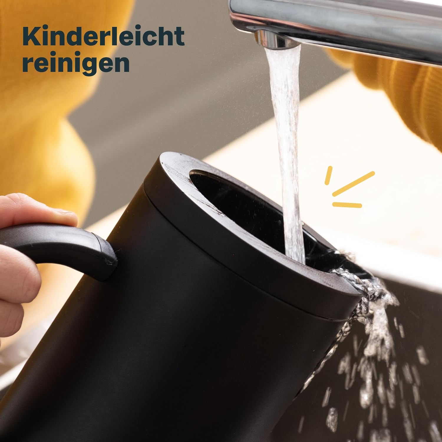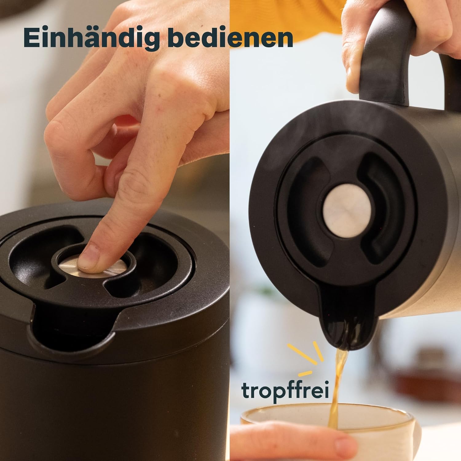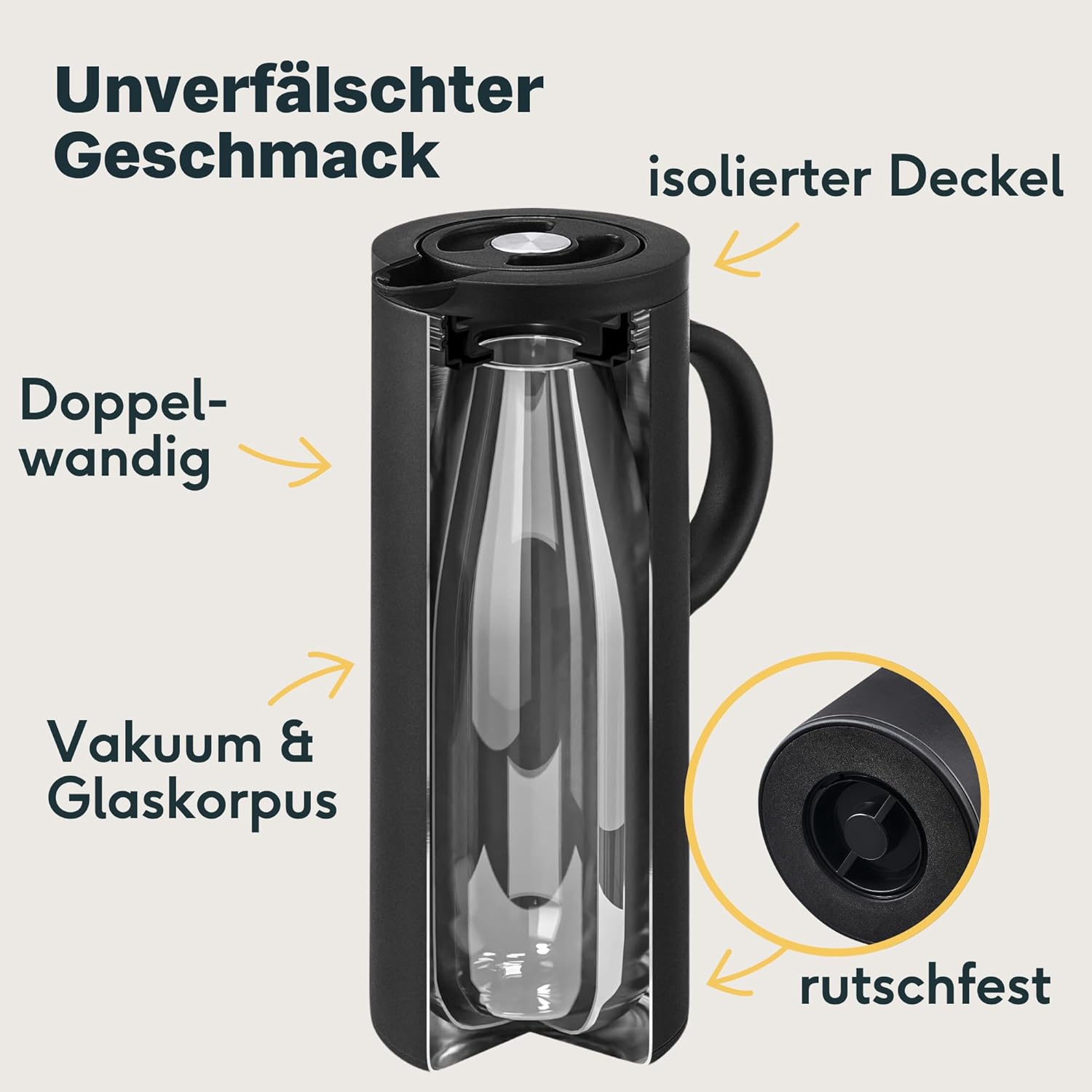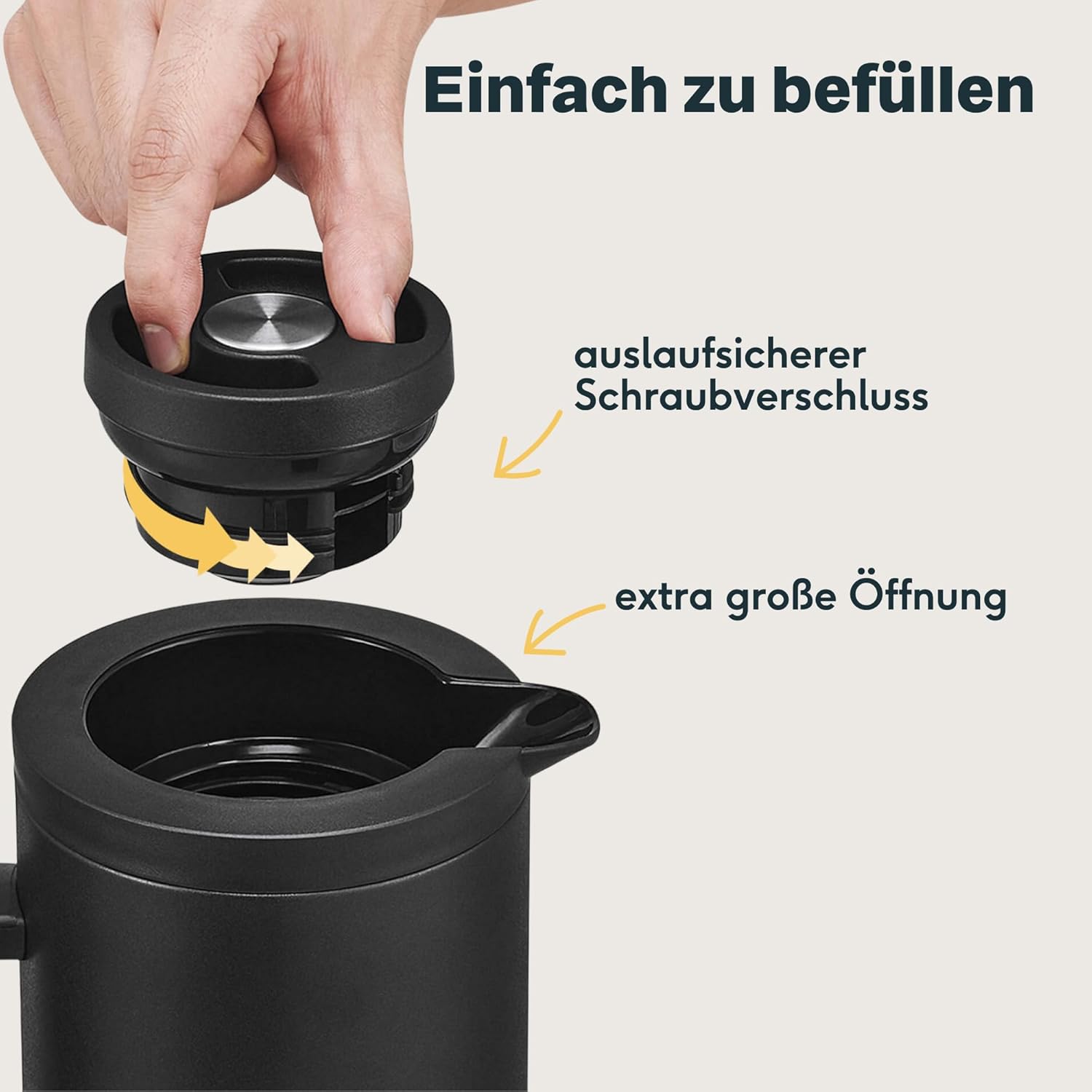 Informații despre acest articol ✔ Bucurați-vă toată ziua - izolația termică cu pereți dubli vă menține ceaiul sau cafeaua calde timp de 12 ore. Băuturile reci timp de până la 24 de ore. ✔ Blocare prin presiune cu 1 clic - Ulciorul este foarte ușor de utilizat cu o singură mână. Apăsați butonul și turnați fără să picurați. Cu baza antiderapantă, carafa este întotdeauna stabilă fără a deteriora suprafețele. ✔ Inserție de sticlă durabilă - Fabricat din oțel inoxidabil cu un strat negru rezistent la zgârieturi. Mânerul și capacul sunt fabricate din plastic fără BPA. Inserția de sticlă este prietenoasă cu alimentele și fără gust. ✔ Design subțire - Cu forma sa, este perfect pentru birou sau la domiciliu în biroul de acasă. Ulciorul mare cu o capacitate de 1 litru este suficient pentru 6-8 cești și încă economisește spațiu. ✔ Ușor de curățat - Părțile individuale pot fi ușor îndepărtate și curățate manual. Acest lucru garantează o durată lungă de viață. Alte detalii despre produs