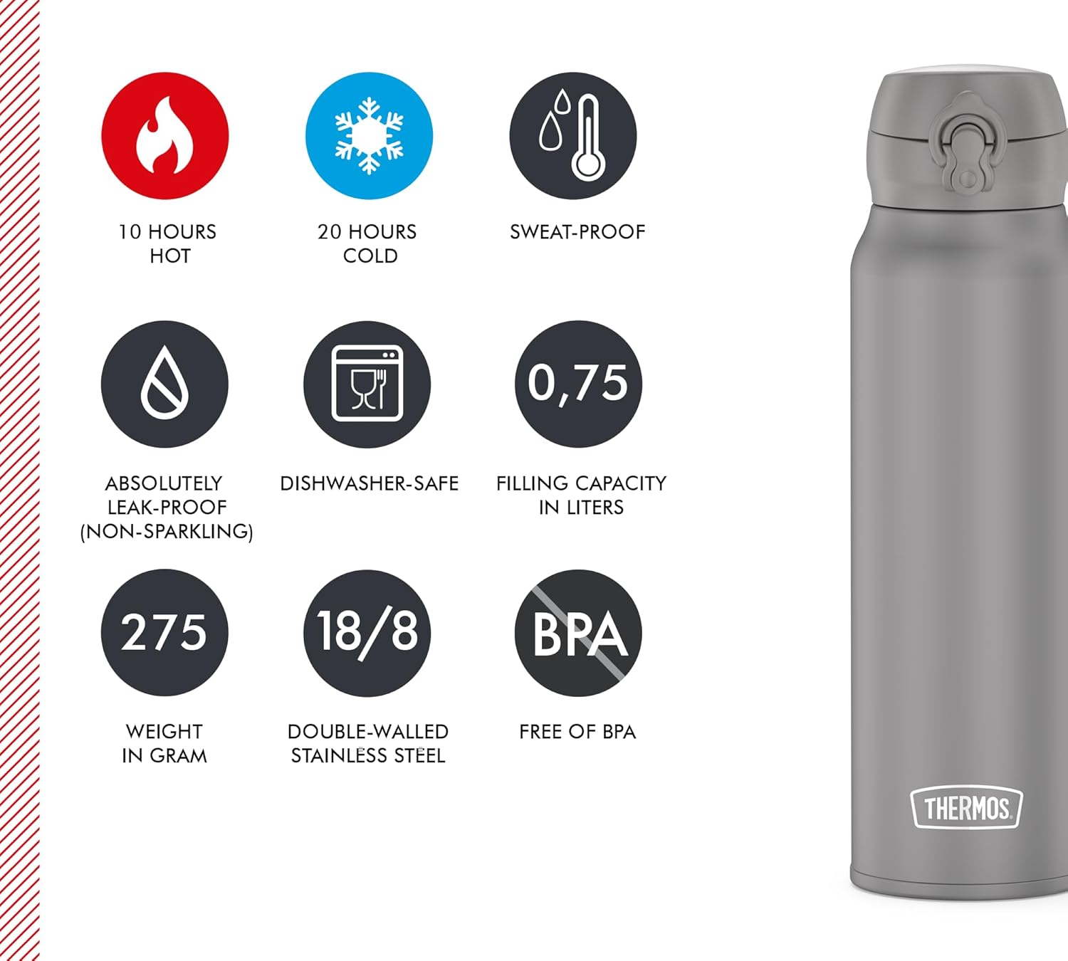 Informații despre acest articol EXTREM DE UȘOR: Nu este o coincidență, ci rezultatul perfecțiunii tehnologice. Cu un proces inovator de fabricație, termosul este cu până la 48% mai ușor decât sticlele comparabile. ABSOLUT ETANȘ: Fără scurgeri, fără picături! Deschiderea nedorită este prevenită suplimentar cu blocarea practică de siguranță pentru o securitate maximă (fără dioxid de carbon). TEMPERATURA DORITĂ A BĂUTURII: Tu decizi dacă vrei o băutură răcoritoare sau o băutură fierbinte. Performanța de izolare a sticlei este absolut remarcabilă: până la 10 ore fierbinte sau 24 de ore rece. CAPAC SIGUR DE CURGERE: Capacul special conceput pentru băuturi este indispensabil mai ales pentru băuturile fierbinți, deoarece performanța nu este o promisiune goală. Înghițitură cu înghițitură. CONSTRUIT PENTRU A DURA: Oțel inoxidabil robust 18/8 și componente perfect prelucrate. Cine alege o dată originalul, nu va mai dori să renunțe la acești însoțitori durabili și de încredere. › Mai multe detalii despre produs