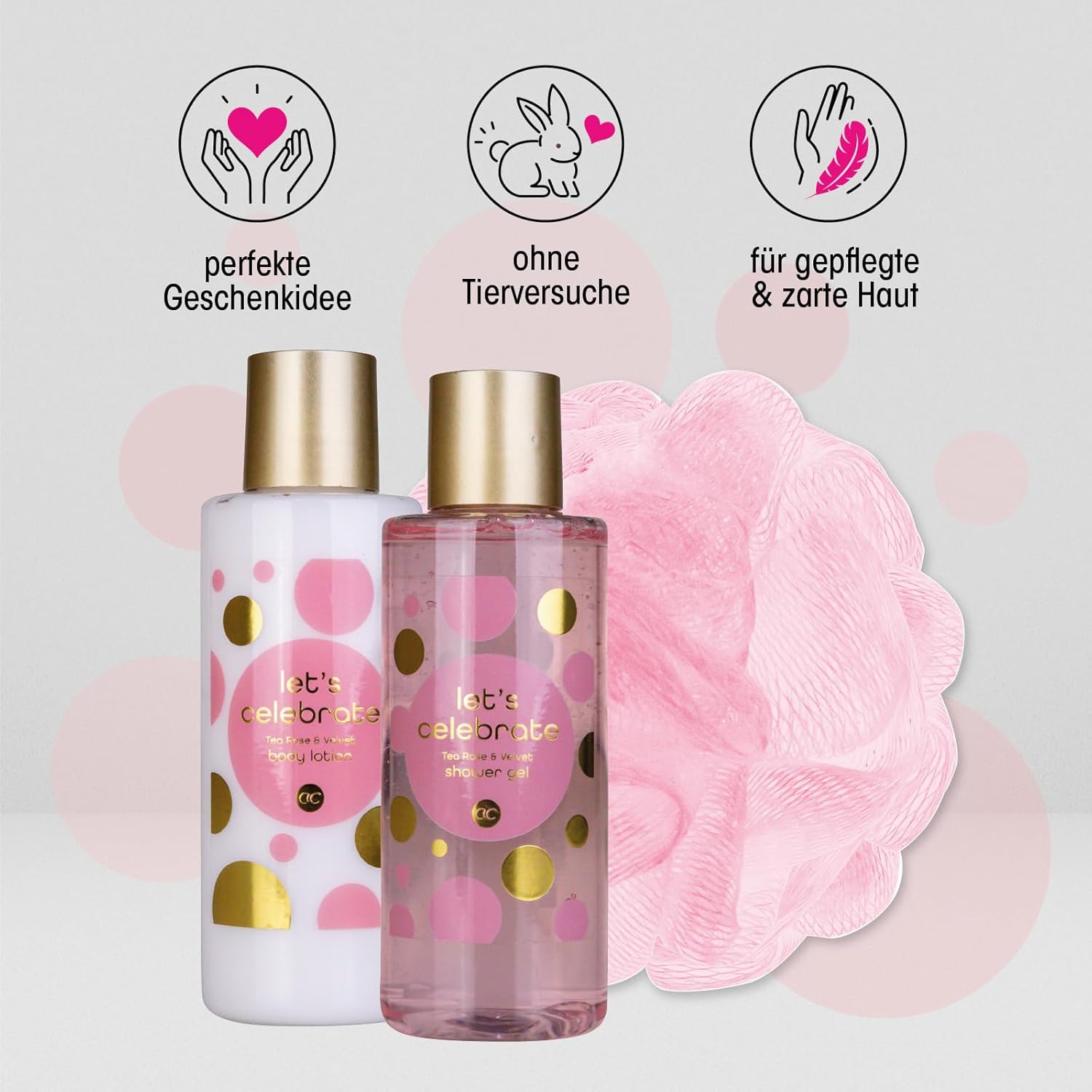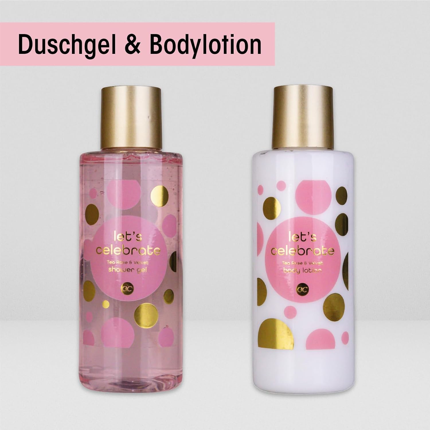 Set de răsfăț: Produsele de îngrijire cu parfum de trandafir de ceai și catifea răsfață pielea cu multă hidratare, lăsând-o delicată și suplă. Toate produsele vin deja într-o cadă elegantă. Idee perfectă de cadou: Cu acest set de duș, oferiți wellness acasă! Produsele parfumate sunt cadoul potrivit pentru orice ocazie, fie că este Paștele, Ziua Mamei, Ziua Îndrăgostiților, ziua de naștere sau Crăciunul. Garanția bunăstării: Aditivul de baie hrănitor și curățitor asigură o baie relaxantă. Ulterior, pielea poate fi unsă cu loțiunea de corp. Detalii produs: Setul de îngrijire din 3 piese conține tot ce ai nevoie pentru relaxare și bunăstare! 150ml gel de duș, 150ml loțiune de corp și un burete de plasă. DESCOPERĂ MAI MULT: Descoperă varietatea noastră mare de articole în domeniul îngrijirii corporale! Sortimentul nostru include o multitudine de seturi ambalate cu dragoste și accesorii neobișnuite pentru îngrijire, baie și cosmetice.
