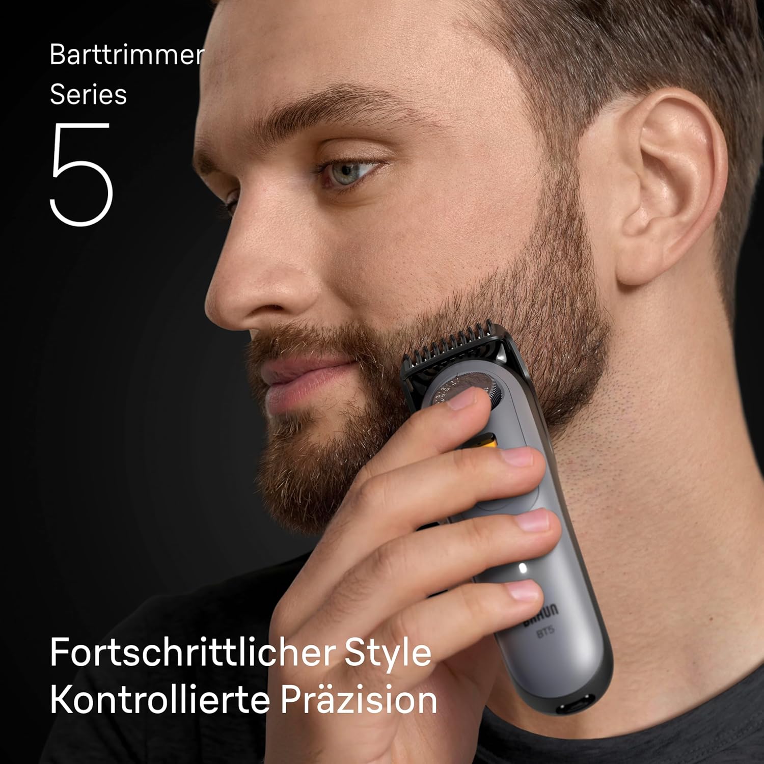 Braun Trimmer de Barba Seria 5: Stil impecabil la un click distanță. Rezultate convingătoare la fiecare trecere: Lama ultra-ascuțită prinde fără efort chiar și cele mai dificile fire de păr, asigurând o barbă tunsă uniform și eficient. Fără greșeli: Datorită butonului de blocare și a rotiței de precizie cu 40 de setări de lungime în trepte precise de 0,5 mm, păstrezi controlul deplin la fiecare tundere. Instrumente de styling de înaltă calitate: Tunsori, contururi și detalii cu instrumentele potrivite pentru margini curate și finisaje uniforme. Durabil: Trimmer de barbă 100% rezistent la apă pentru bărbați, cu o baterie puternică Li-Ion pentru până la 120 de minute de utilizare fără fir.