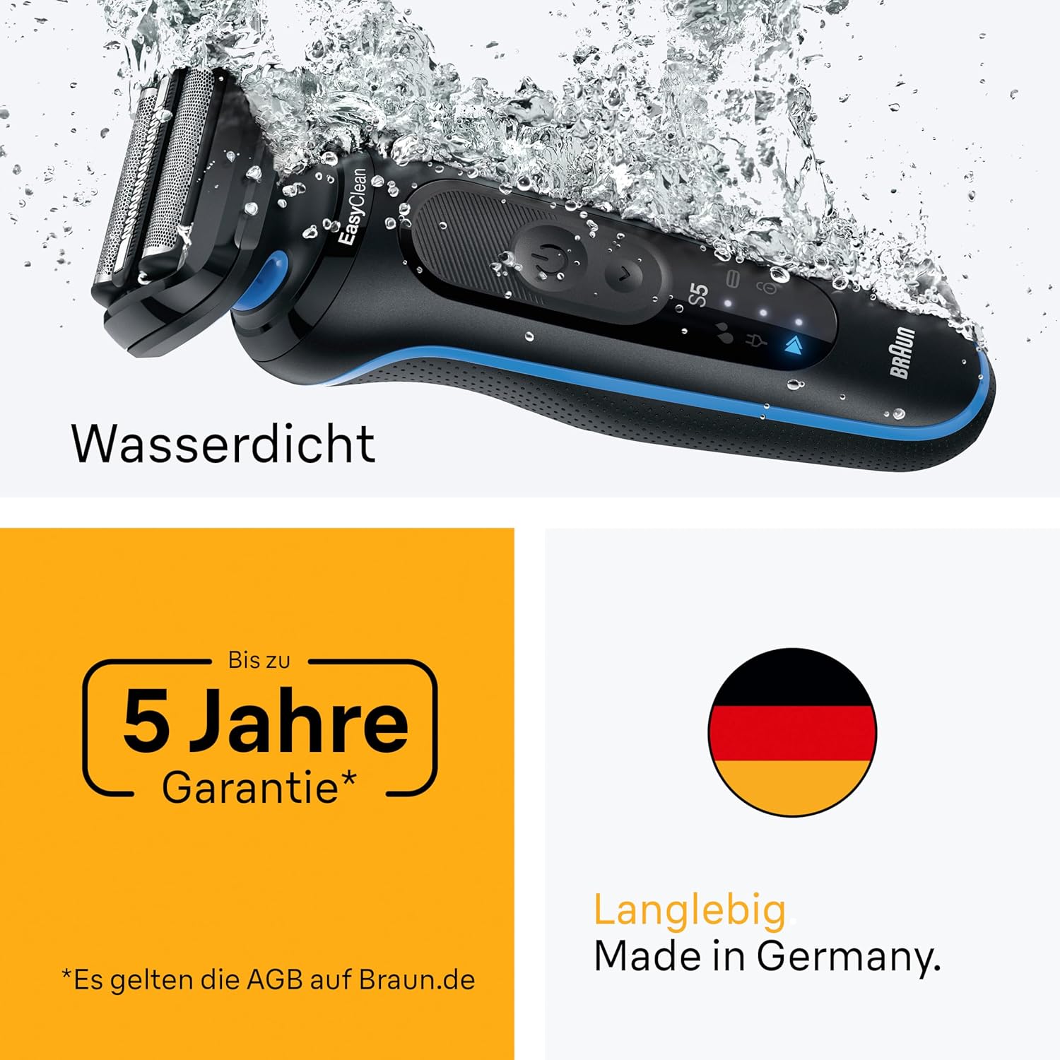 Fabricat în Germania, durabil, ani la rând: 100% rezistent la apă pentru utilizare umedă și uscată; până la 50 de minute de funcționare cu baterie Li-Ion și încărcare rapidă de 5 minute pentru un bărbierit