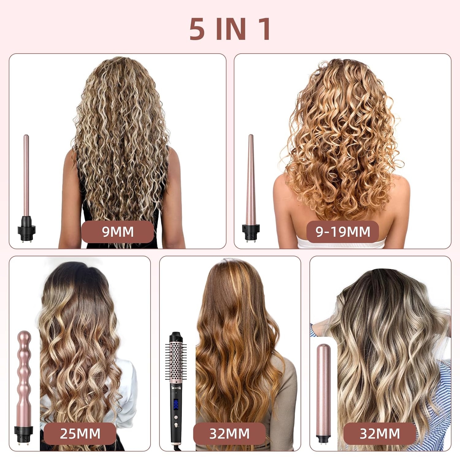 【Set ondulator de păr 5 în 1】Ondulator de păr cu 5 butoaie de diferite dimensiuni (9mm/9-19mm/25mm/32mm/32mm). Ideal pentru bucle lejere, relaxate, mai mult volum și pentru coafarea bretonului.