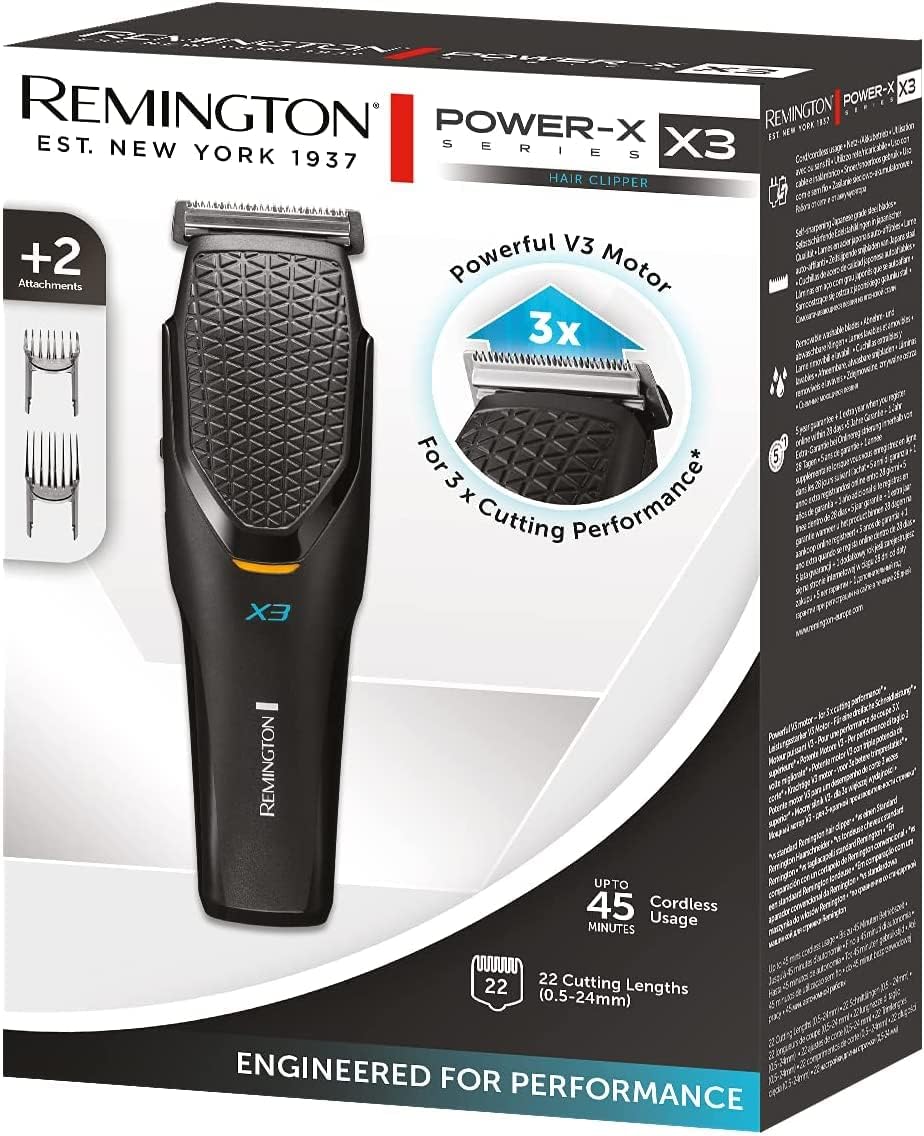 Descriere produs: 2 piepteni reglabili Comfort Glide (3-24 mm; 0,5 mm fără pieptene) Buton individual de reglare a lungimii pentru trepte de 1 mm, pentru 22 de setări de lungime Lame din oțel inoxidabil cu auto-ascuțire Performanță de tăiere triplă cu motor V3 vs. mașini de tuns standard Remington Funcționare cu cablu/acumulator, până la 45 de minute autonomie Afișaj LED Design ergonomic cu mâner anti-alunecare Funcție de încărcare USB.