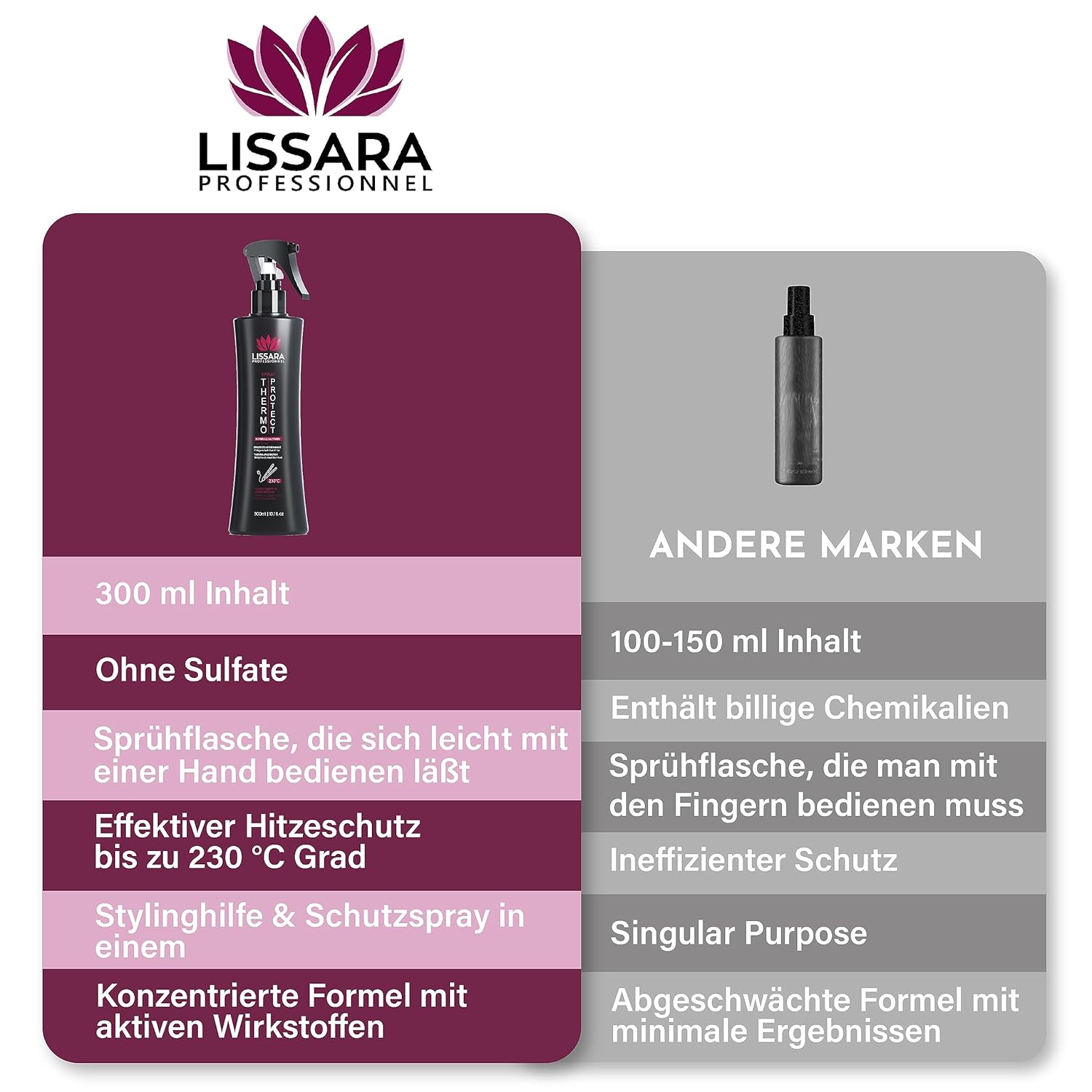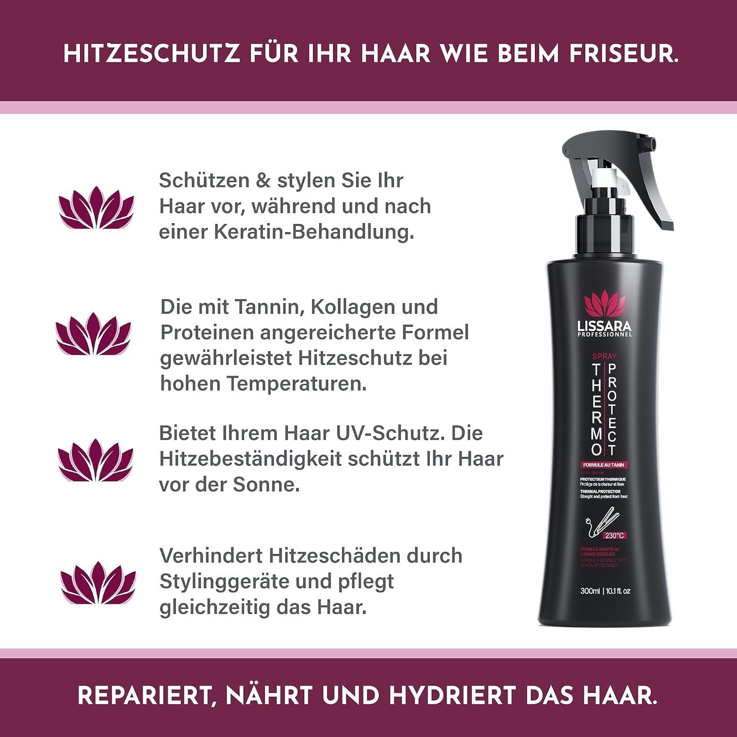 Info despre acest articol THERMO PROTECT de la Lissara este un produs multifuncțional care vă permite să vă protejați și să vă coafați părul înainte, în timpul sau după o îndreptare braziliană. PROTECTOR: Formula sa cu tanin, colagen și proteine asigură o protecție termică a părului la temperaturi ridicate în timpul utilizării plăcilor de până la 230°C. HRĂNITOR: Vă permite să vă refaceți, hrăniți, hidratați părul, să creșteți durabilitatea culorilor, să reparați fisurile din cuticula părului și, în același timp, să oferiți o barieră termică optimă. STRĂLUCITOR: Îndreptați-vă părul cu încredere, hrănindu-l și hidratându-l și conferindu-i strălucire. ÎNDREPTARE BRAZILIANĂ: Formula potrivită pentru orice tip de îndreptare braziliană, pentru a proteja părul în profunzime în timpul aplicării tratamentului.