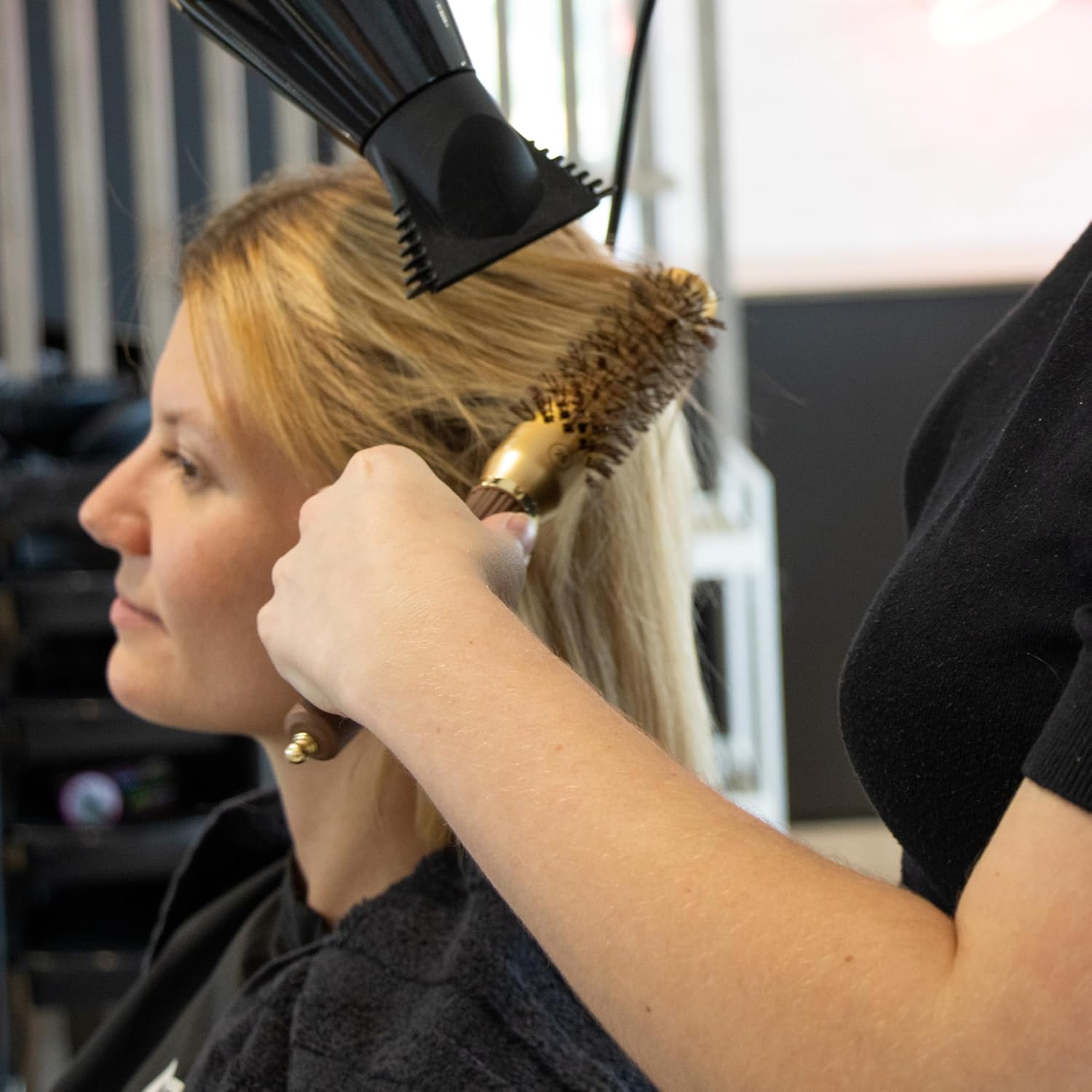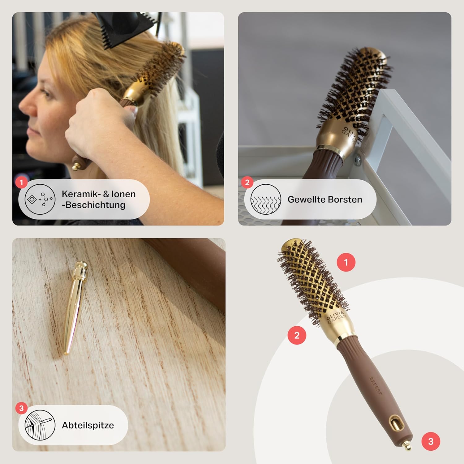 Perie rotunda profesionala 25 mm cu tehnologie ceramică și ioni pentru uscare rapidă, volum și strălucire, antistatică și anti-frizz. Mâner ergonomic pentru un control maxim. Ideală pentru păr scurt și mediu.
