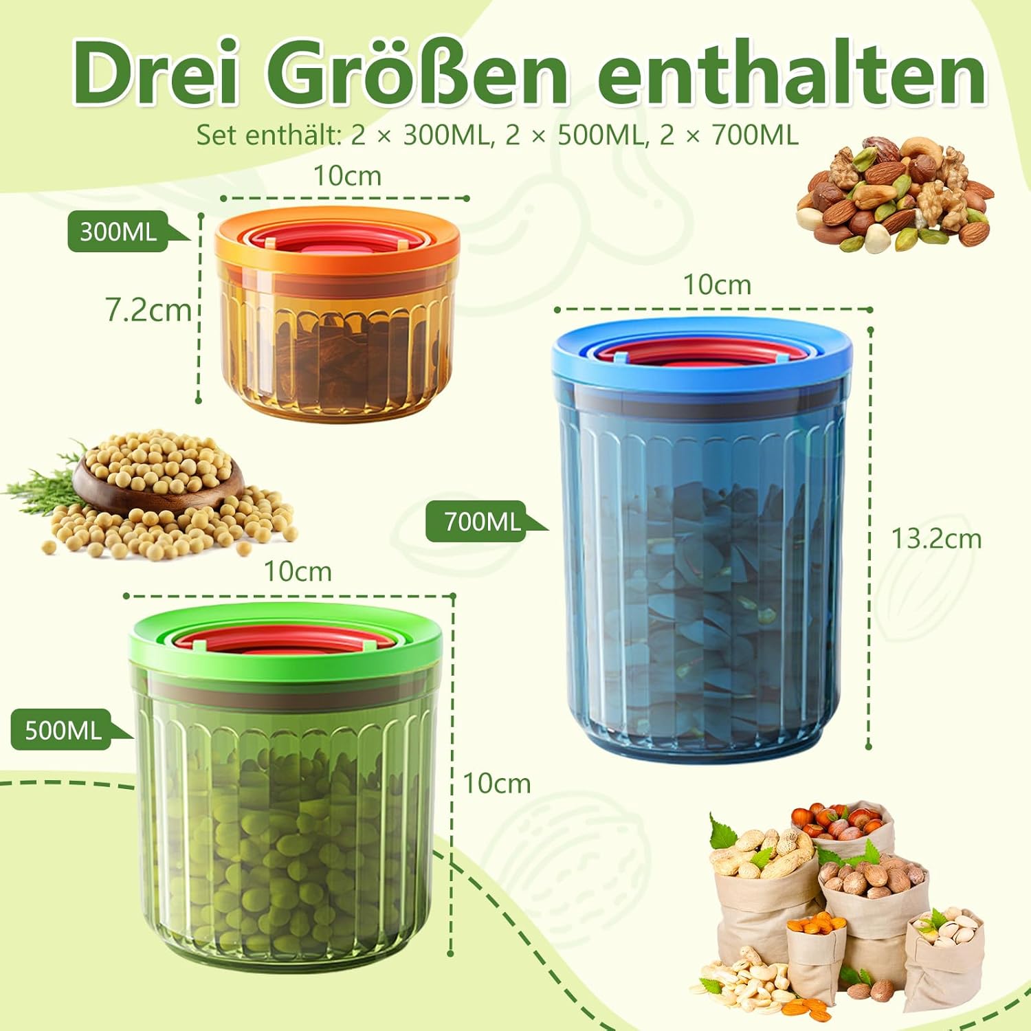 Set de 6 piese în 3 dimensiuni Conține 2 × 300 ml (10 oz), 2 × 500 ml (17 oz) și 2 × 700 ml (24 oz) - perfect pentru diferite nevoi de depozitare în bucătărie, cămară sau birou.