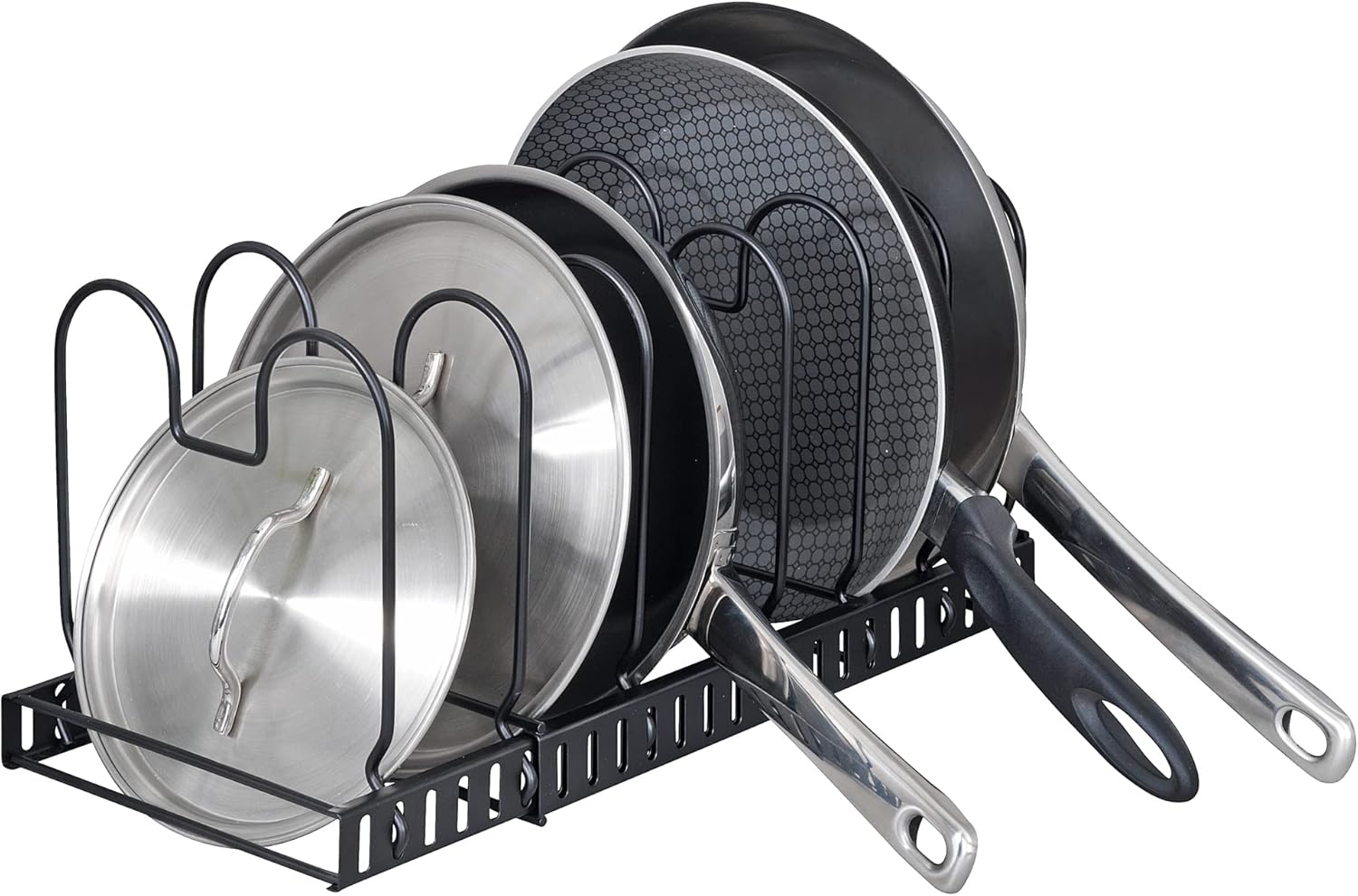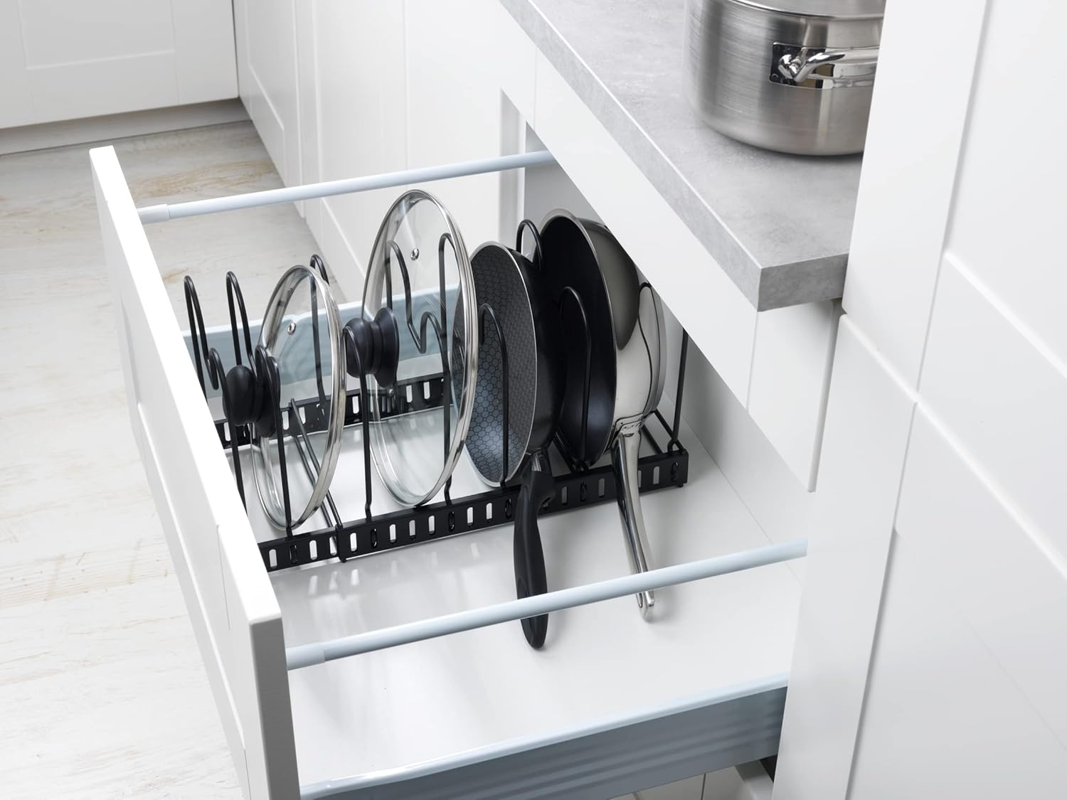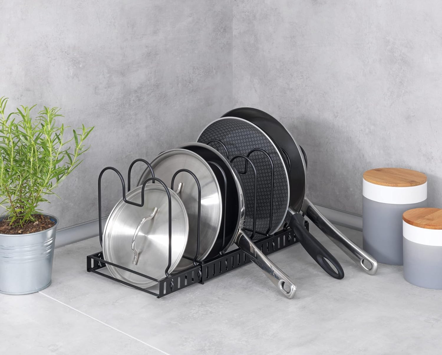Design industrial: Suportul trendy pentru tigăi și capace, în stil industrial, oferă fiecărei bucătării o notă specială, într-un negru la modă.
