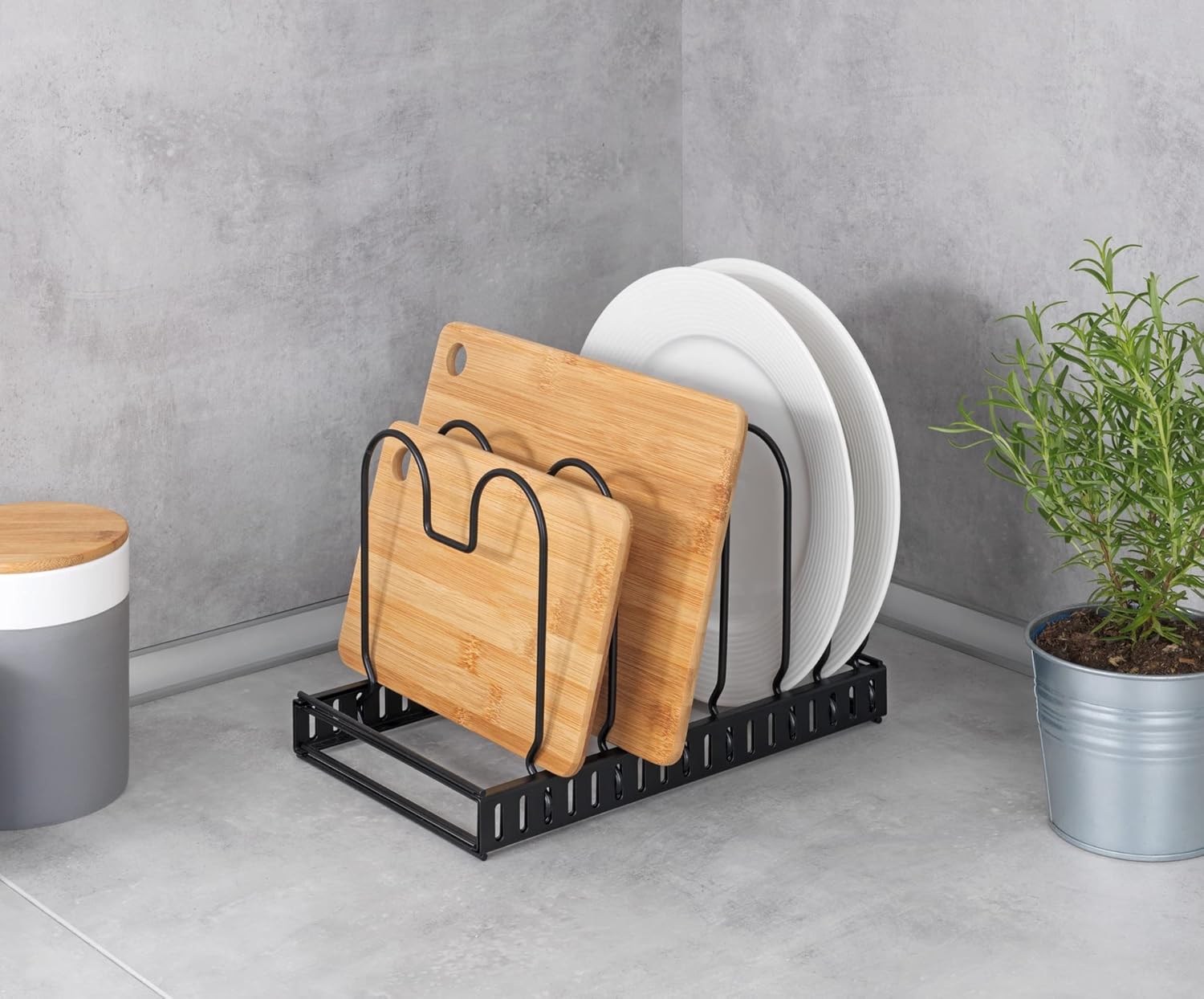Depozitare cu economie de spațiu: Suportul modern pentru vase oferă, cu cele 6 compartimente, spațiu de depozitare clar pentru tigăi, capace, tăvi de copt, veselă, forme de copt, tocătoare.