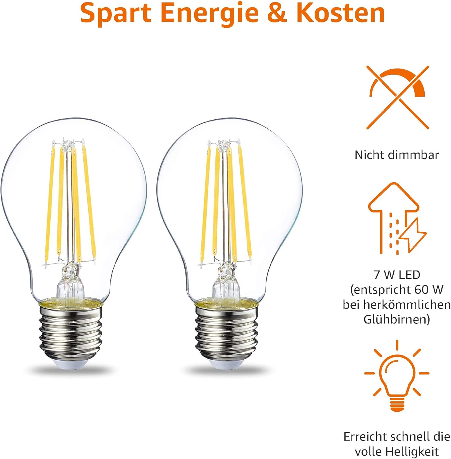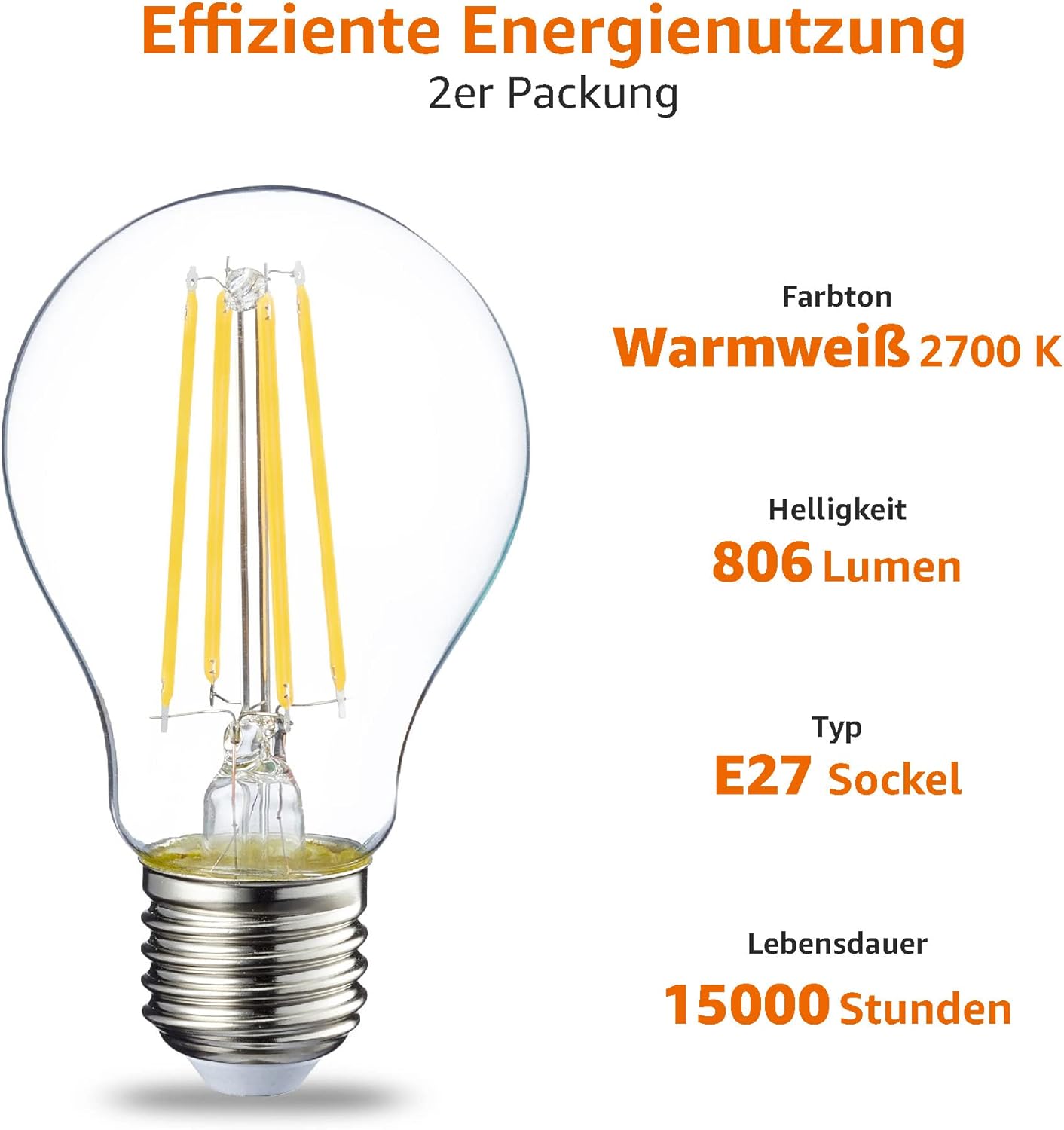 Despre acest articol Cu o durată de viață de 15.000 de ore, acest bec va dura mai mult de 13 ani (bazat pe 3 ore/zi) Luminozitate instantanee de 806 lumeni; fără timp de așteptare pentru luminozitate maximă Cu o temperatură de culoare de 2.700 Kelvin, acest bec oferă o lumină albă caldă, creând o atmosferă confortabilă în orice cameră Cu un consum de 7 wați și costuri anuale de funcționare de numai 2,22 €, această lampă vă poate economisi până la 88% din costurile anuale cu energia electrică și 230,57 € pe întreaga durată de viață a lămpii, comparativ cu lămpile cu incandescență comparabile (pe baza unei durate de iluminare de 3 ore/zi și a unui preț de 0,29 €/kWh; aceste valori pot varia în funcție de prețul energiei electrice și de durata de iluminare/zi) Redare înaltă a culorilor (CRI>80) pentru culori vii și naturale Acest bec transparent combină tehnologia LED modernă și filamentele clasice pentru un aspect retro nostalgic. Bec nediminuabil, nu funcționează cu variator de intensitate Alte detalii despre produs