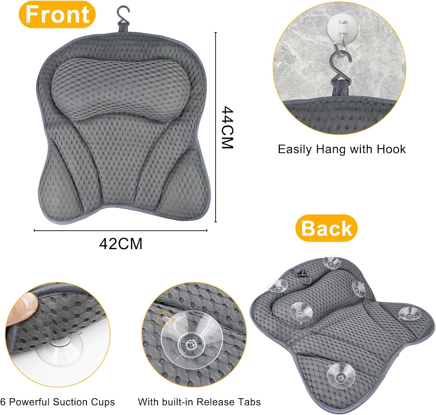【Ventile de aspirație fără alunecare】 Această pernă de baie este echipată cu 6 ventuze puternice care sunt fixate ferm și pot crea putere de aspirație pe suprafețe netede. Fiecare ventuză are o piesă de eliberare încorporată care este ușor de îndepărtat. Puteți regla înălțimea corespunzătoare în funcție de înălțimea dvs. preferată.