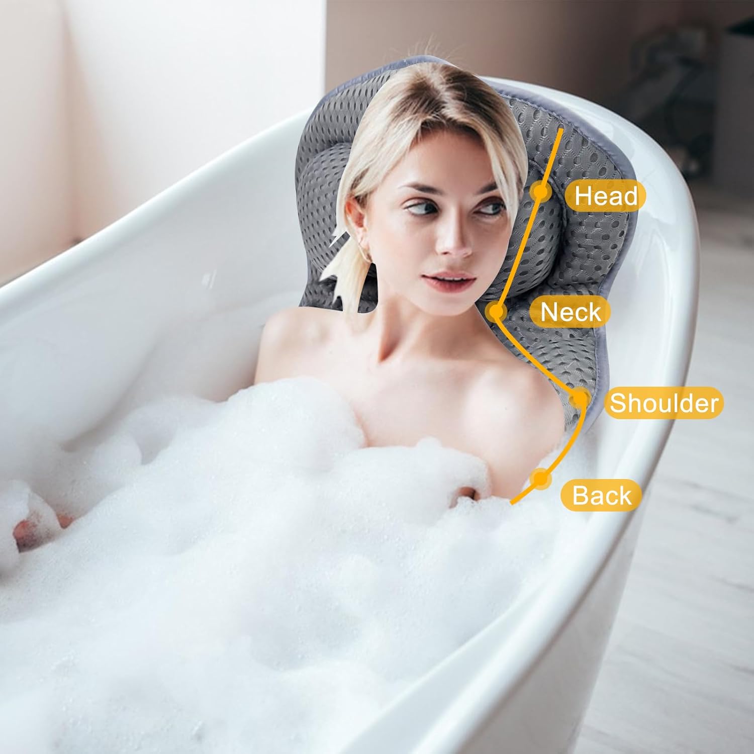 【Utilizare versatilă】 Această pernă de baie este practică și confortabilă, potrivită pentru diferite tipuri de corp și vârste, ideală pentru baie, jacuzzi și spa-uri, ajută la ameliorarea mușchilor dureroși și a stresului și este o alegere ideală pentru o baie relaxantă.