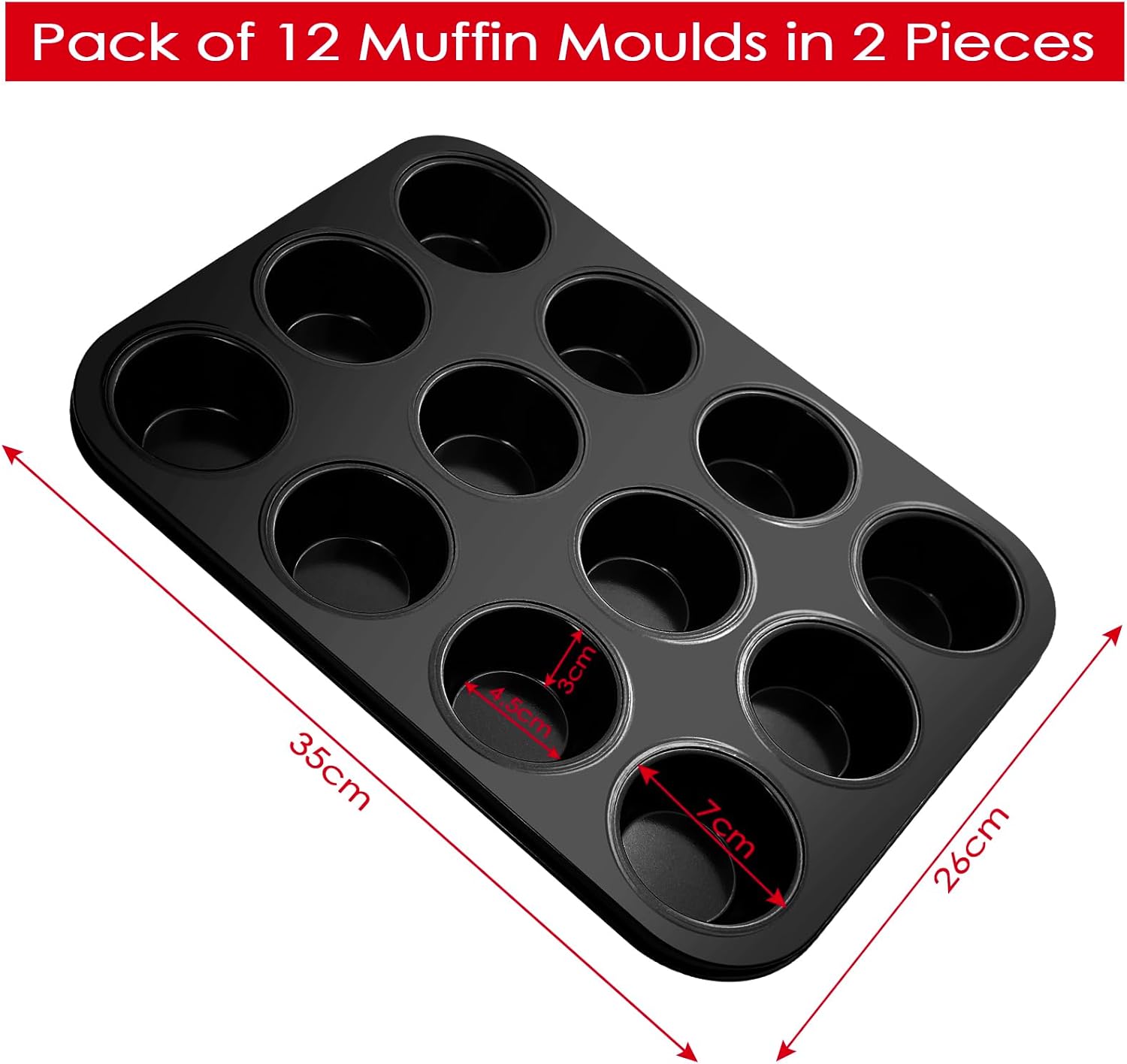【Design perfect】Dimensiunea tăvii pentru brioșe 2×12: 35×26×3,5 cm, cu 12 forme standard pentru brioșe, dimensiunea formelor: ø7×ø5×3 cm. Se pot coace 12 brioșe simultan, iar maximum 24 de brioșe pot fi coapte pe fiecare tavă.