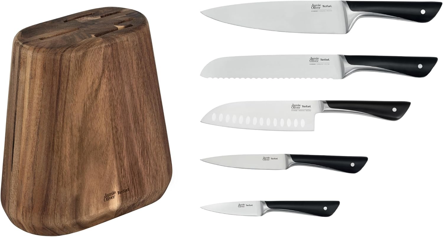 Informații despre acest articol CONȚINUTUL SETULUI: Cuțit de curățat 9 cm, Cuțit utilitar 12 cm, Cuțit de bucătar 20 cm, Cuțit Santoku 16,5 cm, Cuțit de feliat pâine 20 cm, Bloc din lemn de salcâm ULTIMUL SET DE CUȚITE PENTRU GĂTIT DE JAMIE OLIVER ȘI TEFAL: Jamie Oliver și Tefal sunt perechea perfectă pentru bucătărie. Jamie aduce pasiunea și cunoștințele despre mâncare, iar Tefal oferă tehnologia și performanța. Împreună realizează de aproape două decenii produse fiabile și de înaltă calitate care fac din gătitul de la zero o adevărată plăcere. Aceasta este alegerea inteligentă pentru mâncarea reconfortantă DURATE LA GHEAȚĂ PENTRU PERFORMANȚĂ MAXIMĂ: Aceste lame din oțel inoxidabil german de înaltă calitate sunt durificate la gheață. Un șoc termic le scade temperatura de la 1000°C la -120°C, făcându-le rezistente și durabile "TOT CE VREȚI SĂ PREPARAȚI ȘI SĂ GĂTIȚI: Cu acest fantastic set de cuțite din cinci piese, sunteți bine echipat. Tăiați pâinea crocantă, filetați peștele, scobiți ardeiul iute, tăiați fructele și tocați legumele cu ușurință - există un cuțit de înaltă calitate pentru fiecare tip de preparare, depozitat într-un frumos bloc din lemn de salcâm. Ce mai așteptați? Să începem să gătim!" - Jamie Oliver Alte detalii despre produs