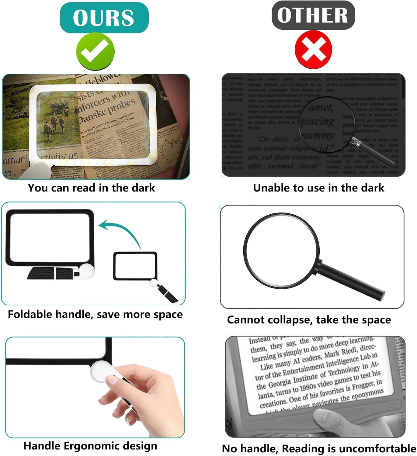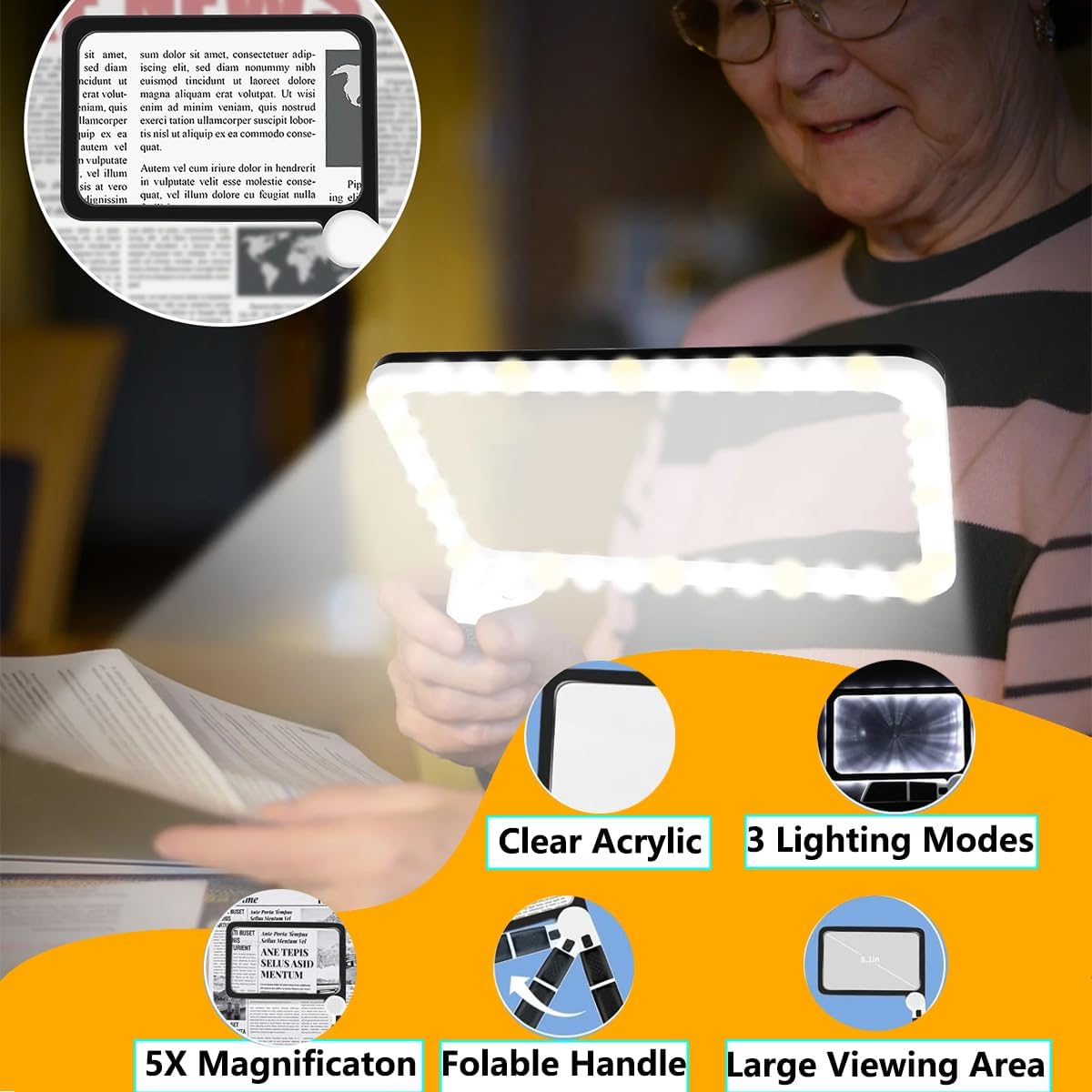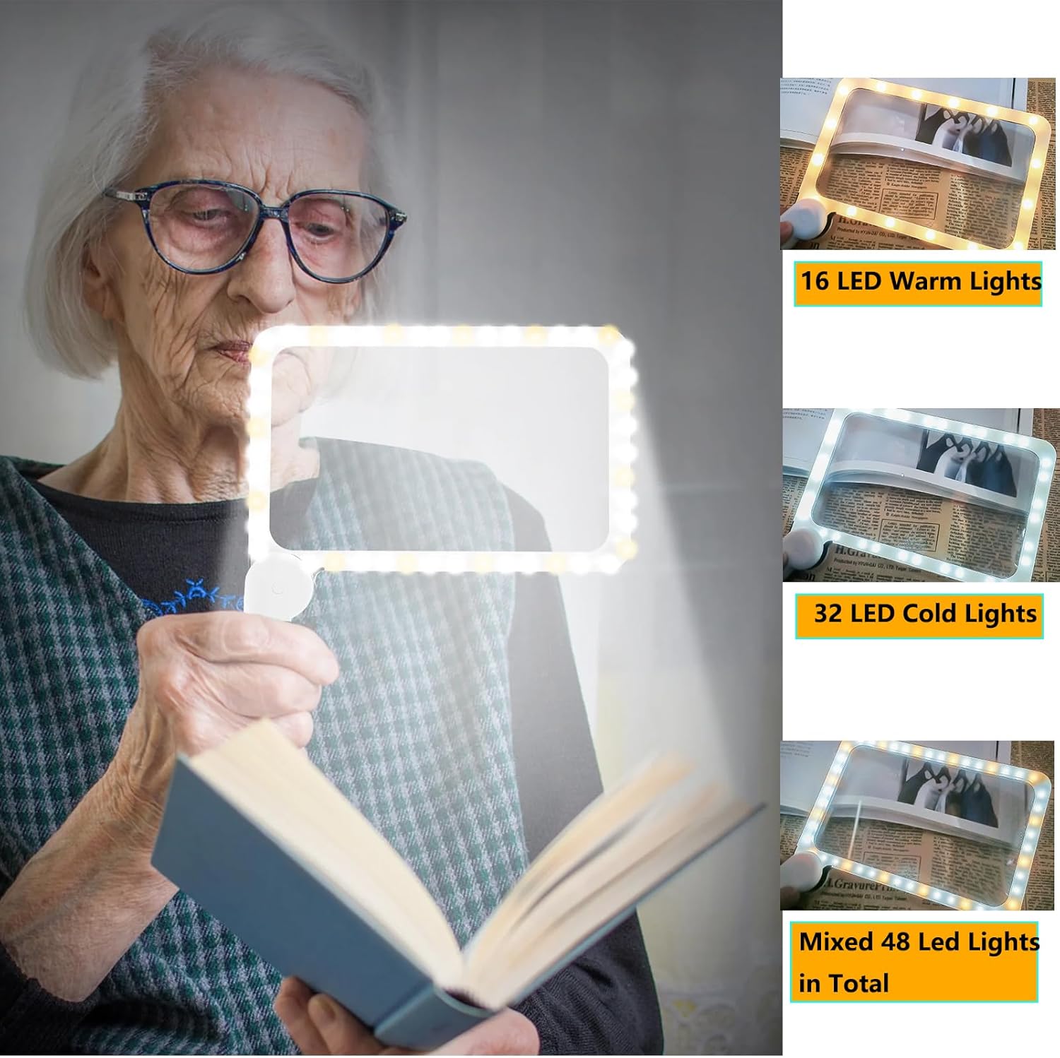 48 de LED-uri ultra-luminoase cu 3 moduri: Această lupă cu lumină are 3 moduri pentru a vă optimiza experiența de lectură. Cele 48 de lumini LED încorporate oferă o luminozitate îmbunătățită pentru citire chiar și în medii slabe sau întunecate. Funcția reglabilă vă permite să alegeți între opțiunile de iluminare rece, caldă și mixtă, în funcție de nevoile dvs. de iluminare. Această funcție poate contribui la reducerea oboselii vizuale, ceea ce o face deosebit de benefică pentru degenerescența maculară sau hipermetropie.