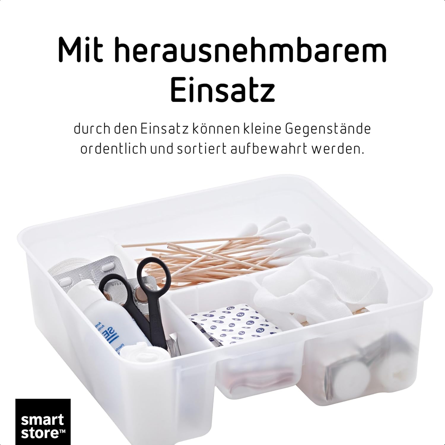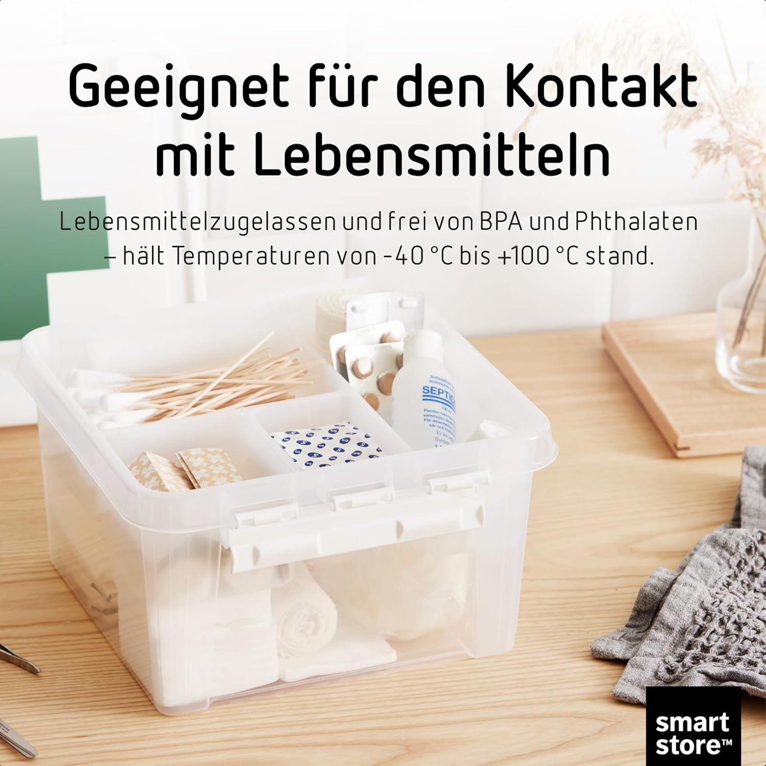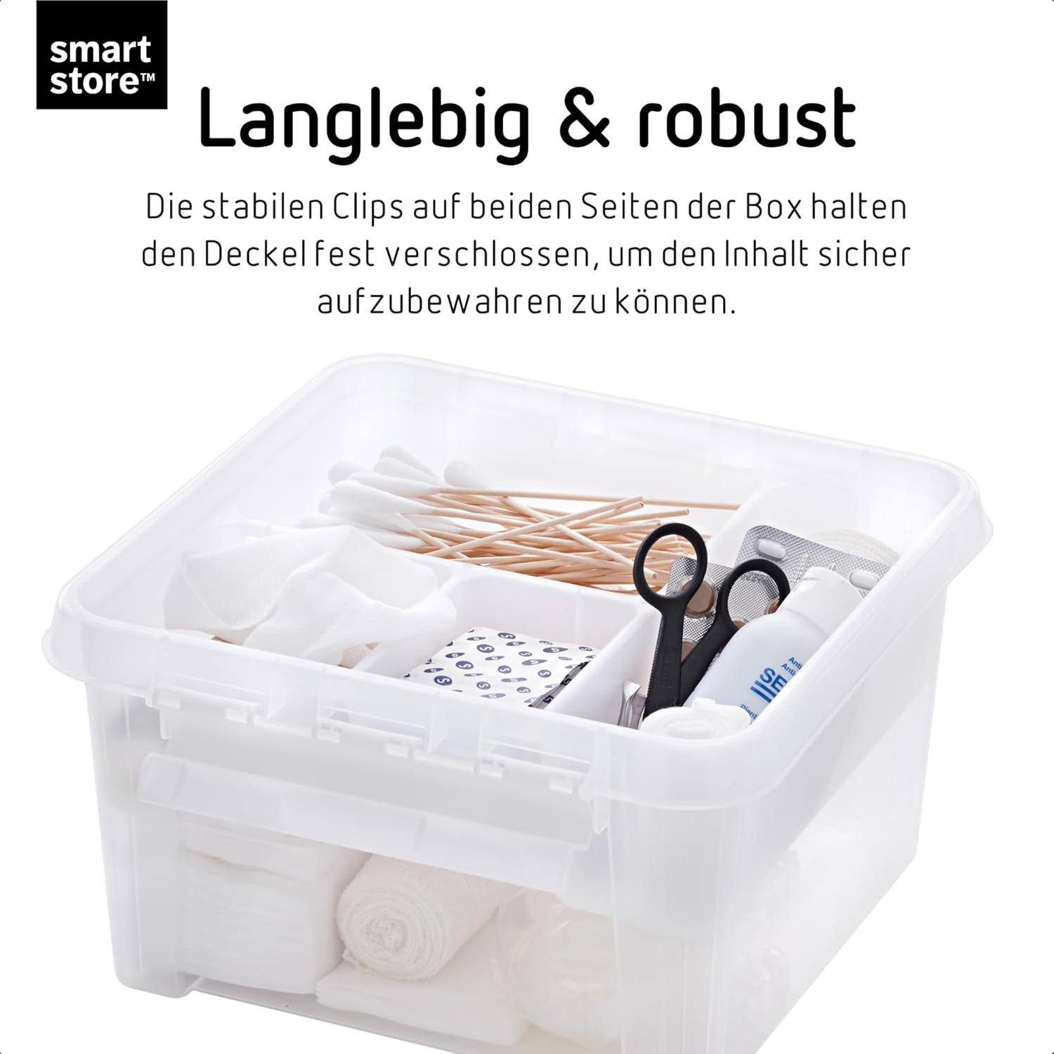 Informații despre acest articol Cutie de prim ajutor cu capac și inserție pentru depozitarea obiectelor mici și cu închidere cu clemă Culoare: Cutie transparentă / Inserție și capac albe Dimensiuni / Volum: 28x28x17 cm / 8 litri Material: Polipropilenă Rezistență la temperatură: -40 până la +120⁰C Alte caracteristici: Fabricat în Suedia, 10 ani garanție, sigur pentru alimente, stivuibil SmartStore este liderul scandinav pe piața sistemelor generale de depozitare. Conceptul unic include o gamă largă de dimensiuni de cutii, modele, culori și inserții. › Mai multe detalii despre produs