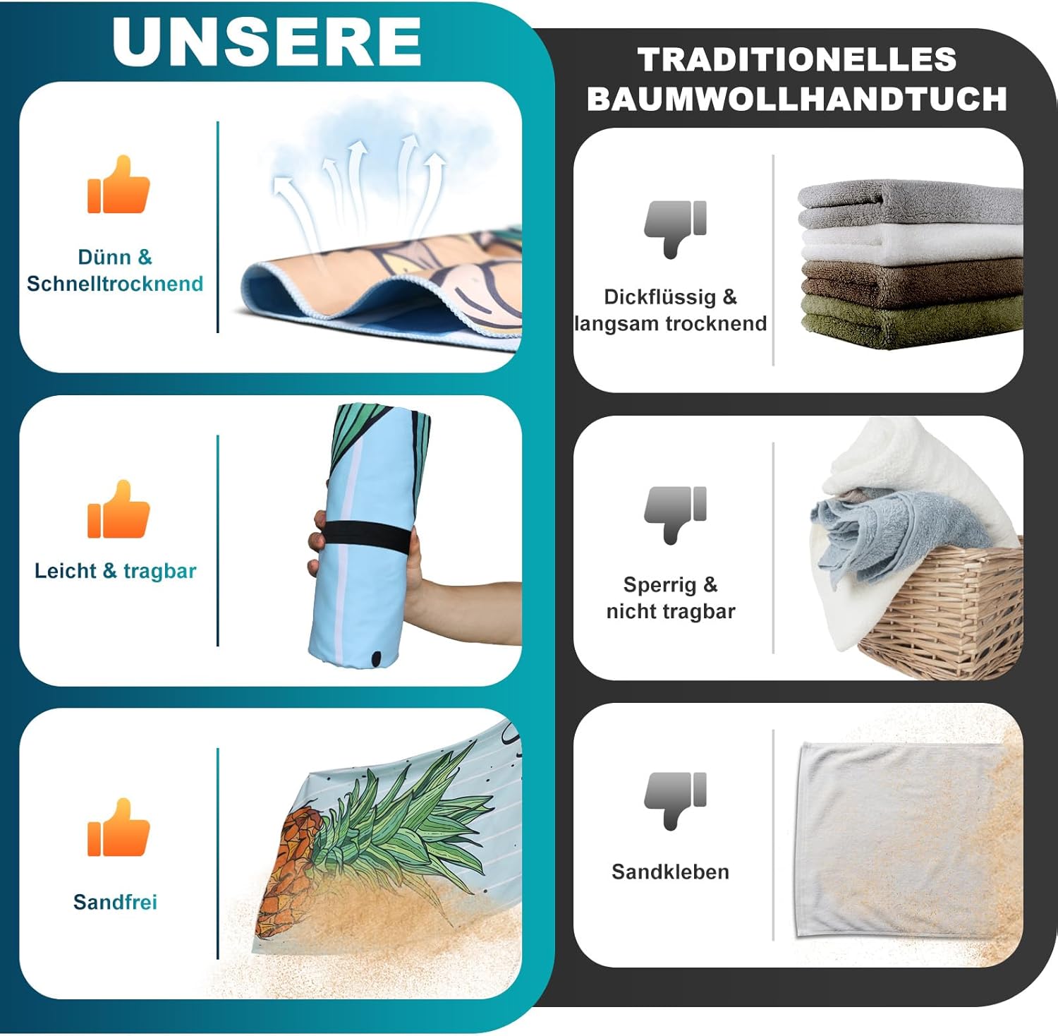 Informații despre acest articol PROSOP DE PLAJĂ IMPRIMAT PE AMBELE PĂRȚI MARE: Fiecare parte a prosopului de plajă ușor are un model unic; Un prosop din microfibră este de două ori mai distractiv; Chiar și după multe spălări, modelul rămâne luminos și colorat PROSOP DE PLAJĂ DE GREUTATE MARE DE 250GSM: Prosopul nostru de plajă este fabricat din țesătură groasă de 250gsm și este mult mai absorbant comparativ cu prosopul de baie obișnuit din microfibră de 200gsm, astfel încât să vă puteți usca corpul mai repede și să aveți o experiență confortabilă PROSOP DE PLAJĂ MARE DE 180X100 CM: Acest prosop de baie cu uscare rapidă este fabricat din 88% poliester și 12% nailon; este mai moale pe piele și poate fi folosit pe plajă, în piscină, în baie, în spa, în sala de sport, la picnic, în timpul yoga, în saună și în alte locuri TOALETĂ DE PLAJĂ FĂRĂ NISIP: Atunci când este folosită pe plajă, este dificil ca nisipul să ajungă pe ea. Scuturându-l ușor, nisipul cade, oferindu-vă o experiență plăcută PROSOP DE PLAJĂ UȘOR: Este incredibil de aproape de piele, oferindu-vă un confort de neegalat, fiind în același timp extrem de ușoară, astfel încât să o puteți depozita cu ușurință în geanta de plajă și să o luați cu dvs. oriunde ați merge. Mai multe detalii despre produs