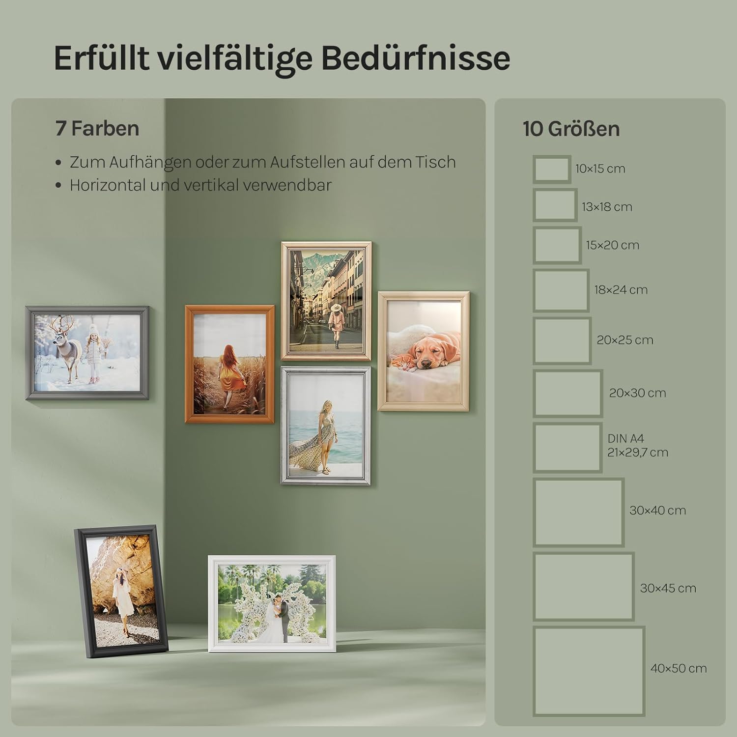 RAMA FOTO MULTIFUNCȚIONALĂ: Există un cârlig pe partea din spate a ramei pentru postere, flexibil pentru decorarea pereților și a mesei. De asemenea, rama foto este echipată cu picioare de sprijin pe ambele părți pentru a asigura o poziționare stabilă pe orizontală sau verticală (de la 30x72 cm fără picioare de sprijin)