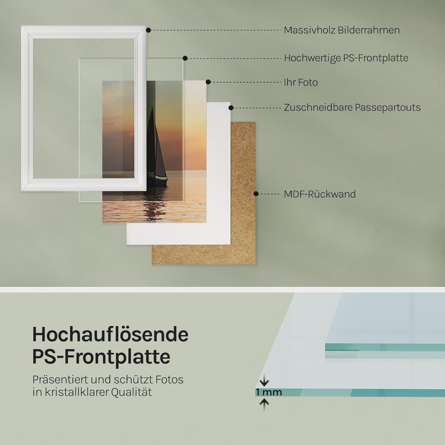 MATERIALE DE ÎNALTĂ CALITATE: Rama de lemn este fabricată din lemn masiv de înaltă calitate și o placă PS foarte transparentă. Acesta este rezistent la praf și umiditate, ușor de curățat, robust și durabil. Clemele din oțel inoxidabil facilitează înlocuirea fotografiilor