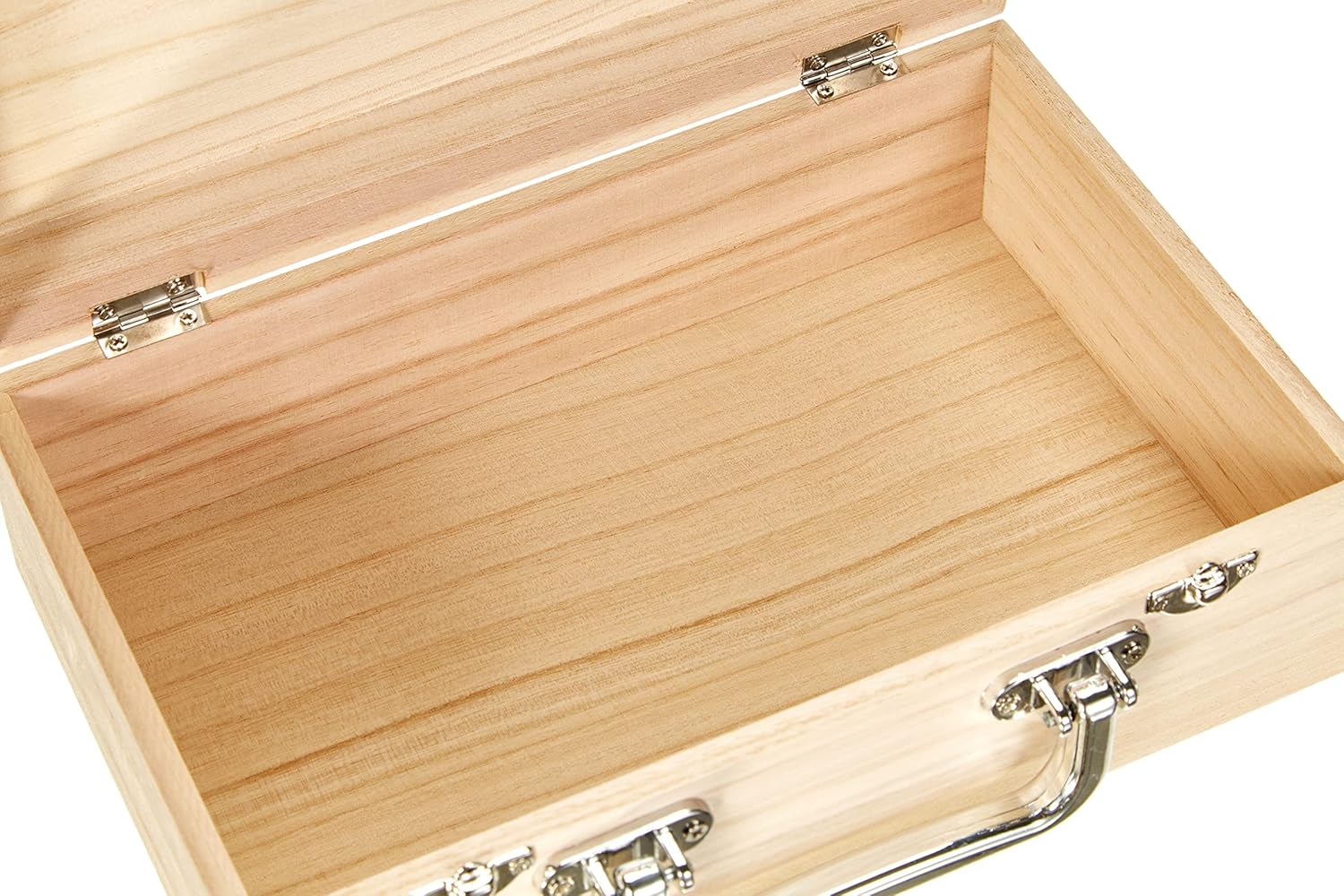 Despre acest articol: Cutie frumoasă din lemn, lungime 25 cm, lățime 16 cm, înălțime 9 cm, cu două închizători metalice argintii de înaltă calitate cu balamale și un mâner stabil din plastic cu aspect metalic, fără compartimentare interioară. Lemnul provine de la arborele Paulownia. Suprafața netedă a cutiei din lemn natur, nelăcuită, și granulația uniformă sunt ideale pentru multe idei de artizanat. Lipită cu tehnica șervețelului, hârtie DecoMaché și Decopatch sau material textil, pictată de exemplu în tehnica Shabby Chic, Decopatch, decorată cu fierul de pirogravat, posibilitățile de design ale cutiei de ustensile sunt versatile. Cutia practică de ustensile este versatilă. Pentru depozitarea suvenirurilor, stilourilor, bibelourilor, fotografiilor, cărților poștale sau ca o cutie de bijuterii, ață de cusut și multe altele. Practic și frumos, pentru mari și mici, natur sau creativ decorat, acest cufăr din lemn este versatil. Mai multe detalii despre produs