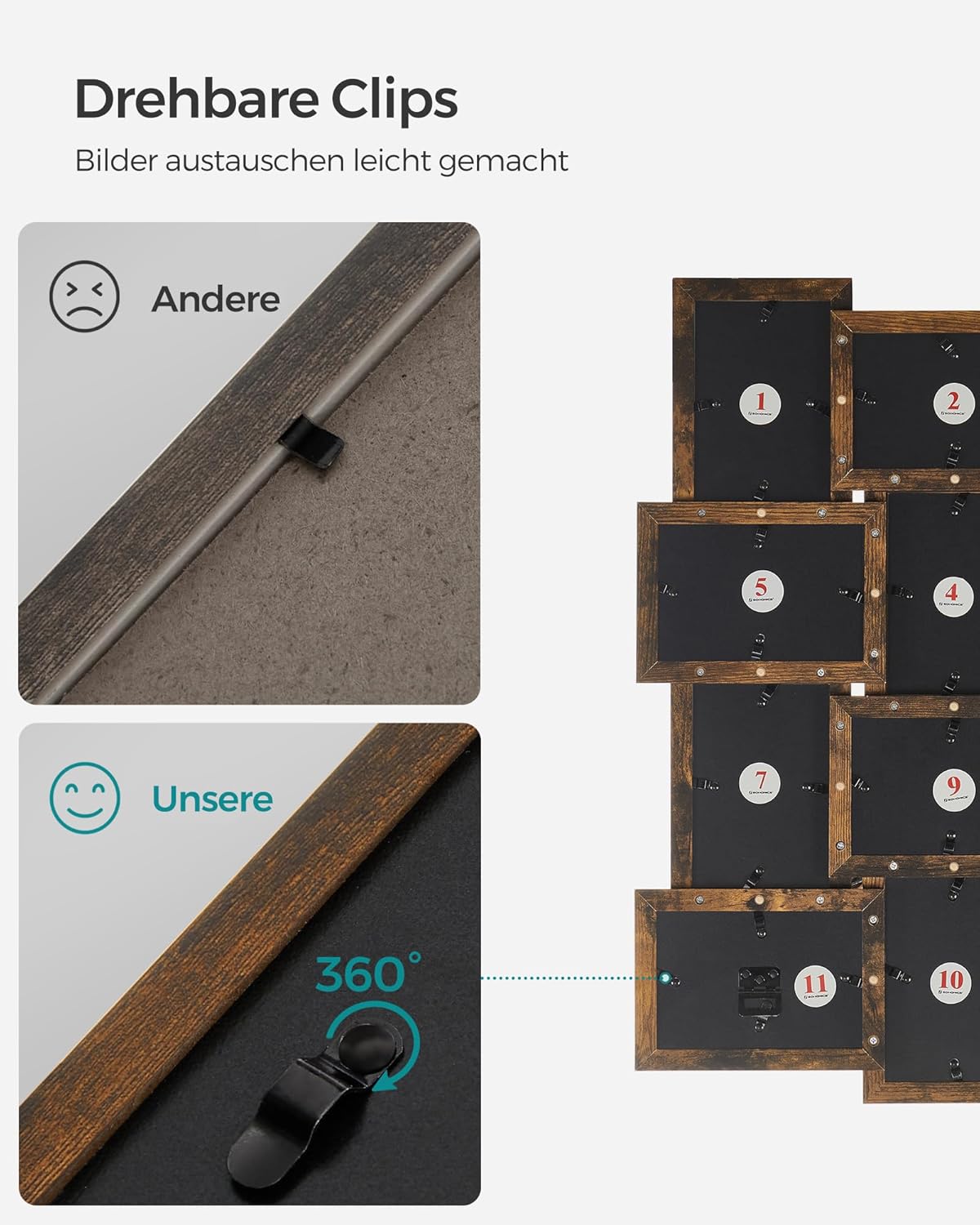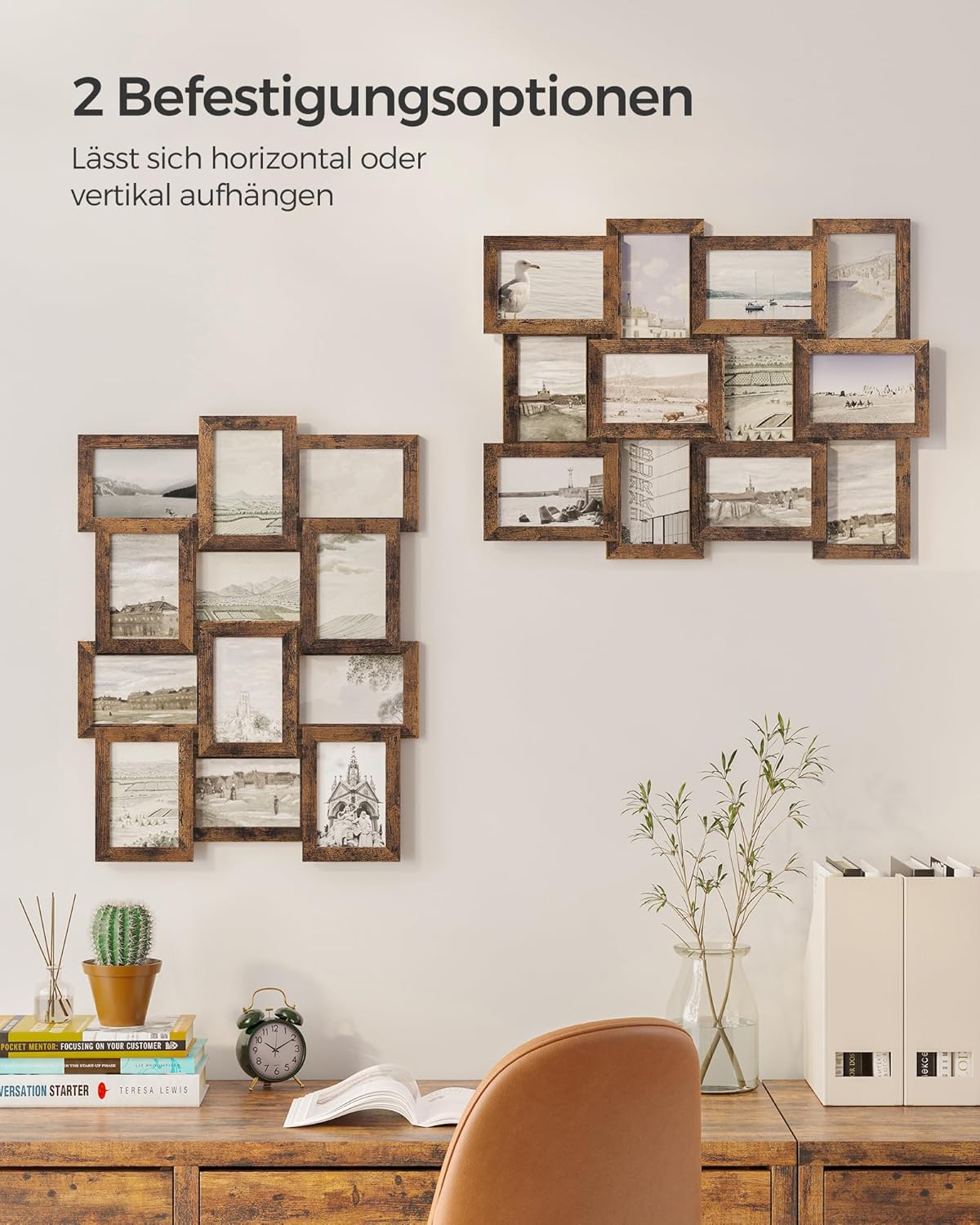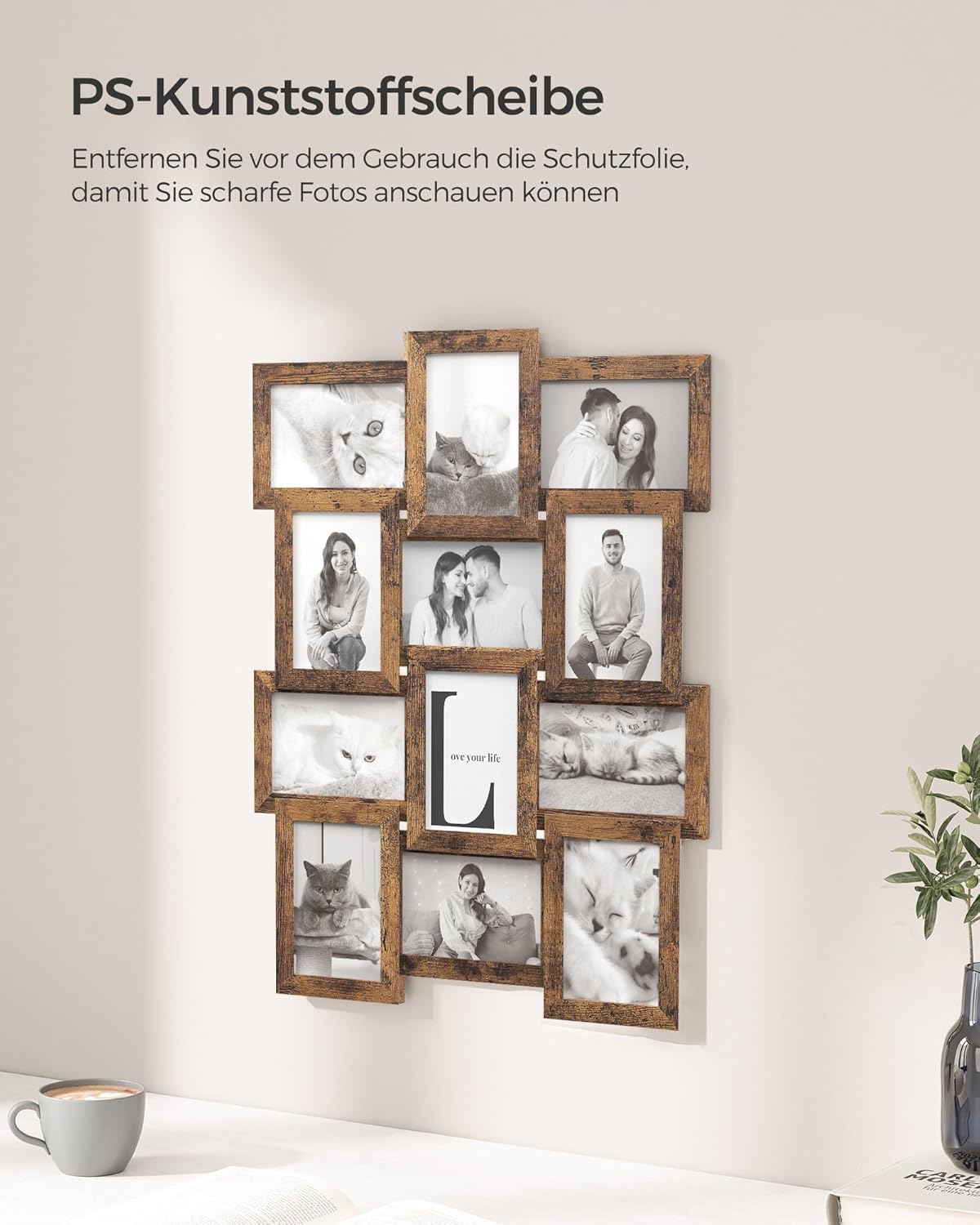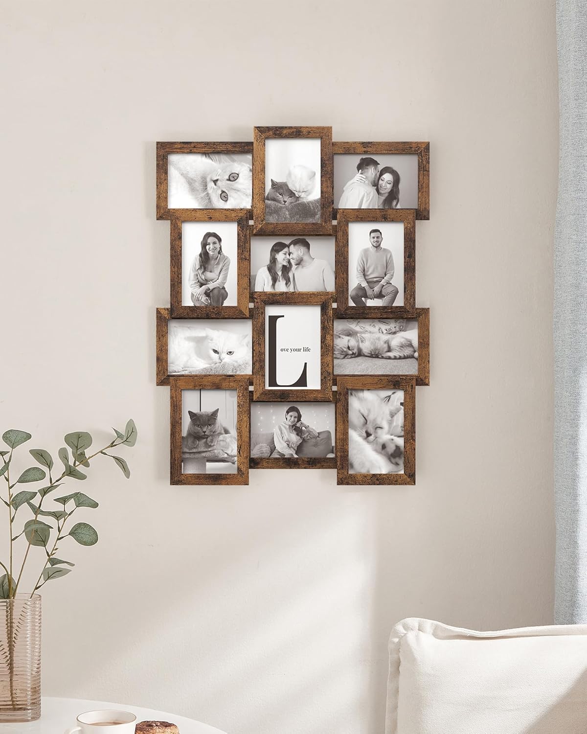Informații despre acest articol [Colaj cu 12 rame] Acest set oferă un aspect "puzzle" de 12 rame foto atractive, fiecare dintre acestea fiind perfectă pentru fotografii de 10 x 15 cm. Acest lucru vă permite să capturați și să prezentați momentele dvs. preferate într-un mod minunat [Ușor de asamblat] Cu rame foto numerotate și instrucțiuni clare, asamblarea acestui colaj foto este floare la ureche și îl puteți monta fără efort pe perete [Durabil] Aceste rame sunt fabricate din MDF robust și, prin urmare, sunt foarte durabile. Discul din polistiren oferă o vedere clară a fotografiilor dvs. și le păstrează durata de viață [Ușor de introdus sau înlocuit] Cu acest colaj de rame foto negre, puteți înlocui fiecare imagine individual, deoarece fiecare ramă are propria deschidere. Clemele pivotante de pe spate vă permit să schimbați imaginile într-o clipită [Decor de perete versatil] Împodobiți-vă sufrageria, dormitorul sau biroul cu aceste rame elegante - fie orizontal, fie vertical, după cum doriți. De asemenea, sunt cadoul perfect pentru cei dragi, de sărbători sau aniversări Alte detalii despre produs
