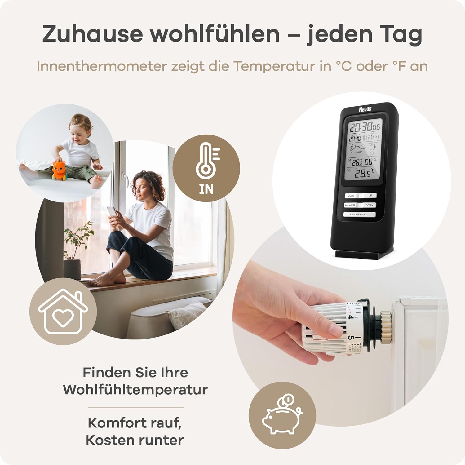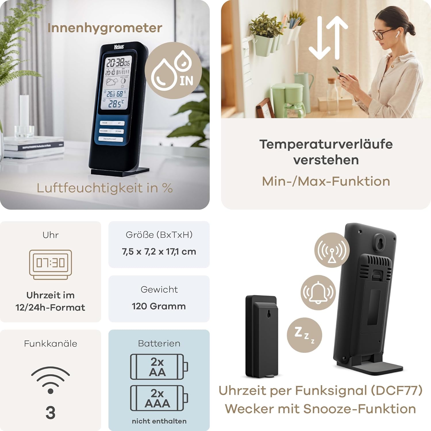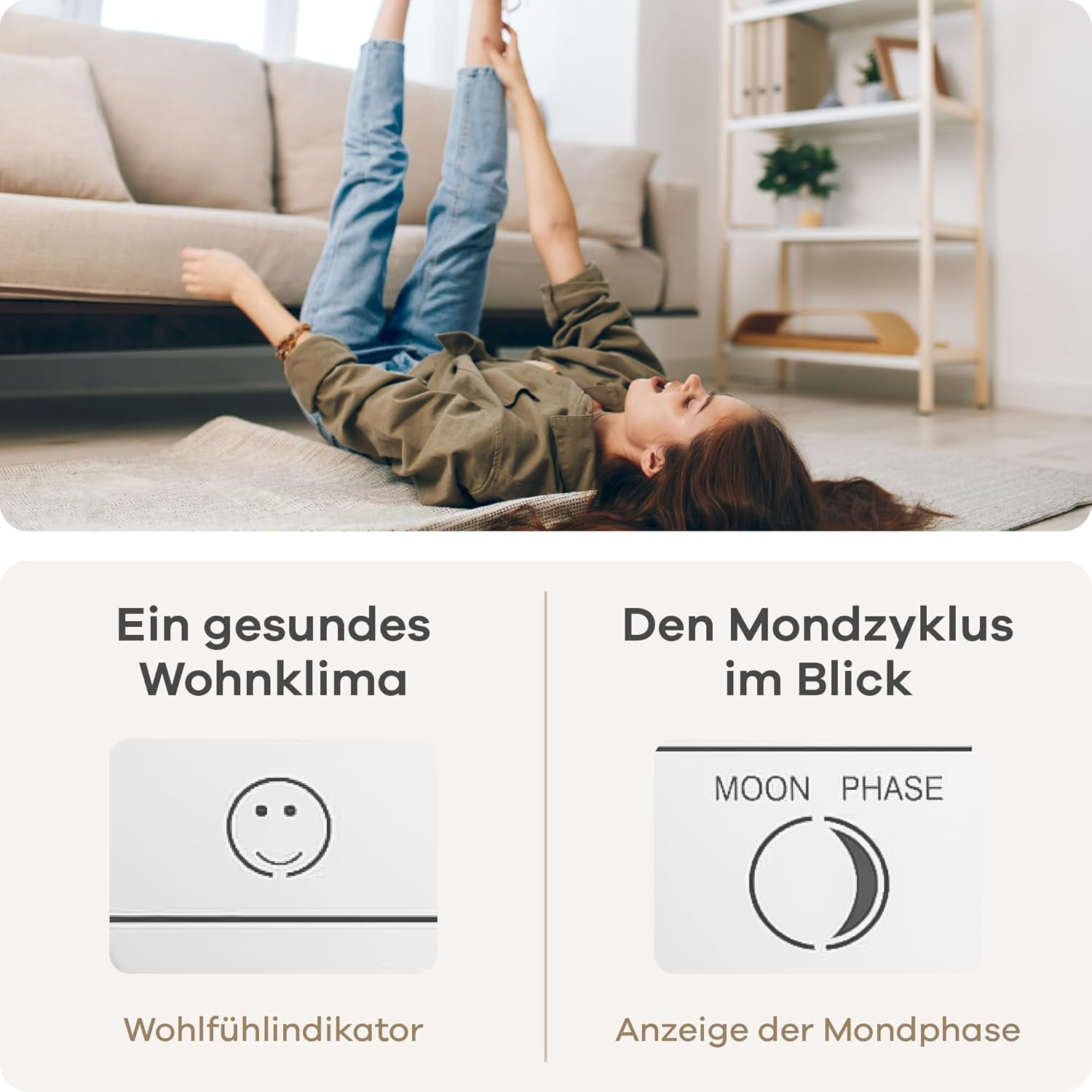 Informații despre acest articol Control radio (DCF 77): Ceasul cu alarmă se setează complet automat la ora corectă, inclusiv ajustarea la ora de vară sau de iarnă. Zona orară poate fi selectată individual Indicator de bunăstare / afișaj de confort: Măsoară și evaluează calitatea climatului din cameră pe baza umidității / temperaturii din cameră și face recomandări pentru optimizare - pentru bunăstare maximă Prognoza meteo: Afișajul arată prognoza meteo curentă pe baza tendinței meteo cu ajutorul pictogramelor Afișajul fazelor lunii: Stația meteo include un calendar lunar care afișează vizual faza actuală a lunii Funcția de alarmă cu repetarea alarmei: Dacă butonul de sus este apăsat în timpul alarmei, sunetul alarmei este întrerupt (snooze). Ceasul de alarmă sună din nou după câteva minute Alte detalii despre produs