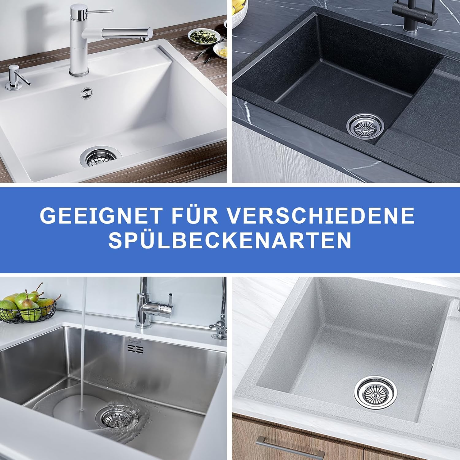 Potrivit pentru diferite chiuvete de bucătărie: Conține 1 știft din oțel inoxidabil (35 mm) pentru chiuvete cu deversare cu dopuri de etanșare și 2 știfturi centrale reglabile (46-56 mm și 67-85 mm) pentru chiuvete cu design excentric. Pentru o instalare flexibilă și stabilă.